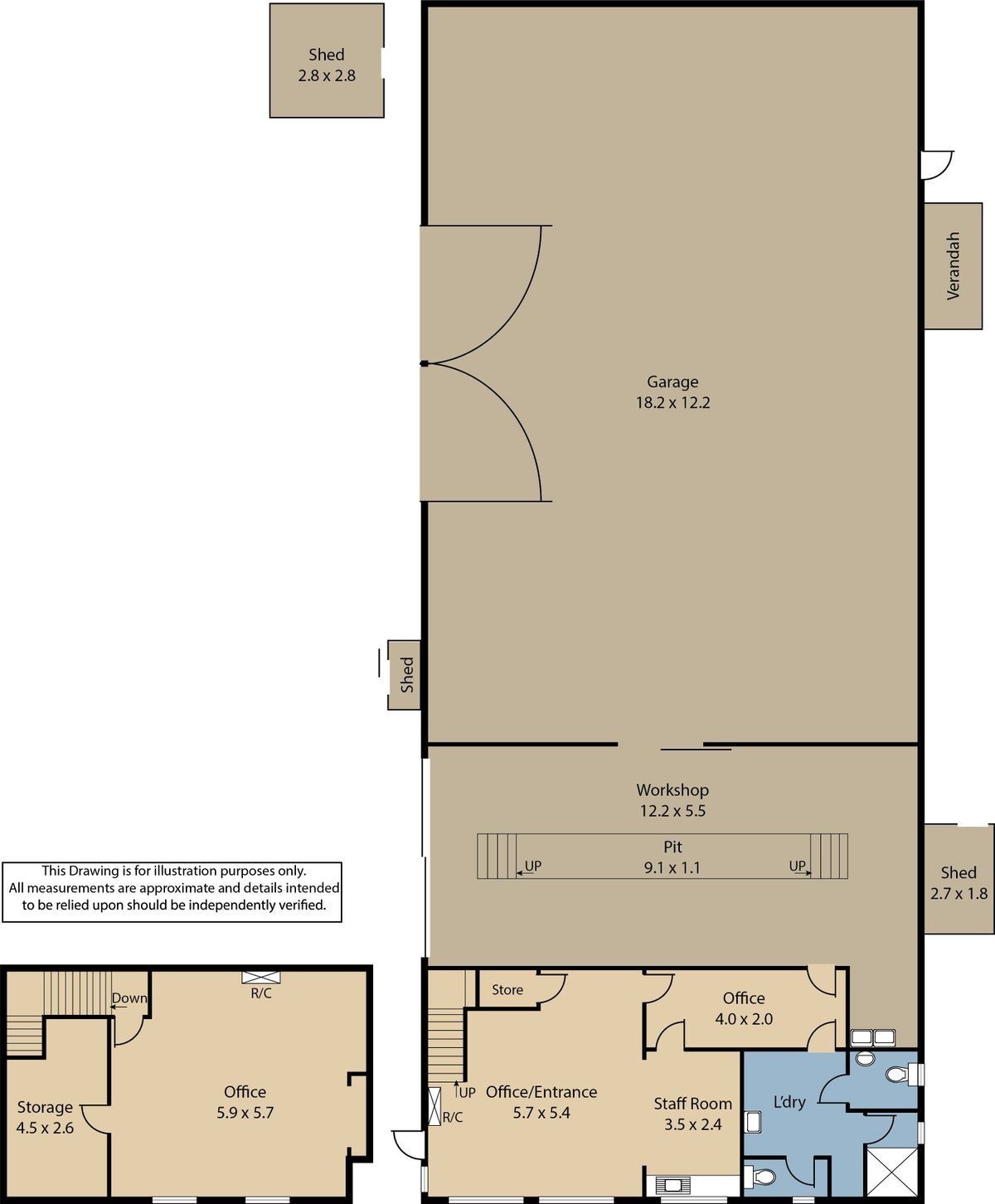 Two story office with reception area, staff room, kitchen facilities, three toilets, shower, laundry, storage and various office spaces.