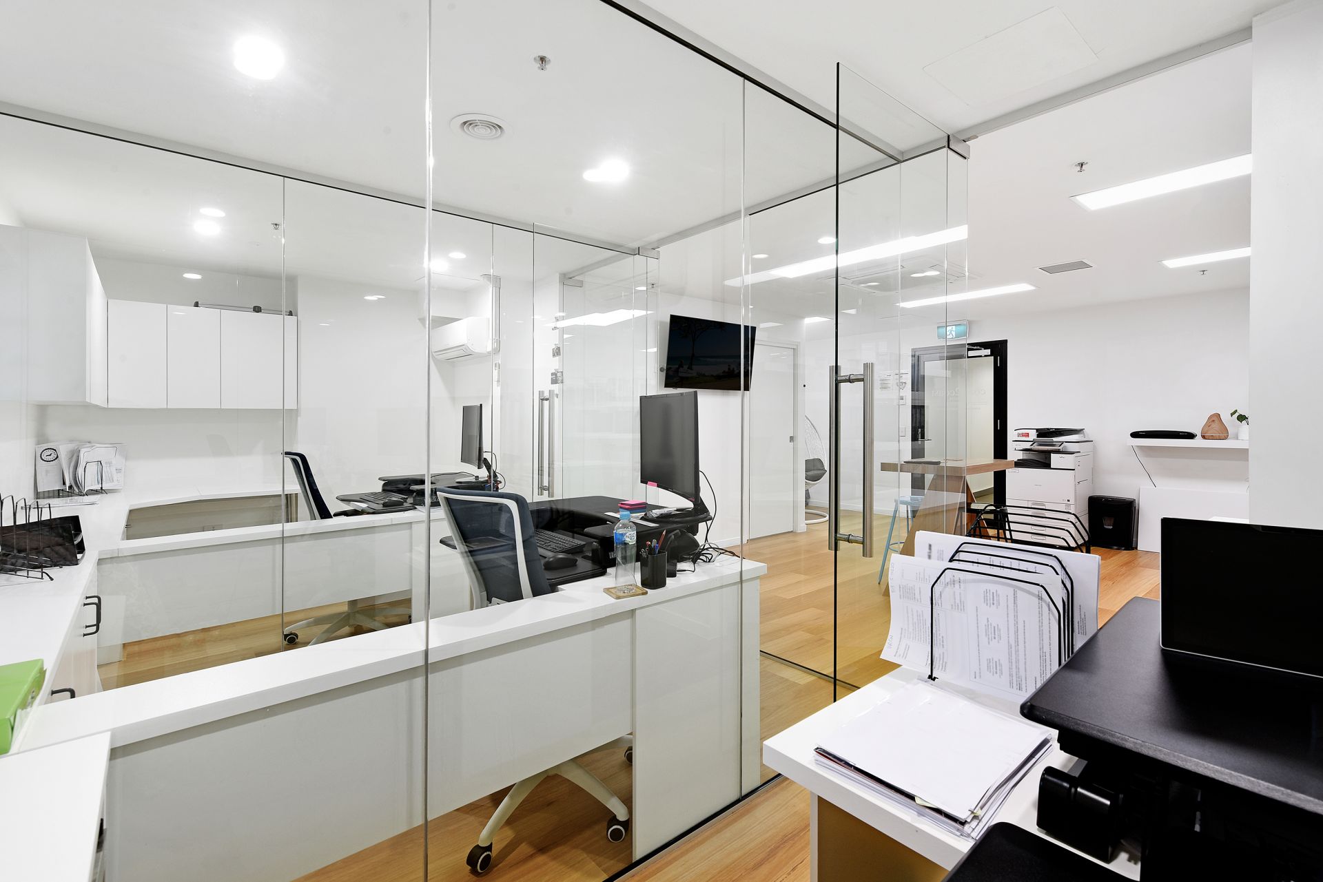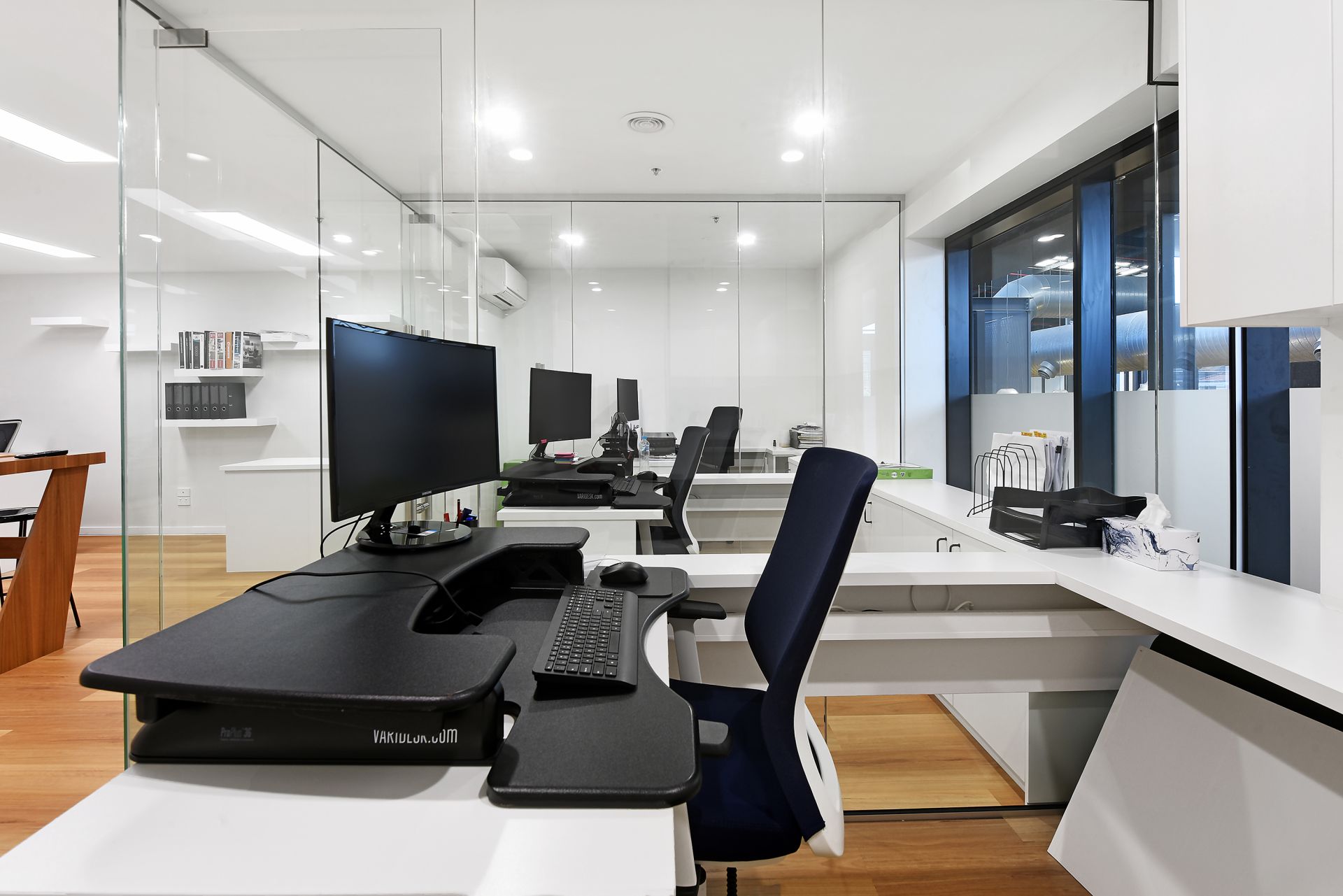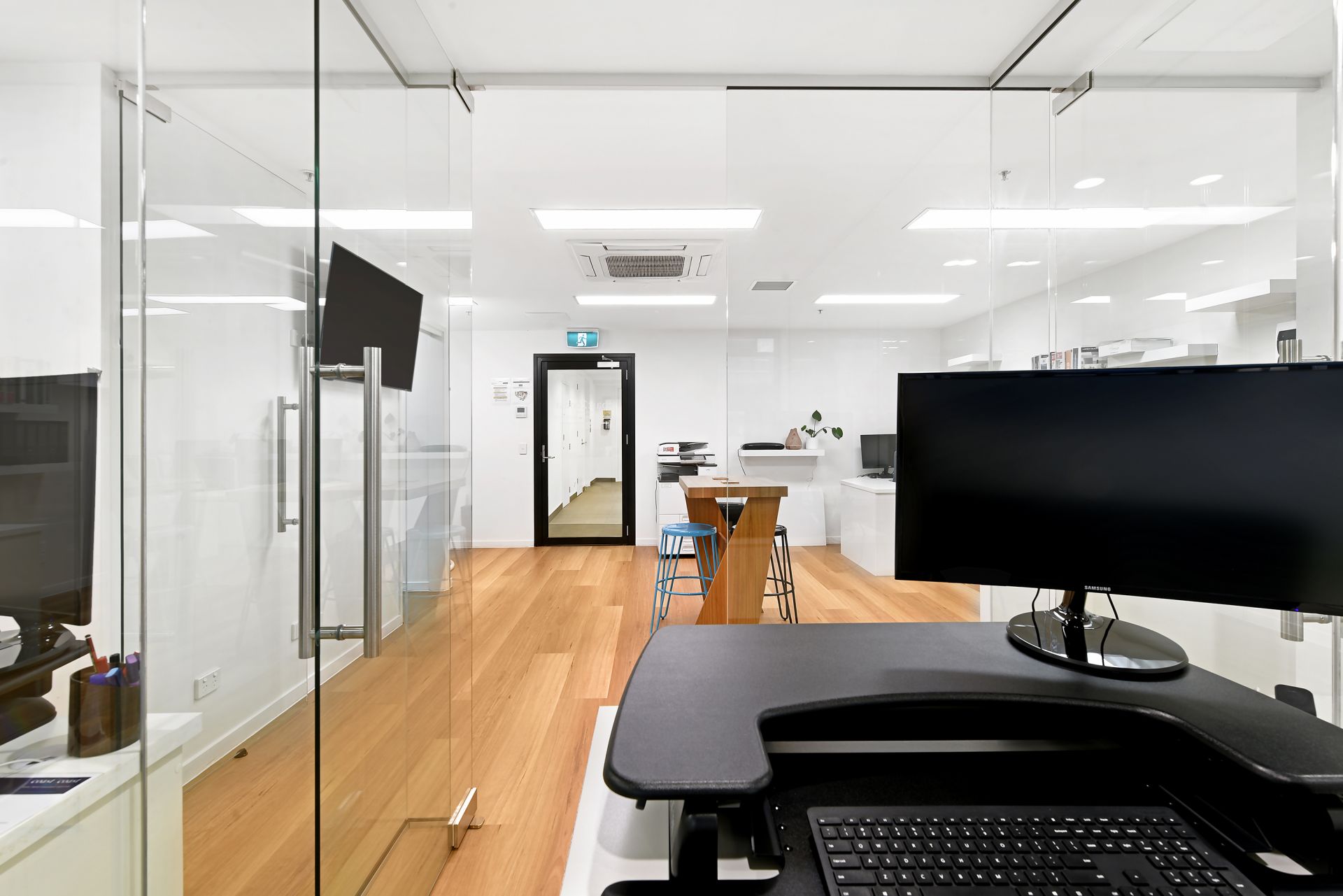 - 3 glass framed office spaces with additional floor space for more
