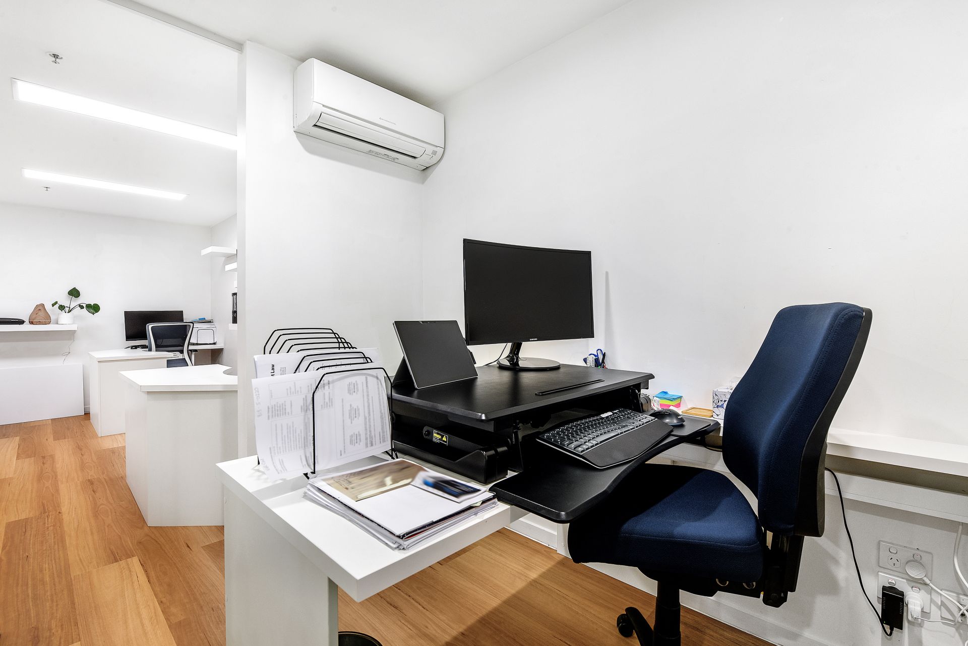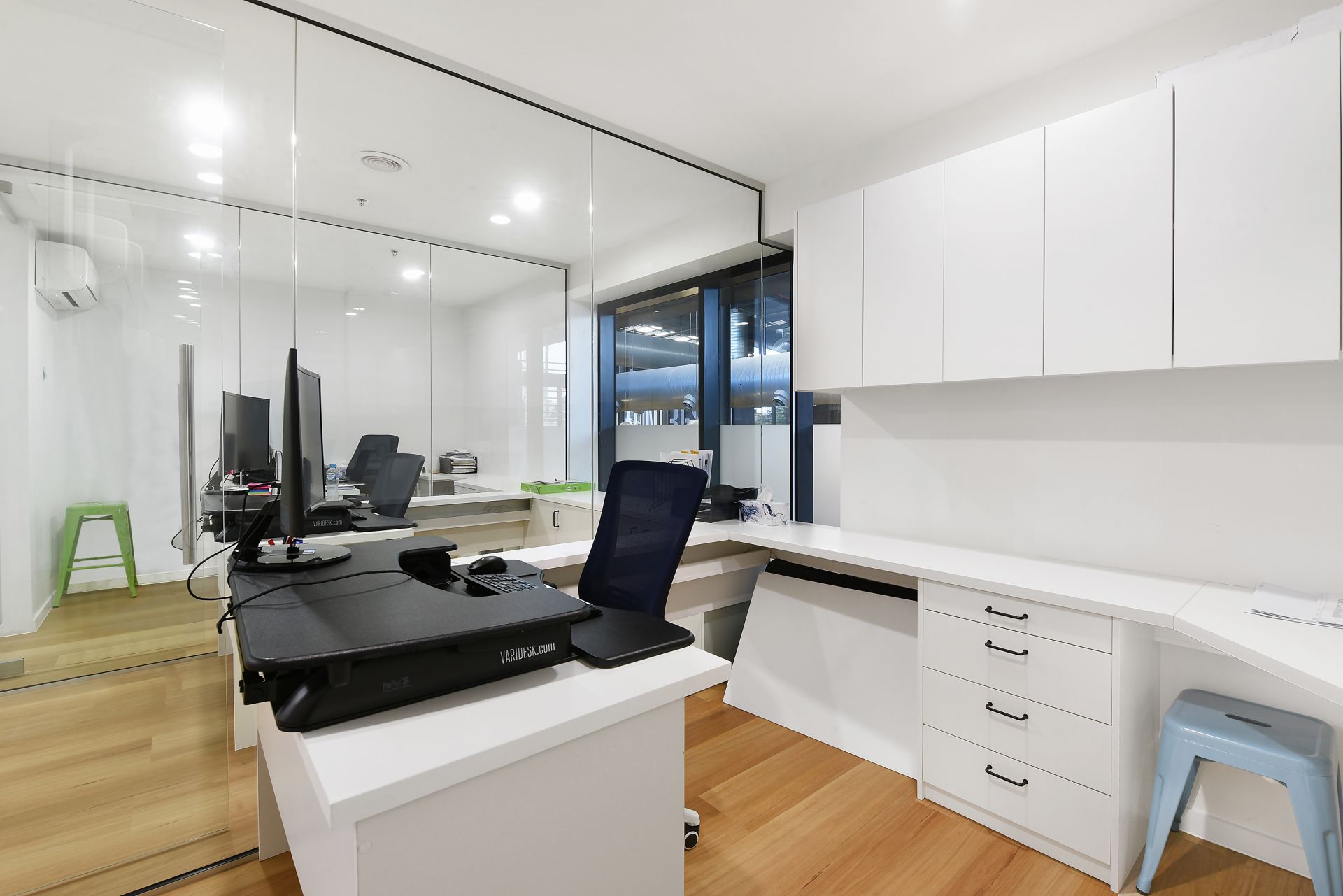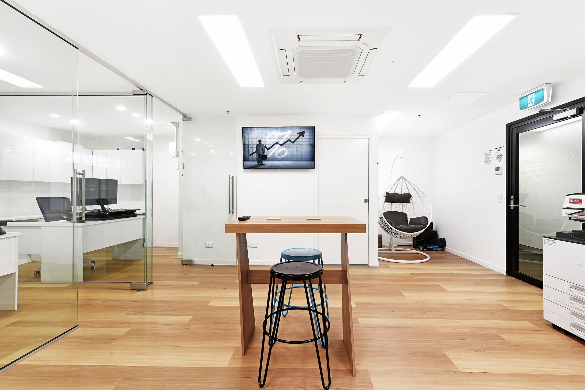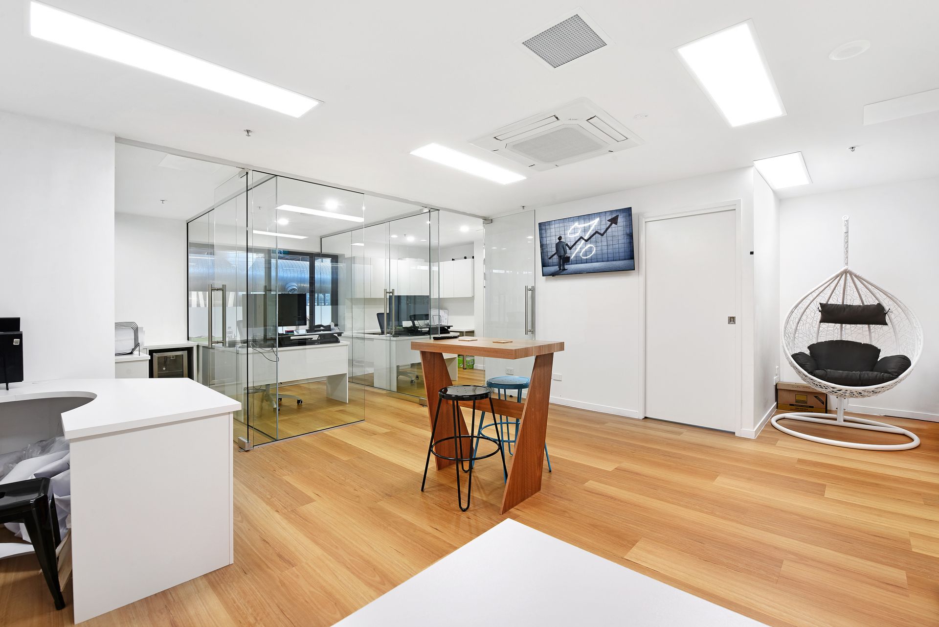 - 3 glass framed office spaces with additional floor space for more