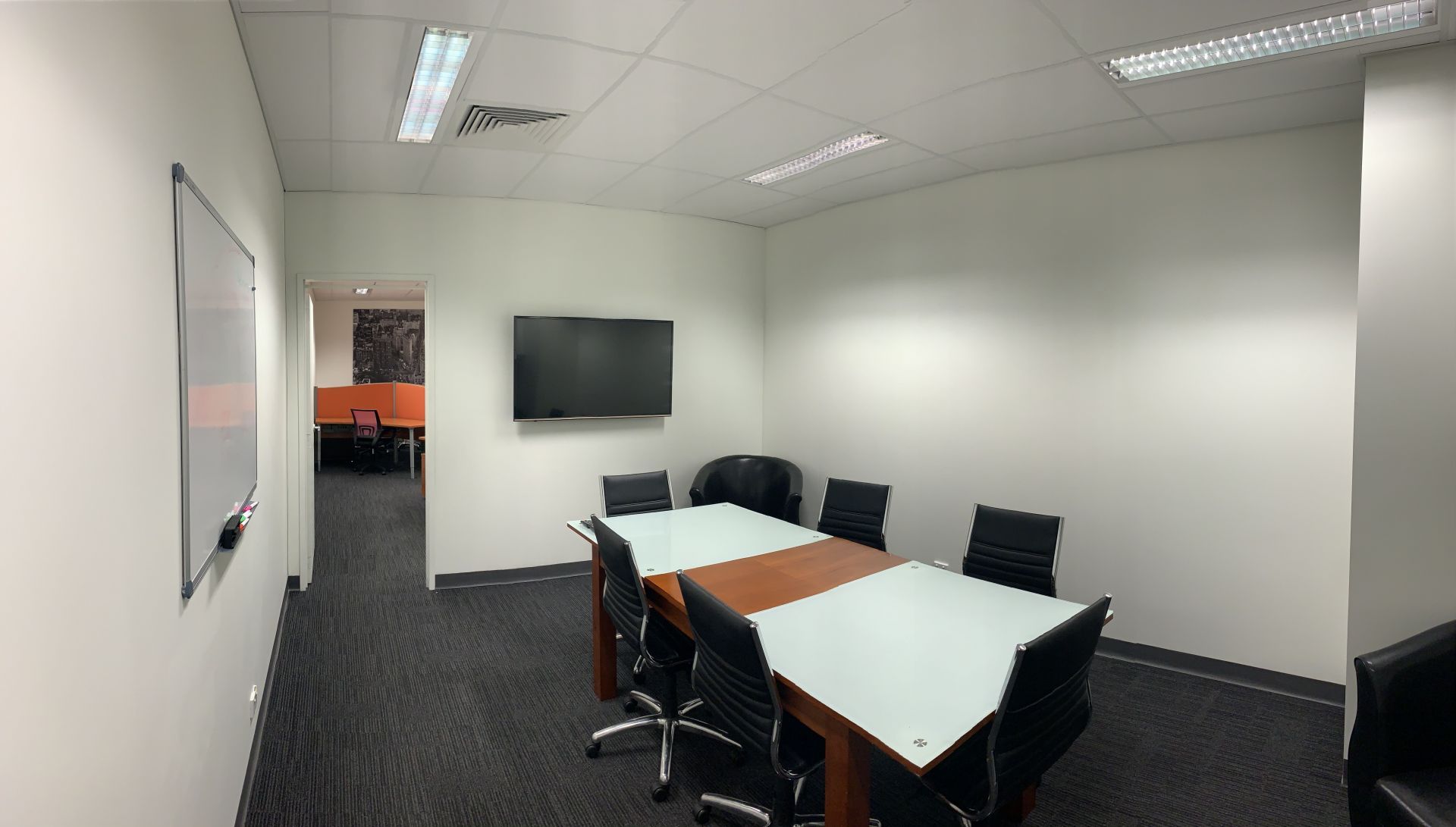 Two Rooms: Back Office with 6 workstations and Front Boardroom.