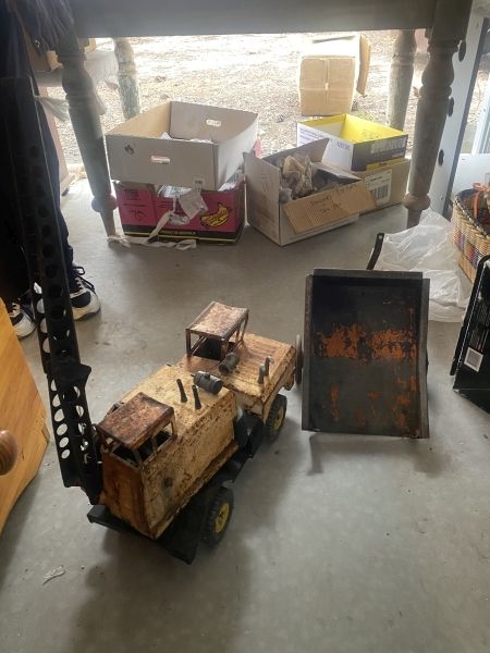 Antiques & Collectables: 1x Large rocking horse, 1x Small rocking horse, Antique cane pram with Baby & blankets, 1x Antique Kitchen table, Merry go round, 2x Antique bedroom chairs, Horse ornaments, Vases, Cameras, Six-20 Brownie’C Camera, Siz-20 Kodak Art Deco Camera, Kodak Instamatic M2 Movie camera, Super 8 projector, Tiguvon No.1 Camera, Photo frames, Hanimex Loadmatic Movie Camera, Antique magazines, Golden books and comics , Wall mirrors , Tonka toys, Vintage approx. 1950’s Tin Toys including Airplane, Tank, Train and Tractor, 3-wheel trike, John Deere toys, Kerosene lights and irons, Stereoviewer, Crochet doyly’s, Assorted old records, Assorted antique crockery, Carlton Ware, Bone China, Pre 1930 dinner set, Pictures of Royal Albert, Sheep shears, Cream cans, Aviator Goggles, tins, Queen Elizabeth tin, Prince Charles and Lady Diana Commemorate Marriage Cup, Mantle clock, Felt cowboy hats, As new pony saddle.