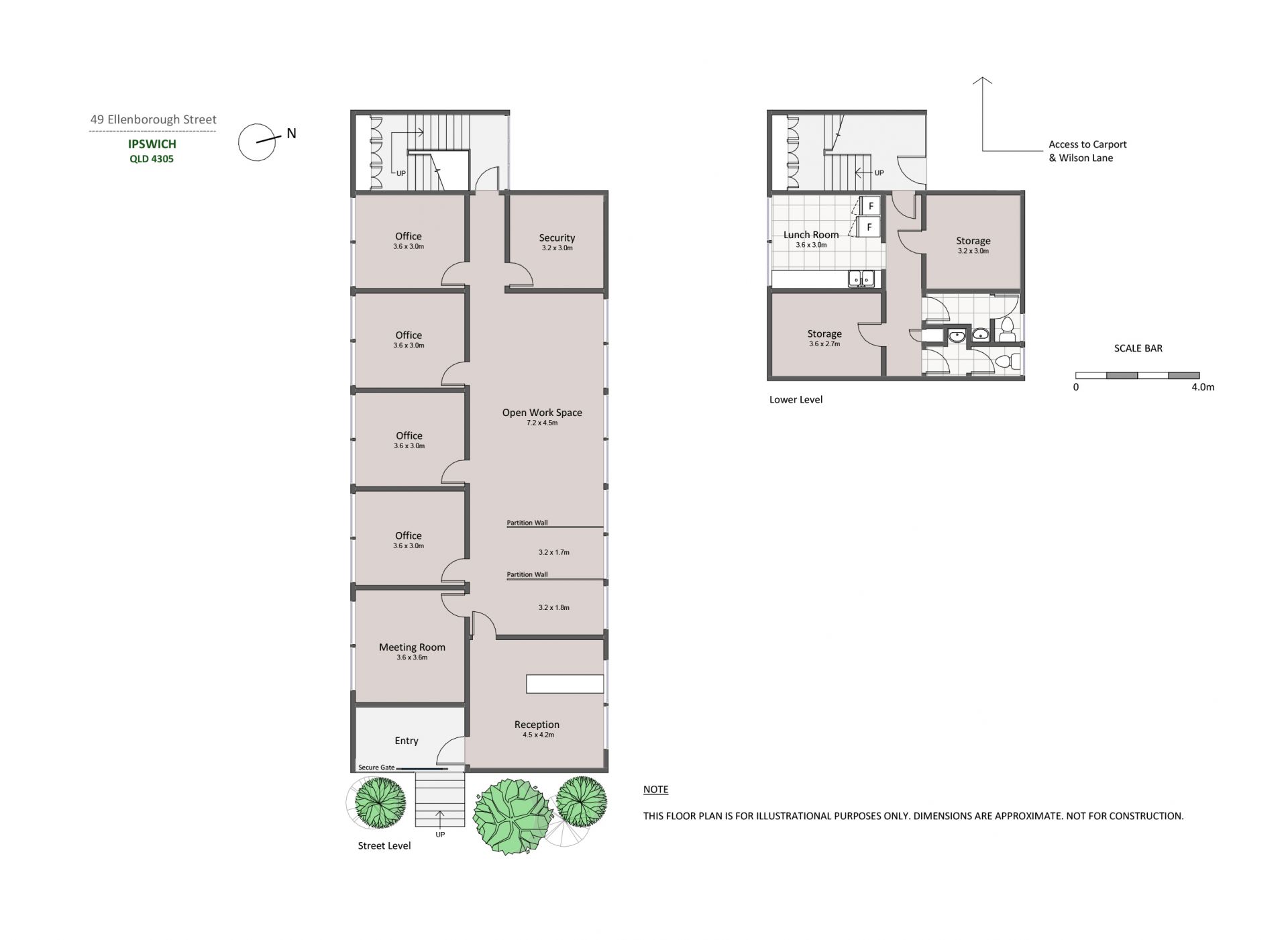 • LEVEL 1 - Reception and visitor waiting area, interview room, 3 offices, 4th office / conference room and document safe