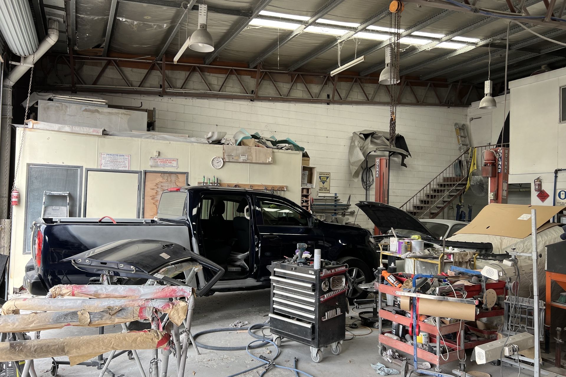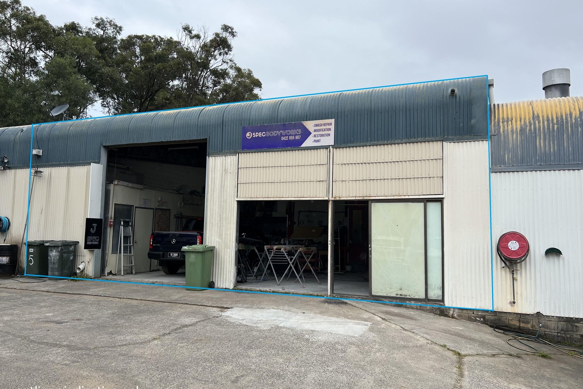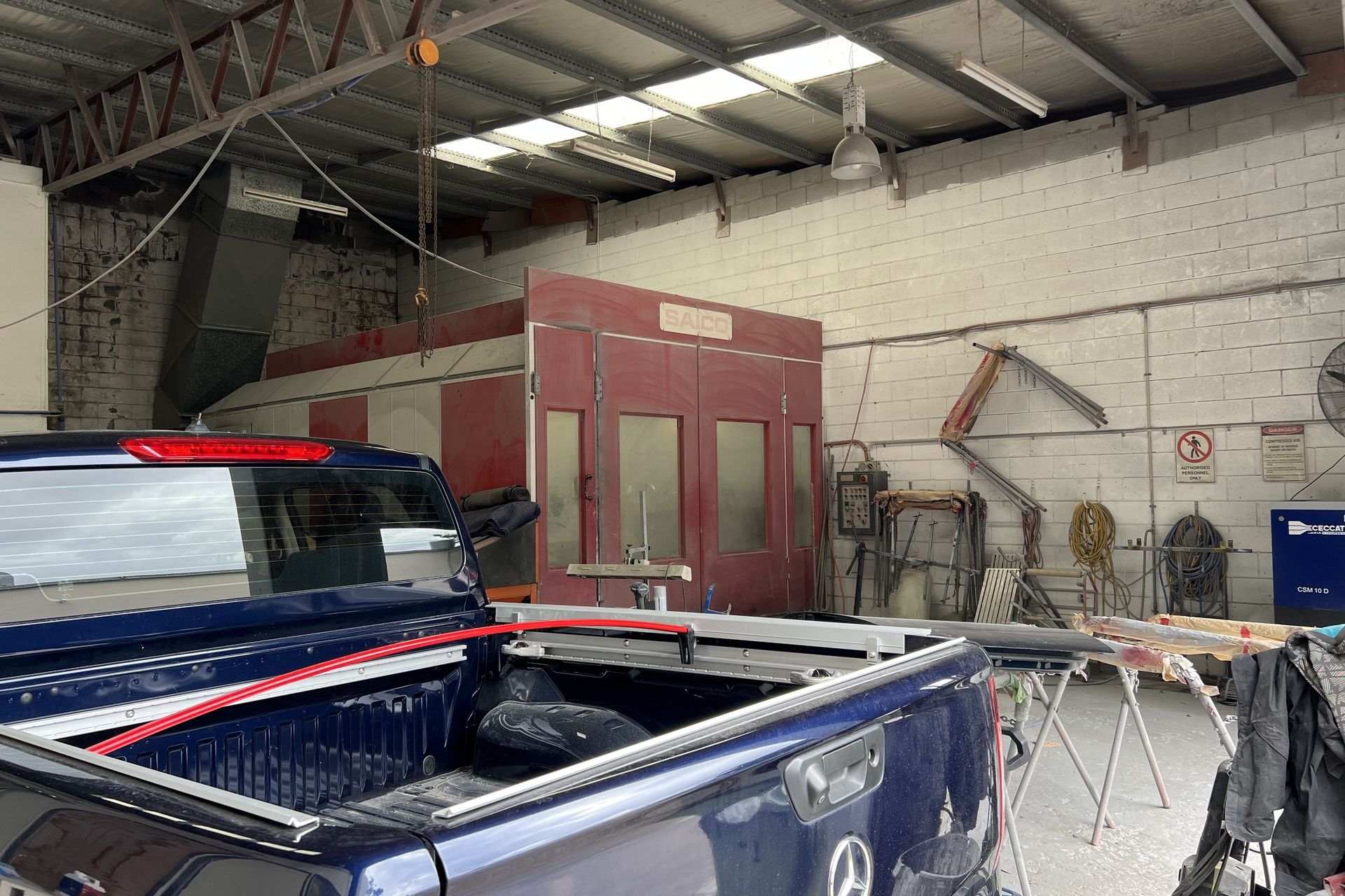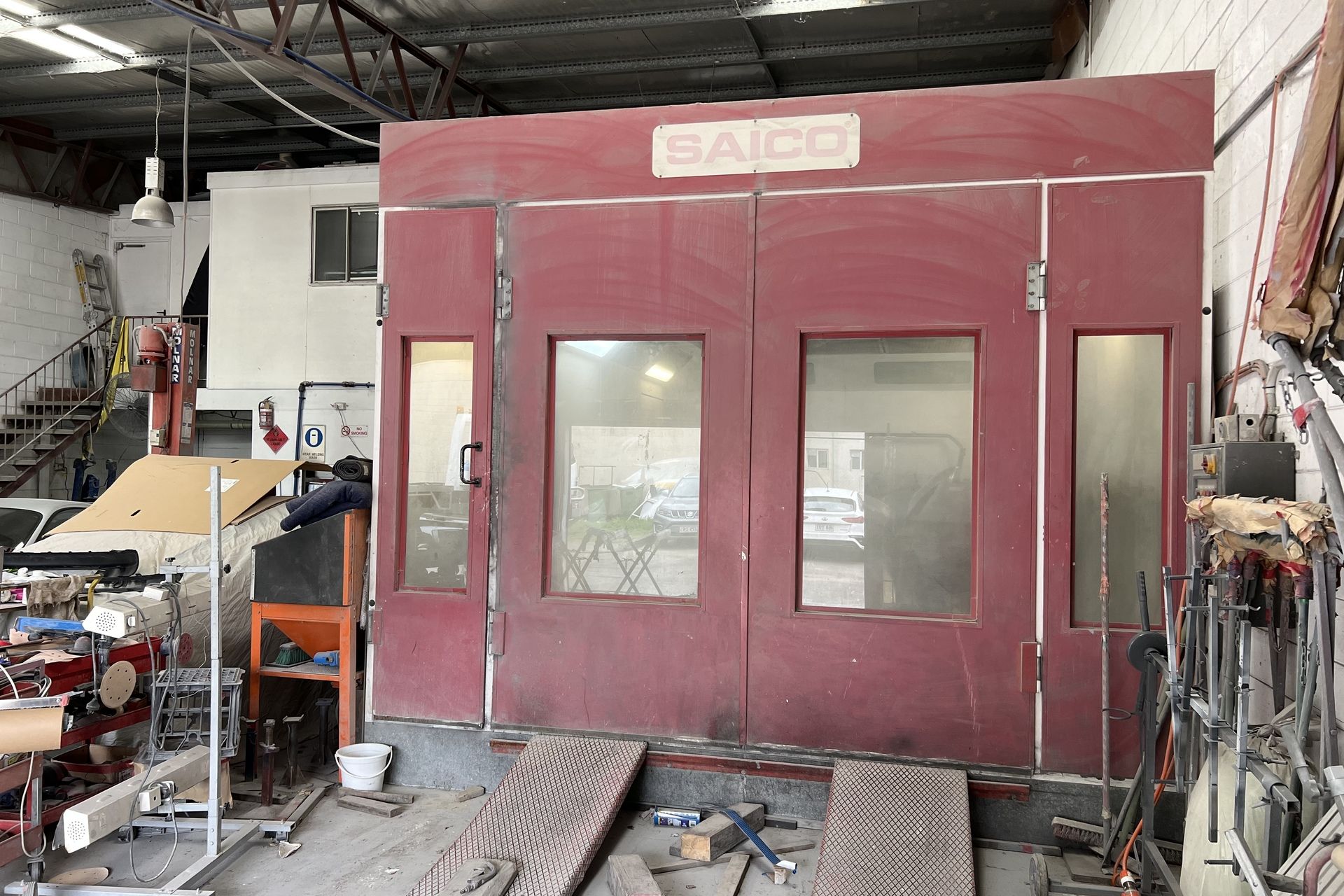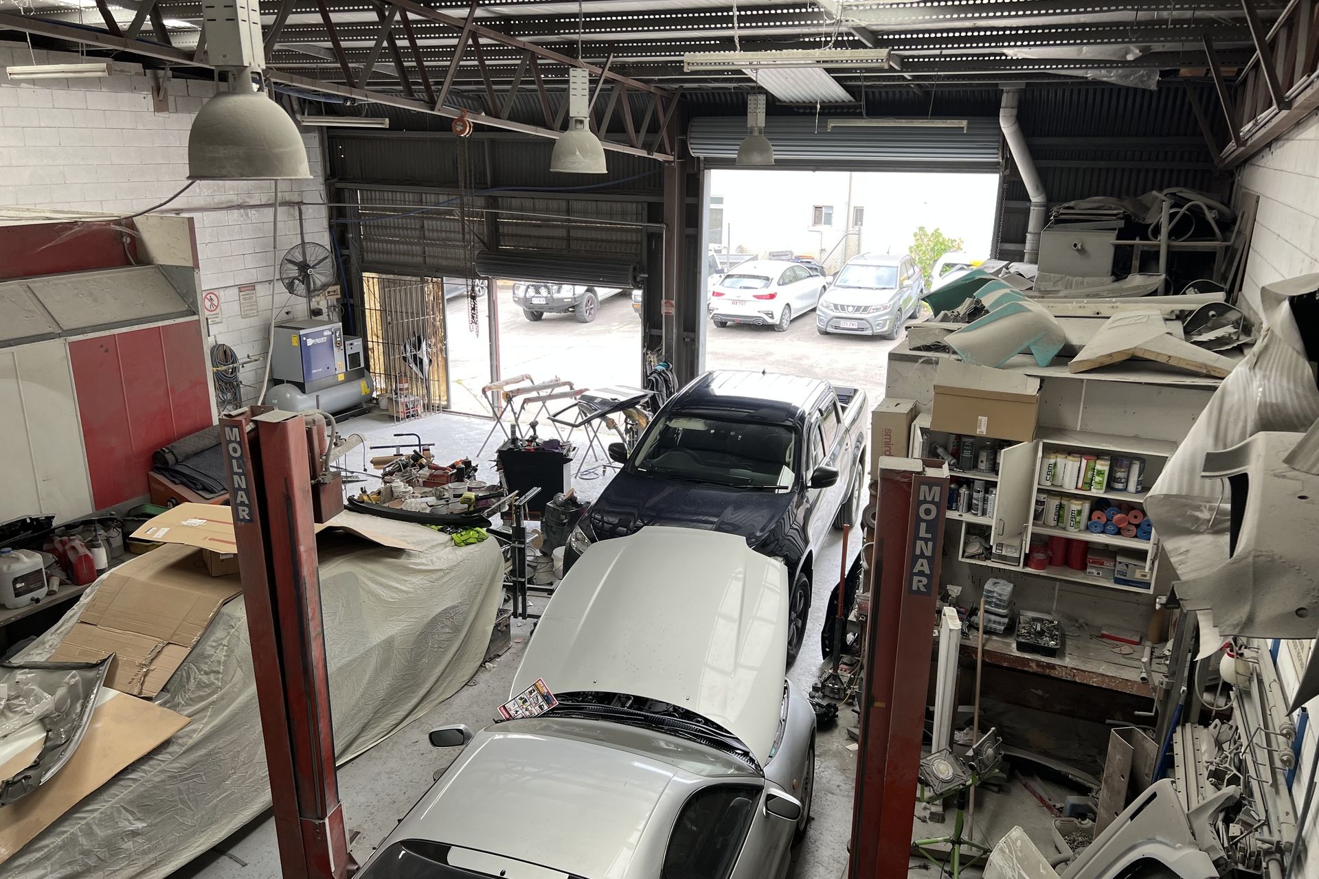 - Open plan style with built in spray booth, hydraulic lift, compressors and other major equipment