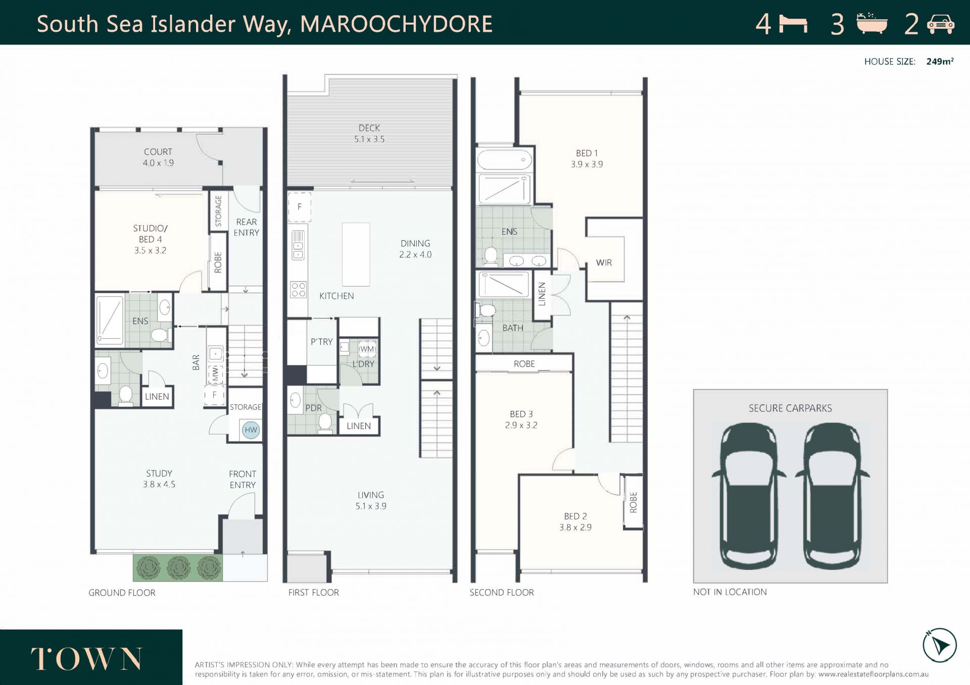Across three levels with genuine ground floor entry and branding exposure for a home business; it comprises four bedrooms, three fully tiled bathrooms, home office with powder room and kitchenette (ground floor), separate living areas, high-end kitchen, north-east facing private courtyard and upper deck, separate laundry, and secure two side-by-side covered carparks.