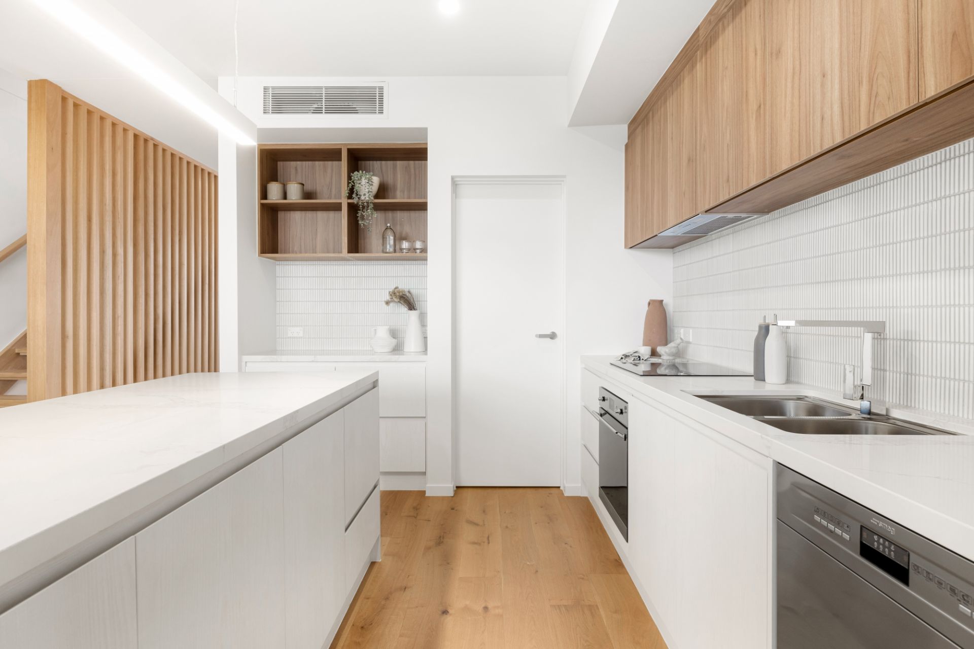 Premium finishes and fixtures/fittings are showcased throughout including high ceilings, floating timber floors and timber-look tiles, ducted slimline air-conditioning, ceiling fans, 40mm stone benches in kitchen, Smeg appliances including induction cooktop, luxury standalone bathtub and dual vanities in master ensuite, LED lighting, and generous storage including under-stair.