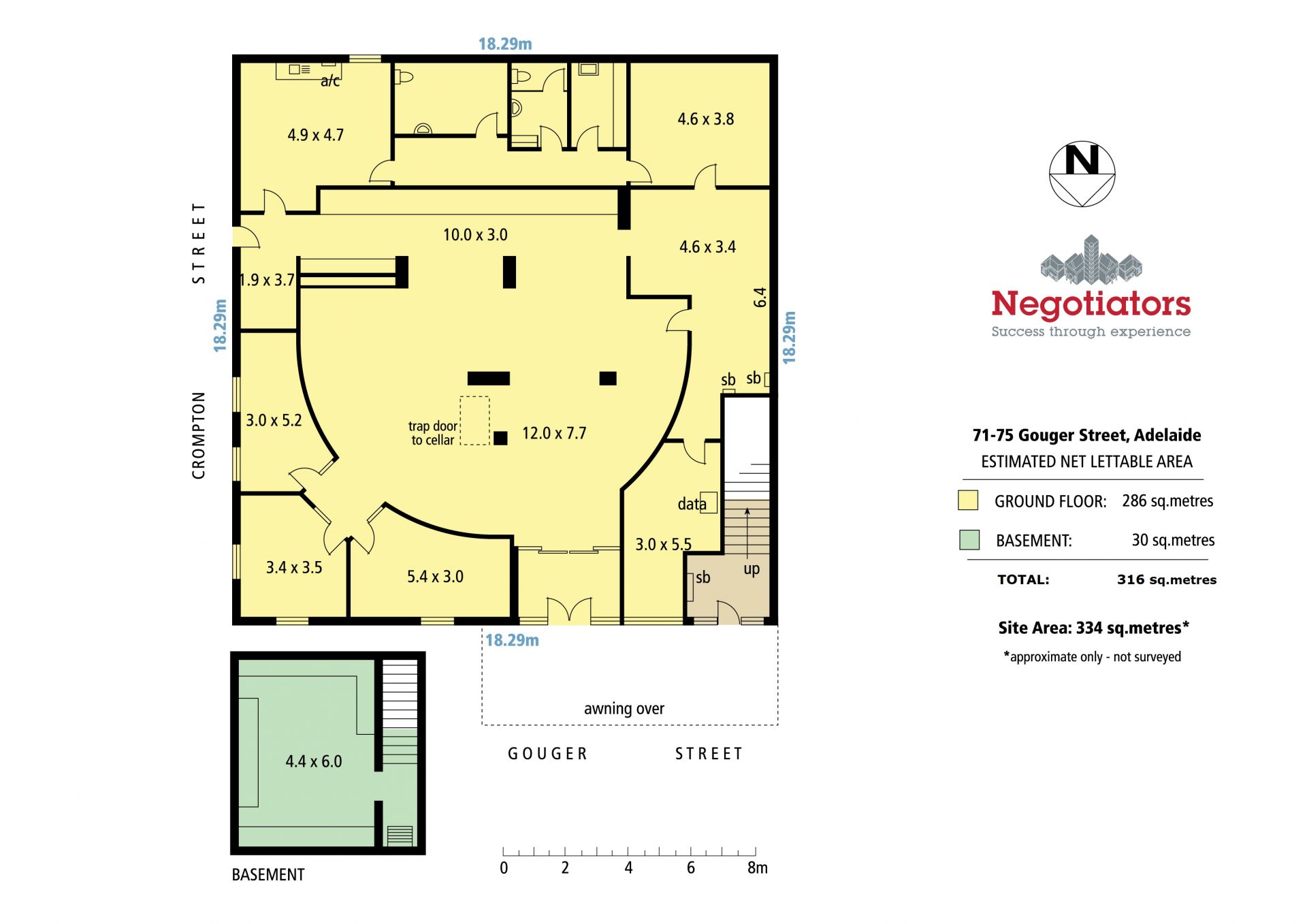 As presently configured ground level has a net area of about 316 sqm, is fully self contained with dedicated mechanical/air conditioning plant, toilet amenities and kitchenette, and a secure basement level is included.