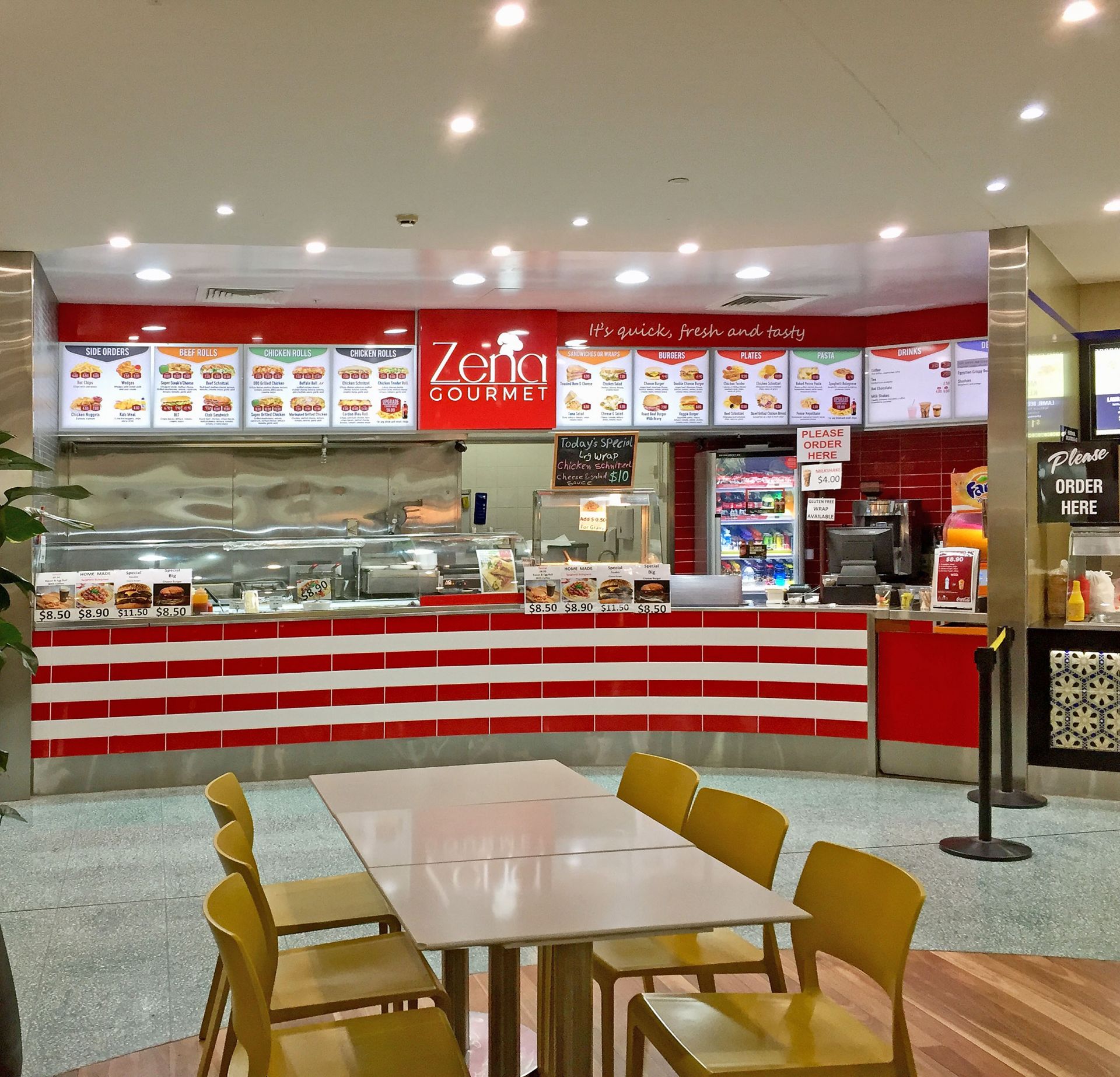 Offering American Style Burgers, Sandwiches, Salads, Coffee, Juices & Shakes with all meals freshly made/cooked to order. Zena Gourmet offers good food deals, enjoys a great position in the bright, clean food court of Port Macquarie's major shopping/entertainment precinct of Settlement City.