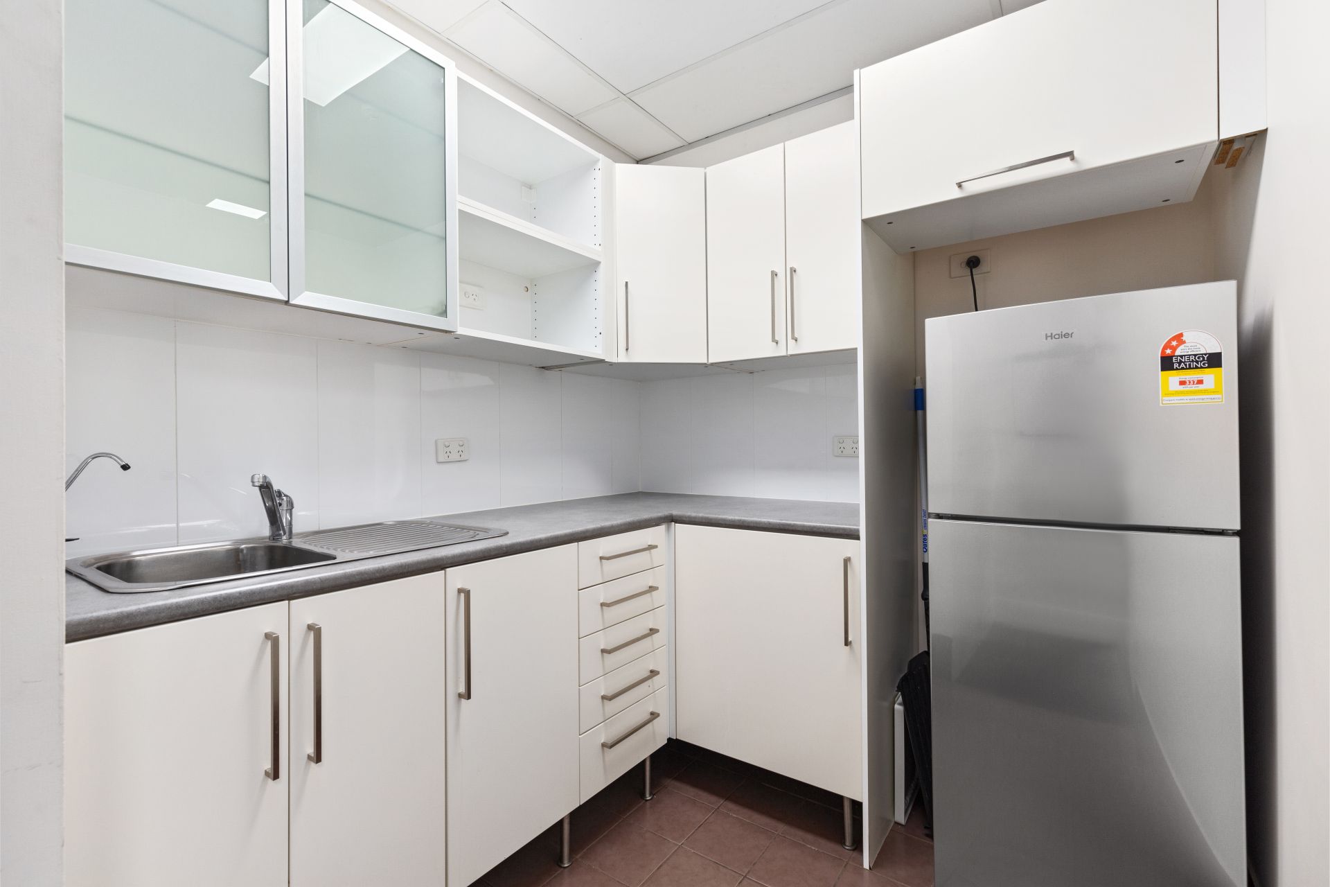 - Modern kitchen with cupboards & fridge