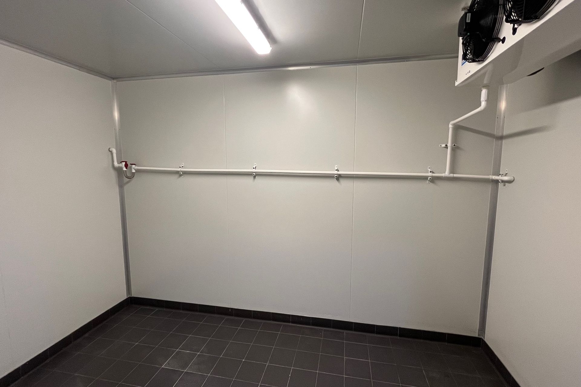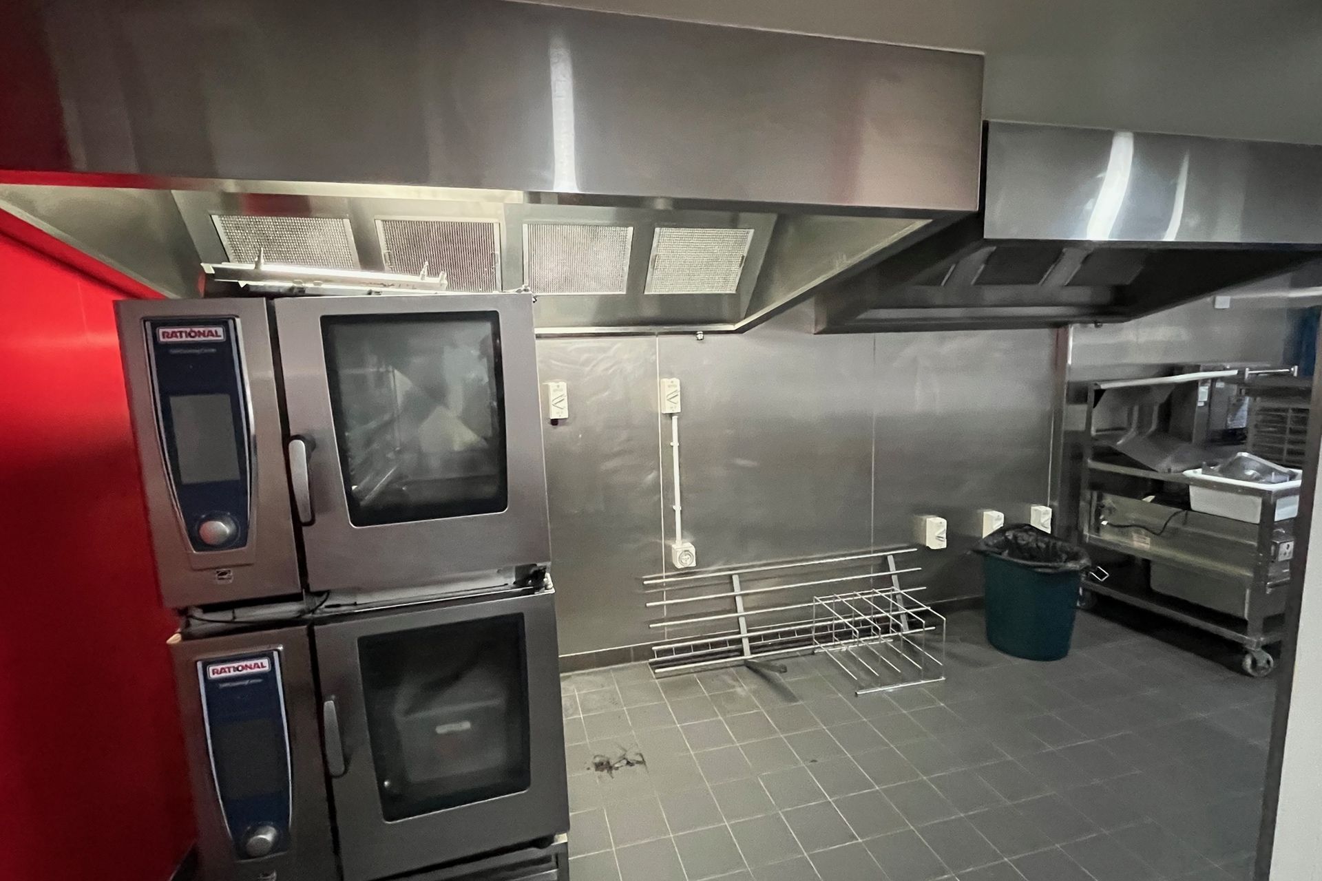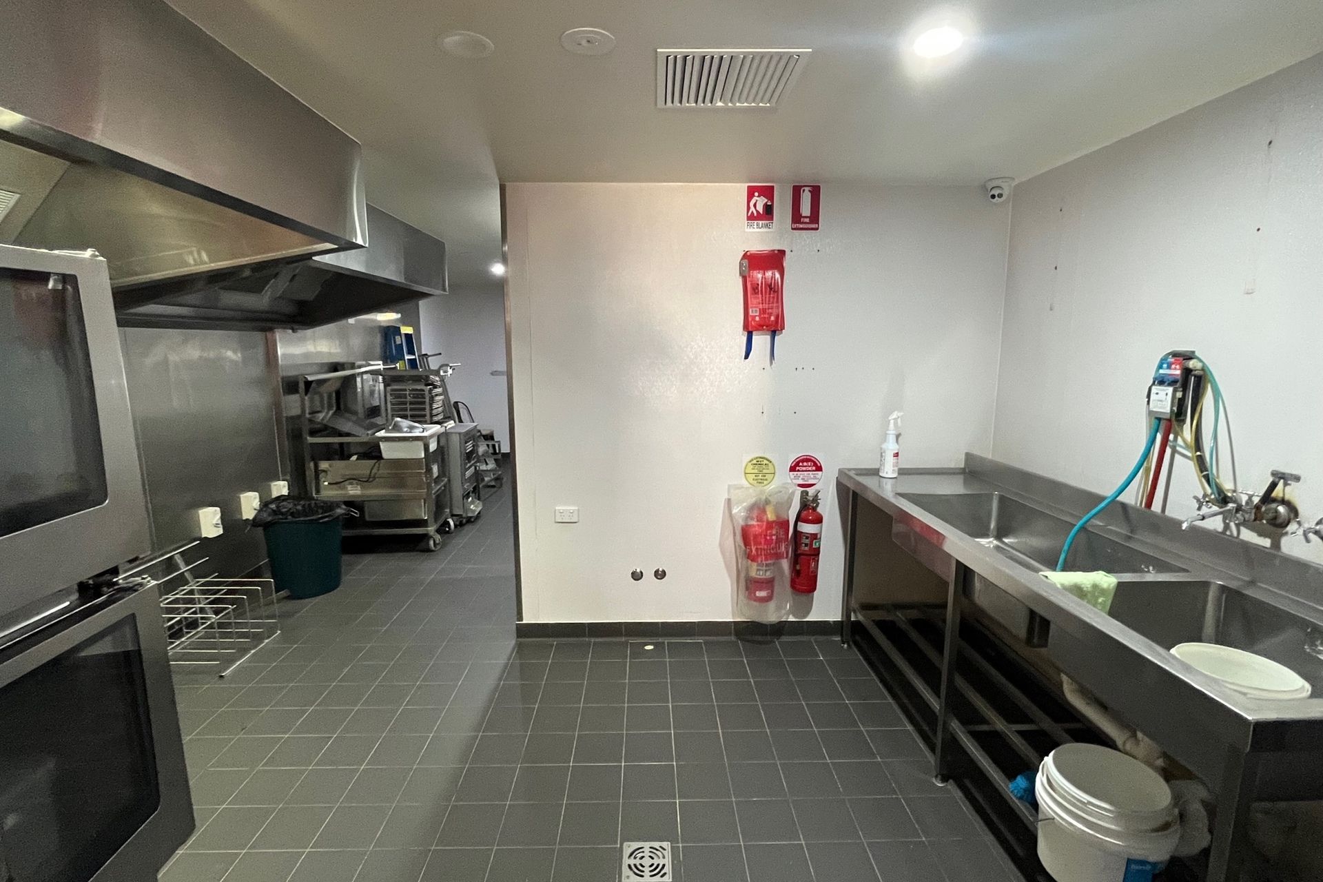 Walk-in cool room and freezer, two commercial stainless steel range hoods, with other equipment optional.