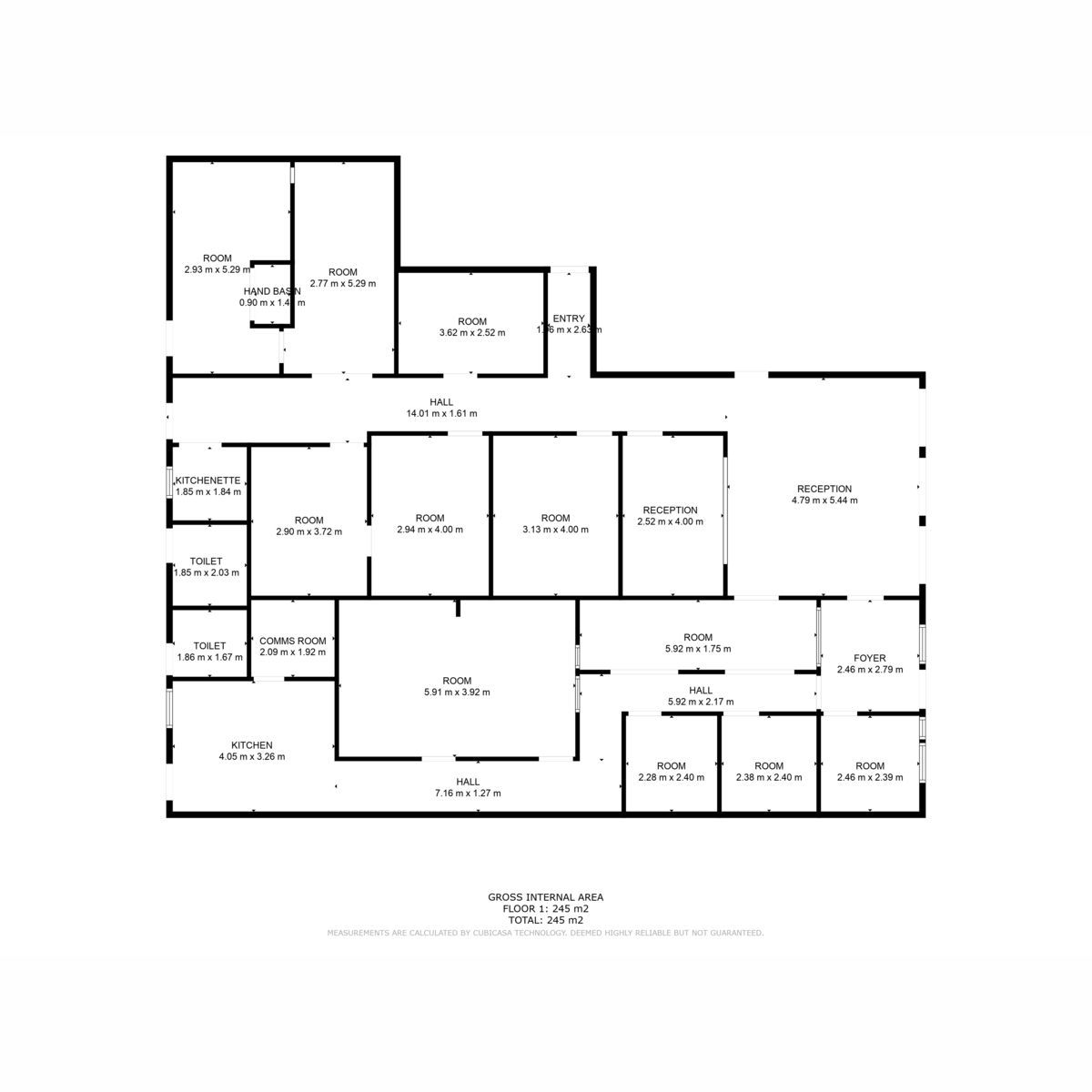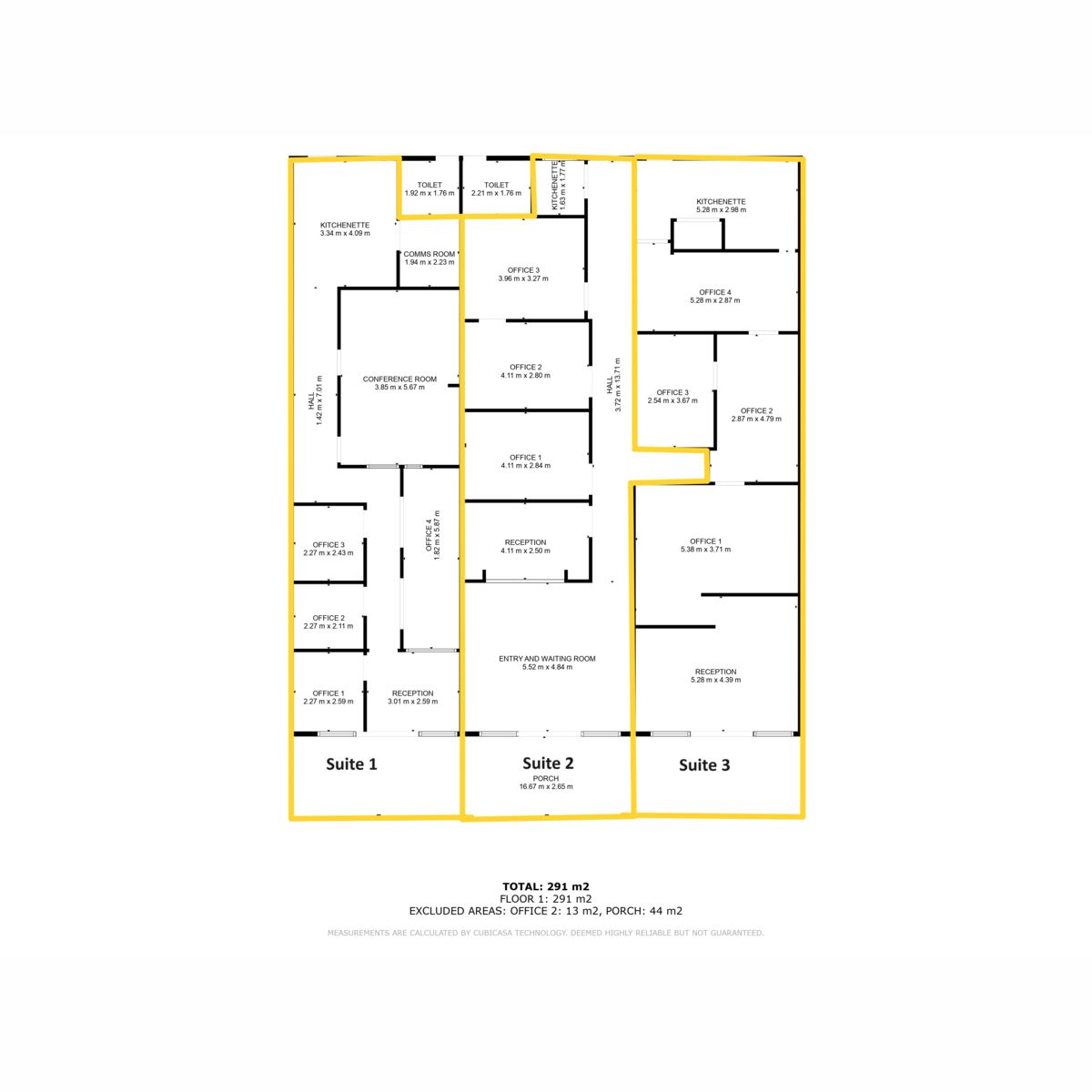 This commercial building measures approximately 340 square meters in total. There are 3 separate suites within the complex. Each approximately 14.3m x 5.5m in size, set up with multiple office spaces within, including reception areas and individual private offices. Each of the 3 large spaces has a kitchenette and access to the 2 rear toilets via their own rear door exit.