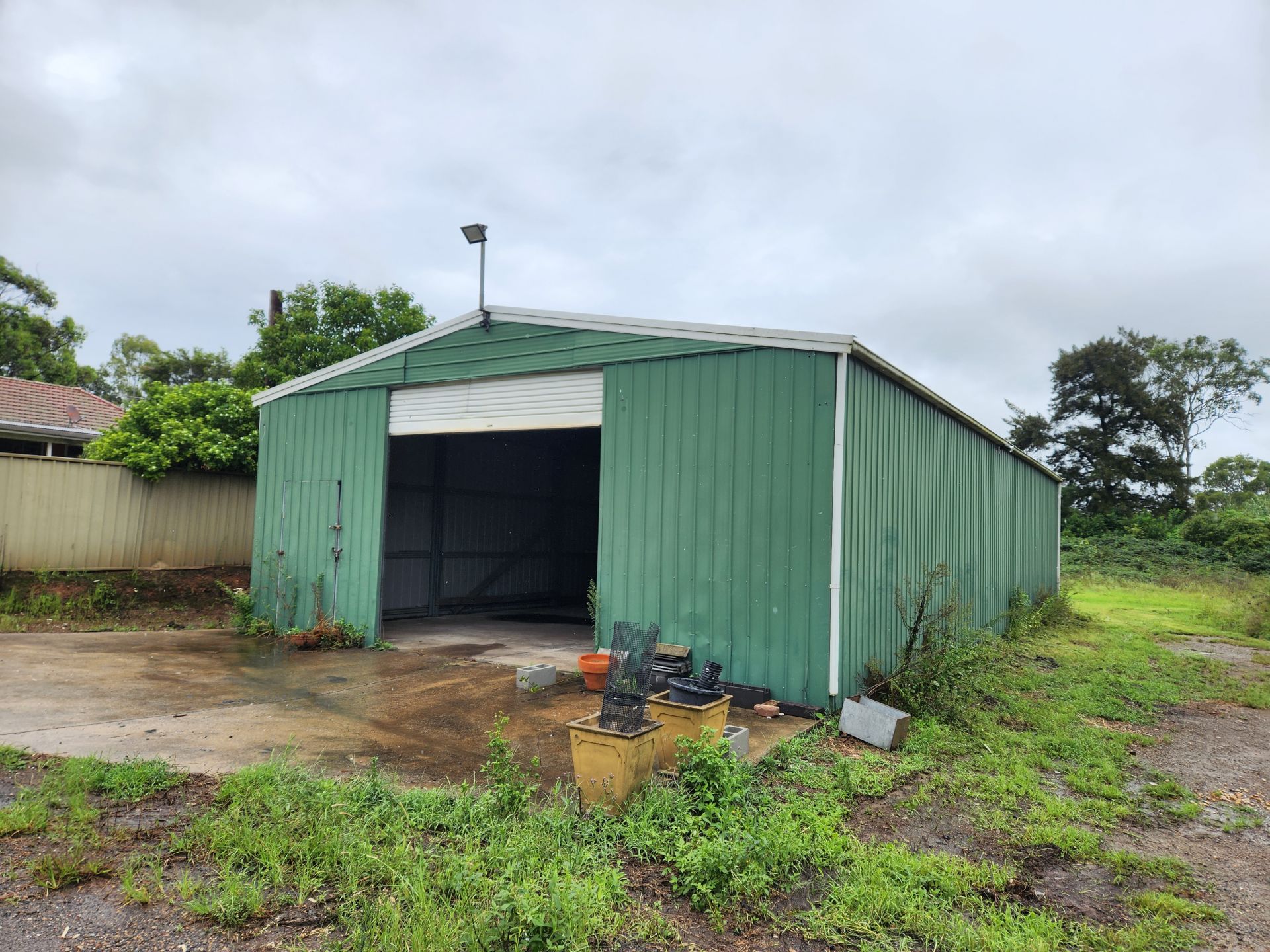 Colorbond shed of approx 200m2, with approx 4m height at the peak. One (1) roller door at front, pedestrian door at front and rear. 3 phase power. Ideal workshop for tradesperson or for someone wanting small storage facilities.