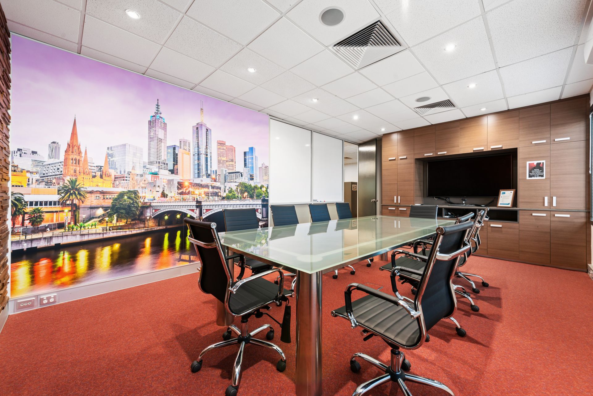 * Modern conference room includes board table and fridge/sink built in to cabinetry.