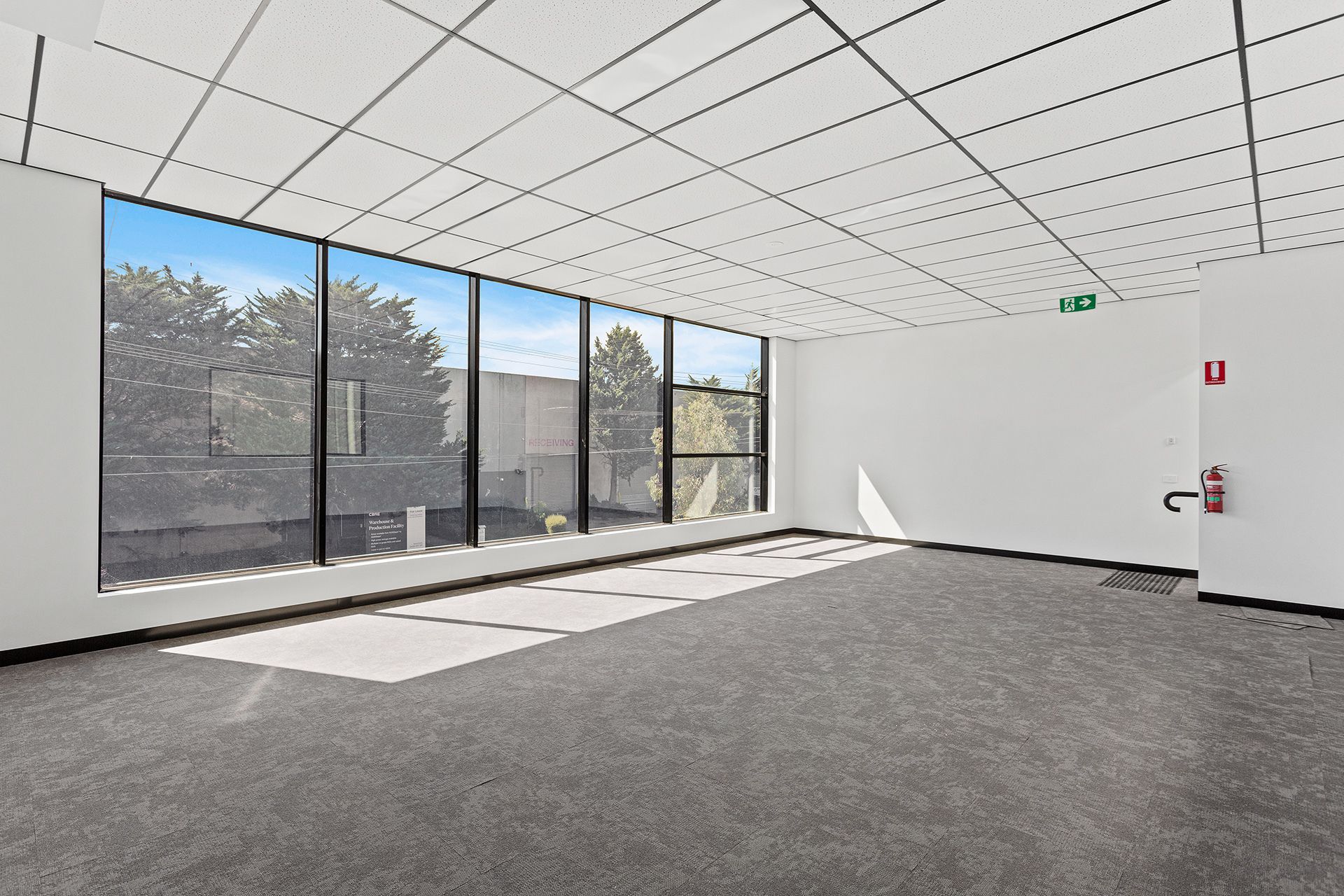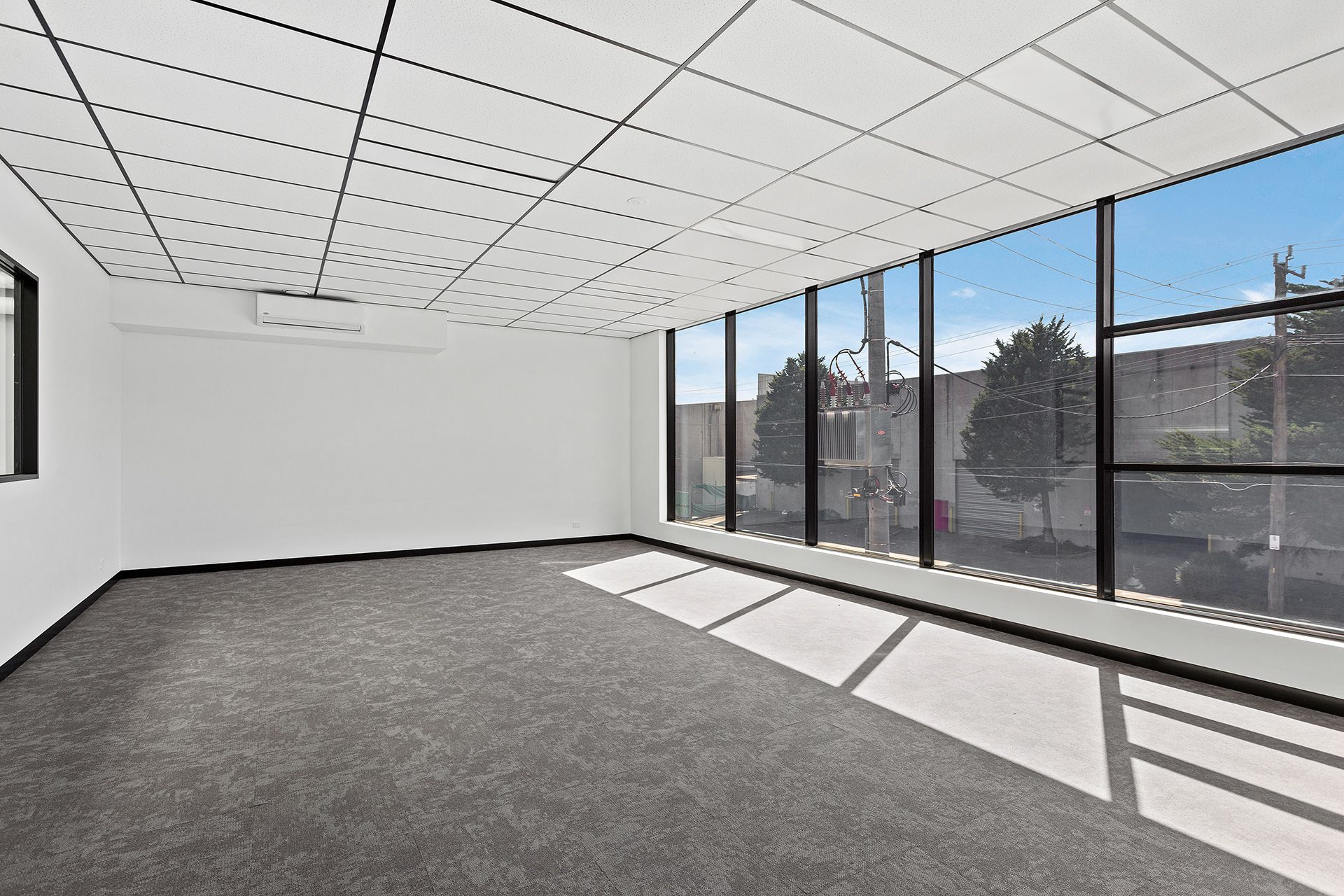 * Office space equipped with split system air conditioning and heating, plastered walls, commercial-grade carpet tiles, and white acoustic suspended ceiling tiles with a black feature ceiling grid.