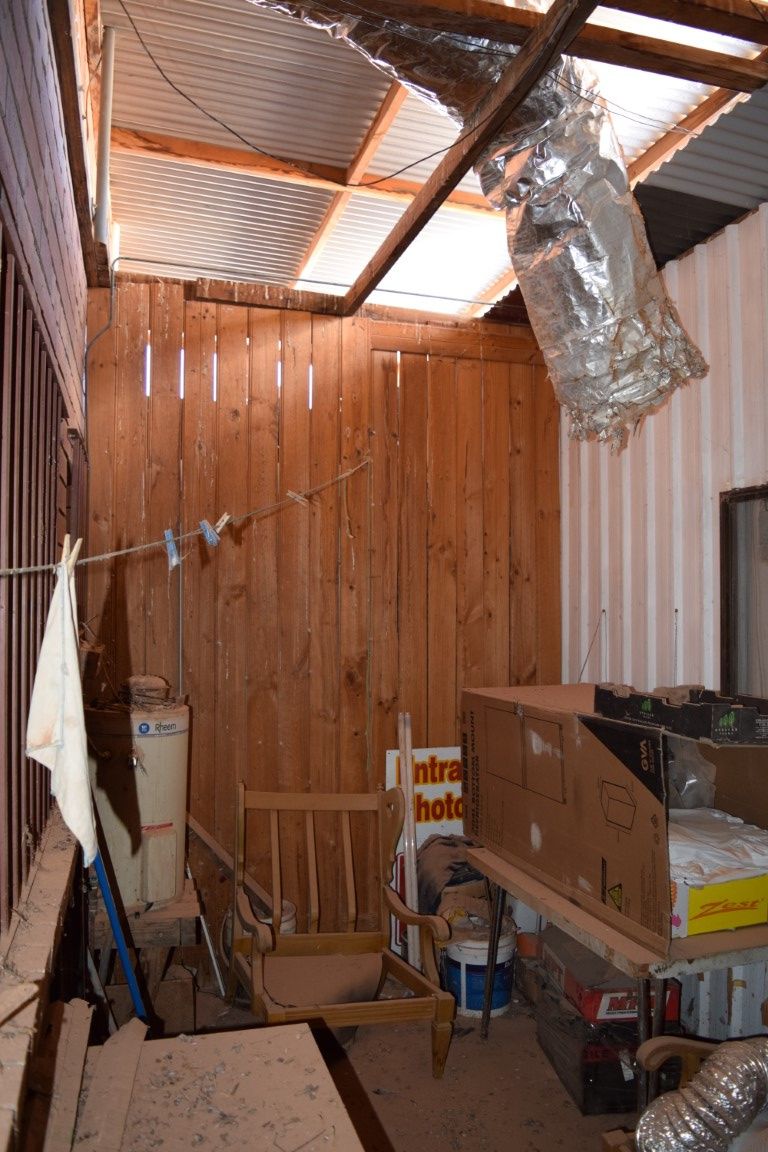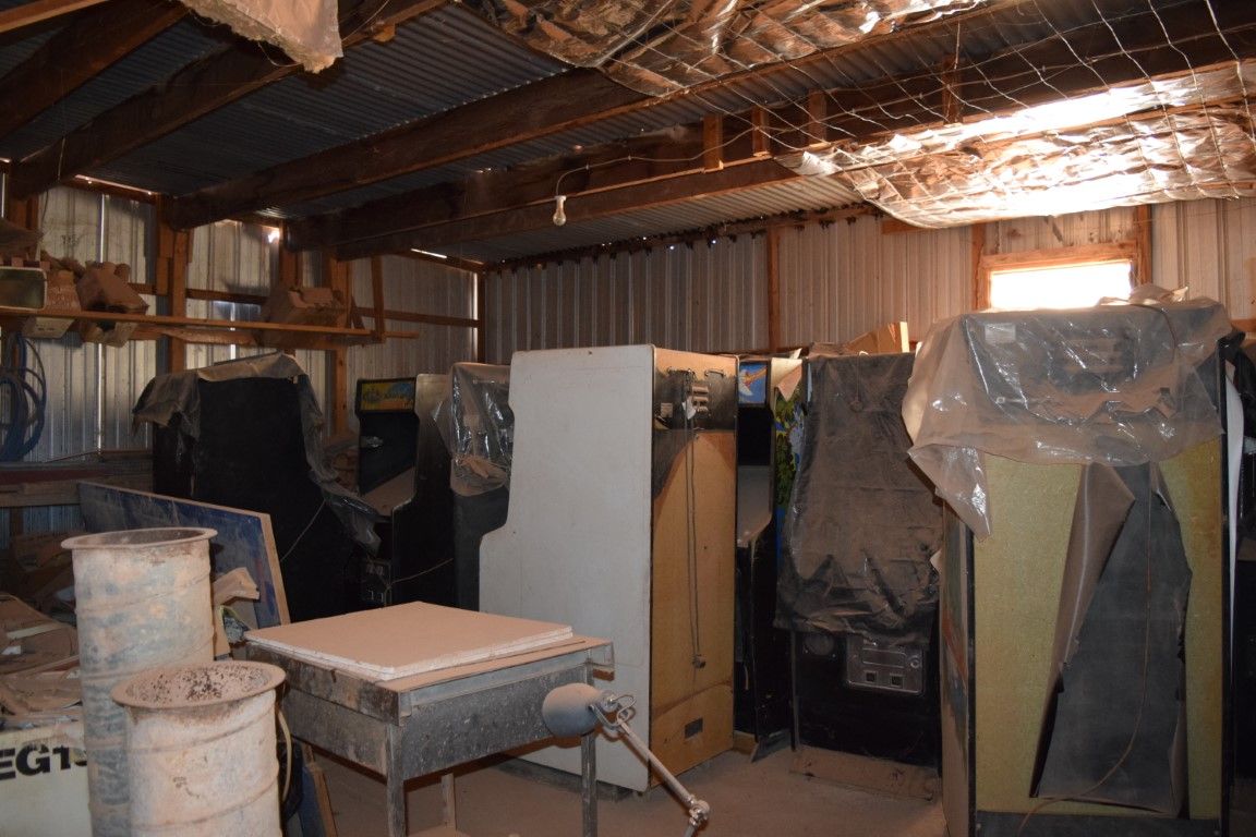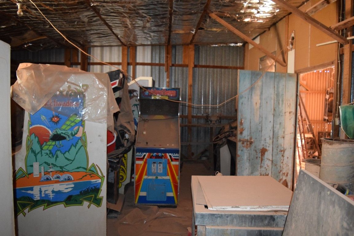 There is also a shed attached to main house with concrete flooring, split into two areas. One side filled with kitchen building materials and the other side filled with arcade gaming machines from the 80's.