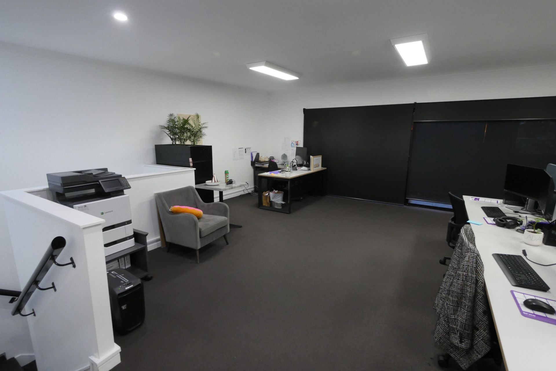 The upstairs open space is spacious and includes modern ceiling lights, power points, carpet, and blinds and opens to the balcony for relaxation.