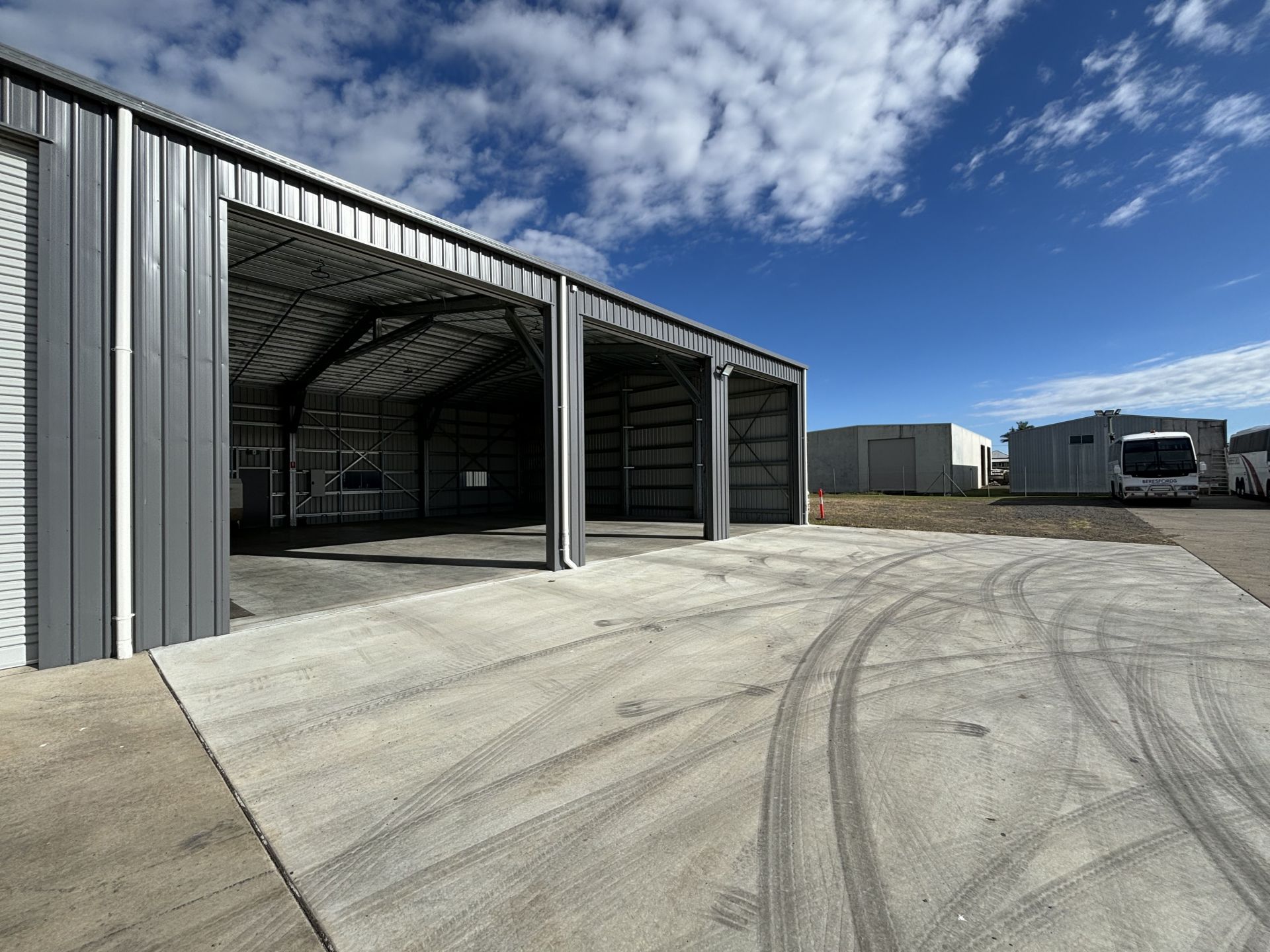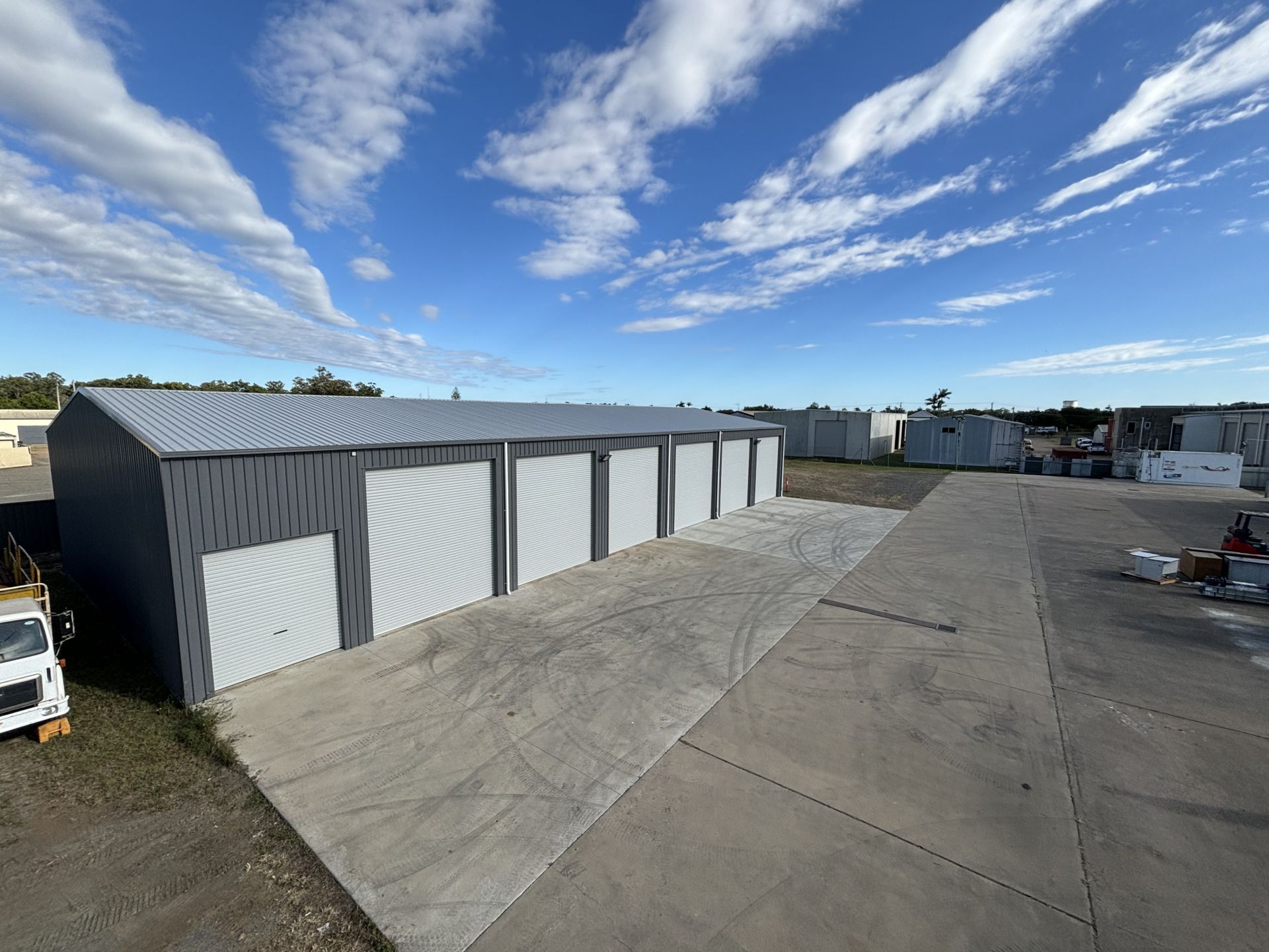 - Each Shed fronts a 30m wide, 150mm thick shared concrete hardstand, perfect for articulated vehicles to access each shed.