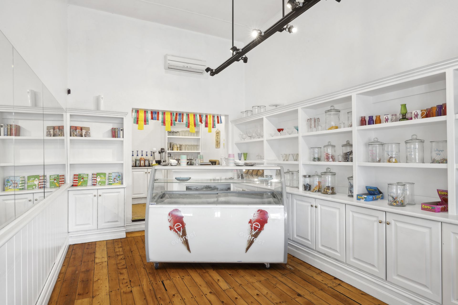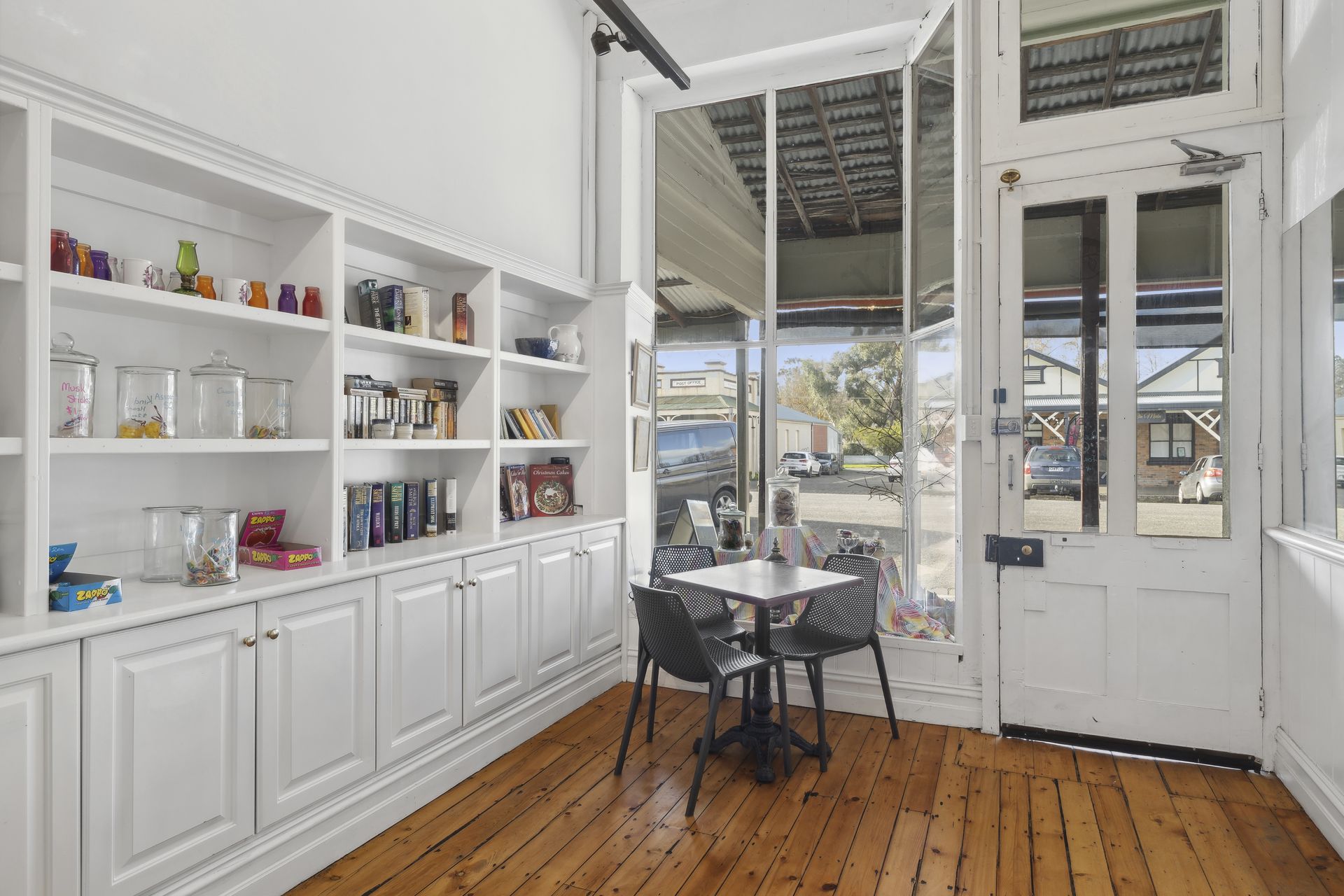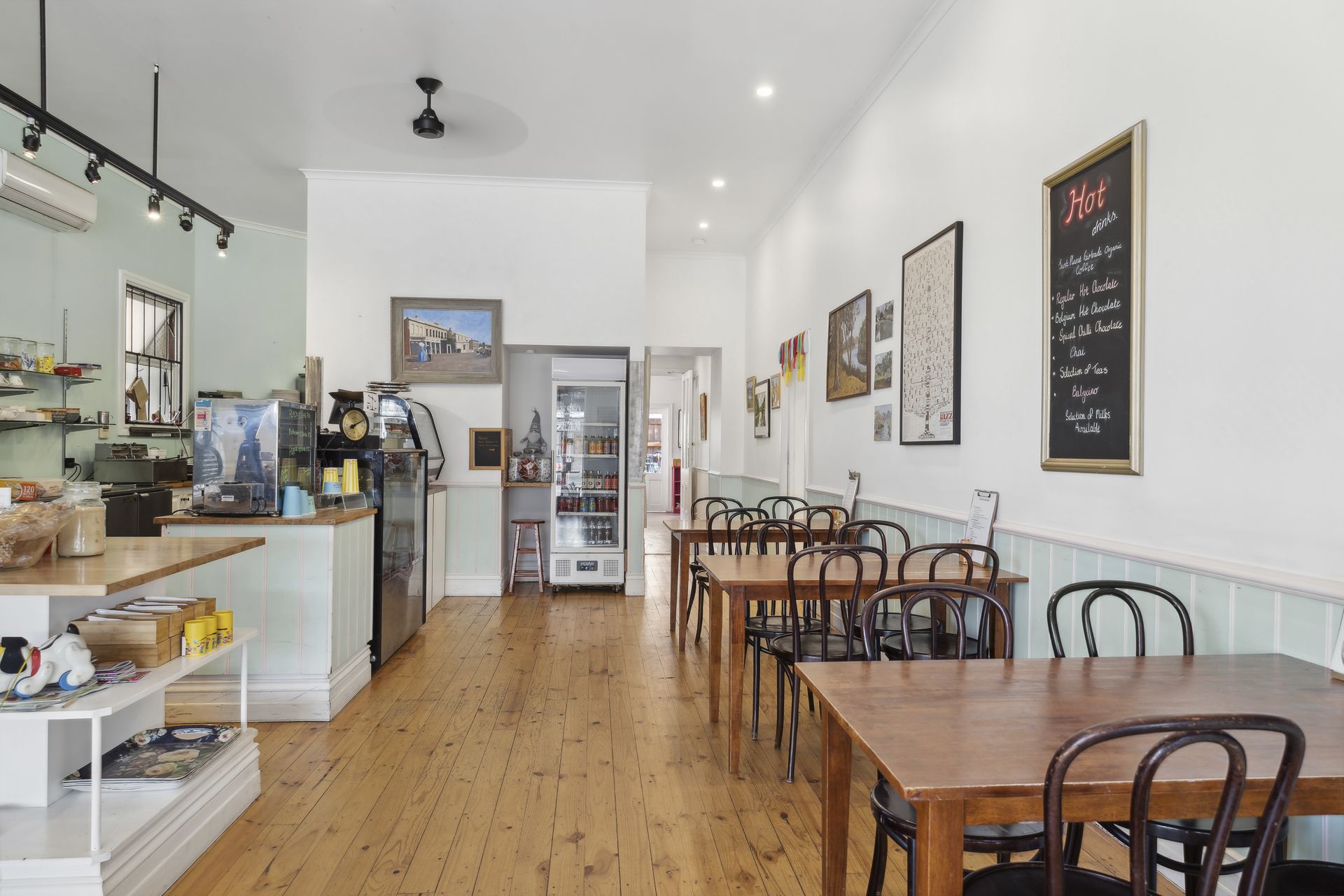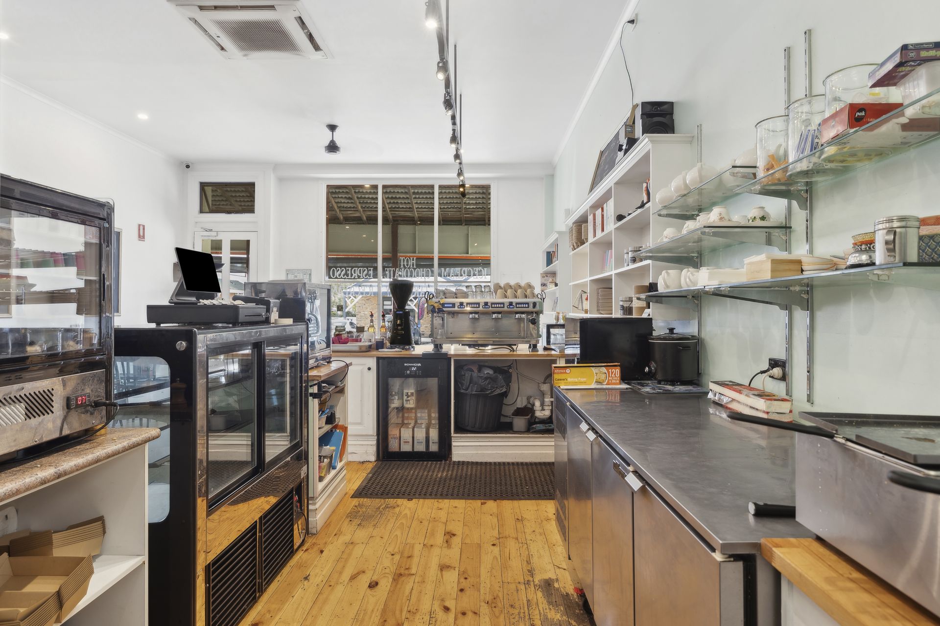 - Left shop access with entry to (cafe) open dining area and kitchen. Right access shop with entry to (confectionery/ice-cream) retail room