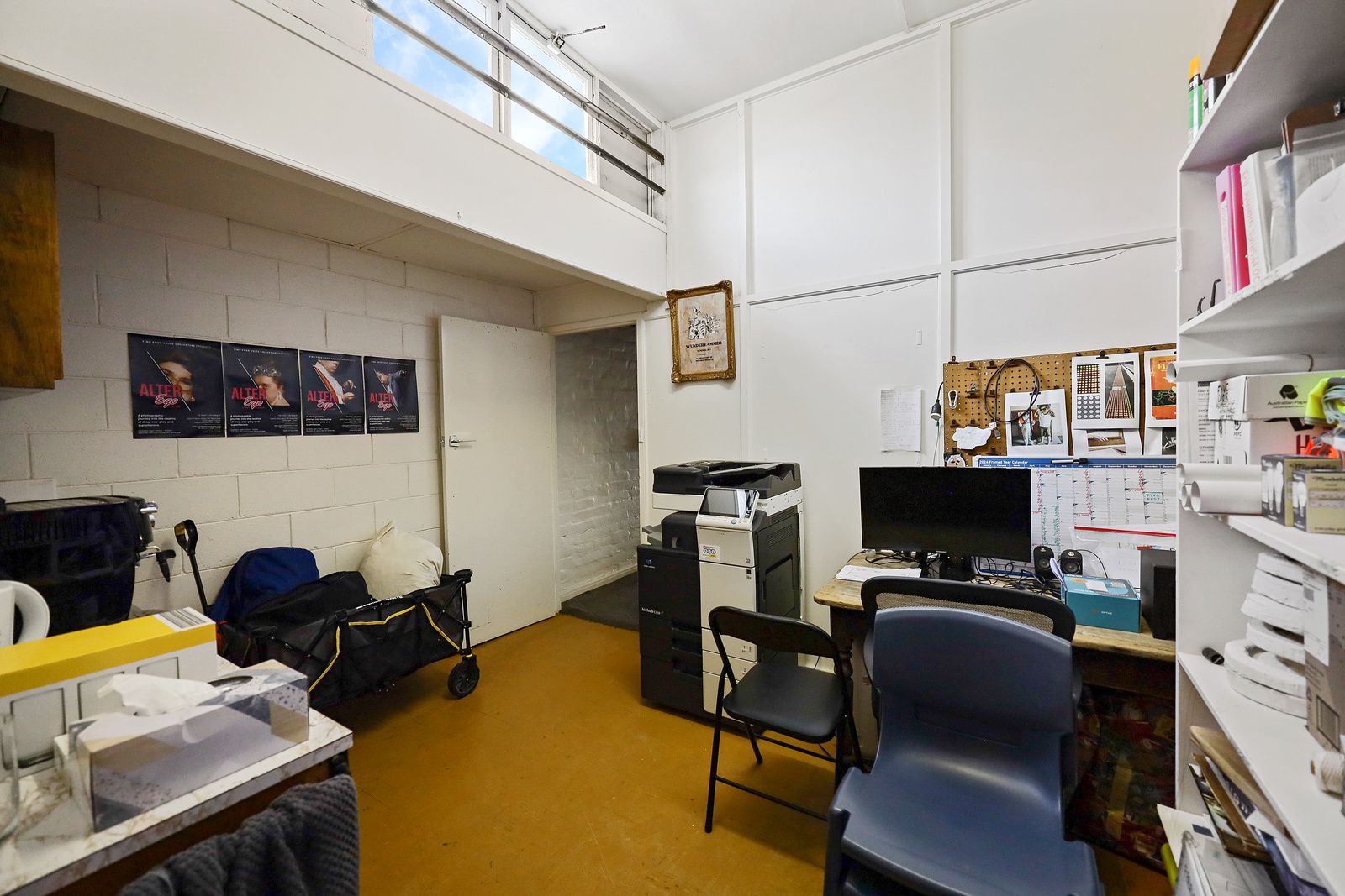 The current fit out includes air conditioner, polished floor boards, office space, kitchenette area, toilet, and storage room.