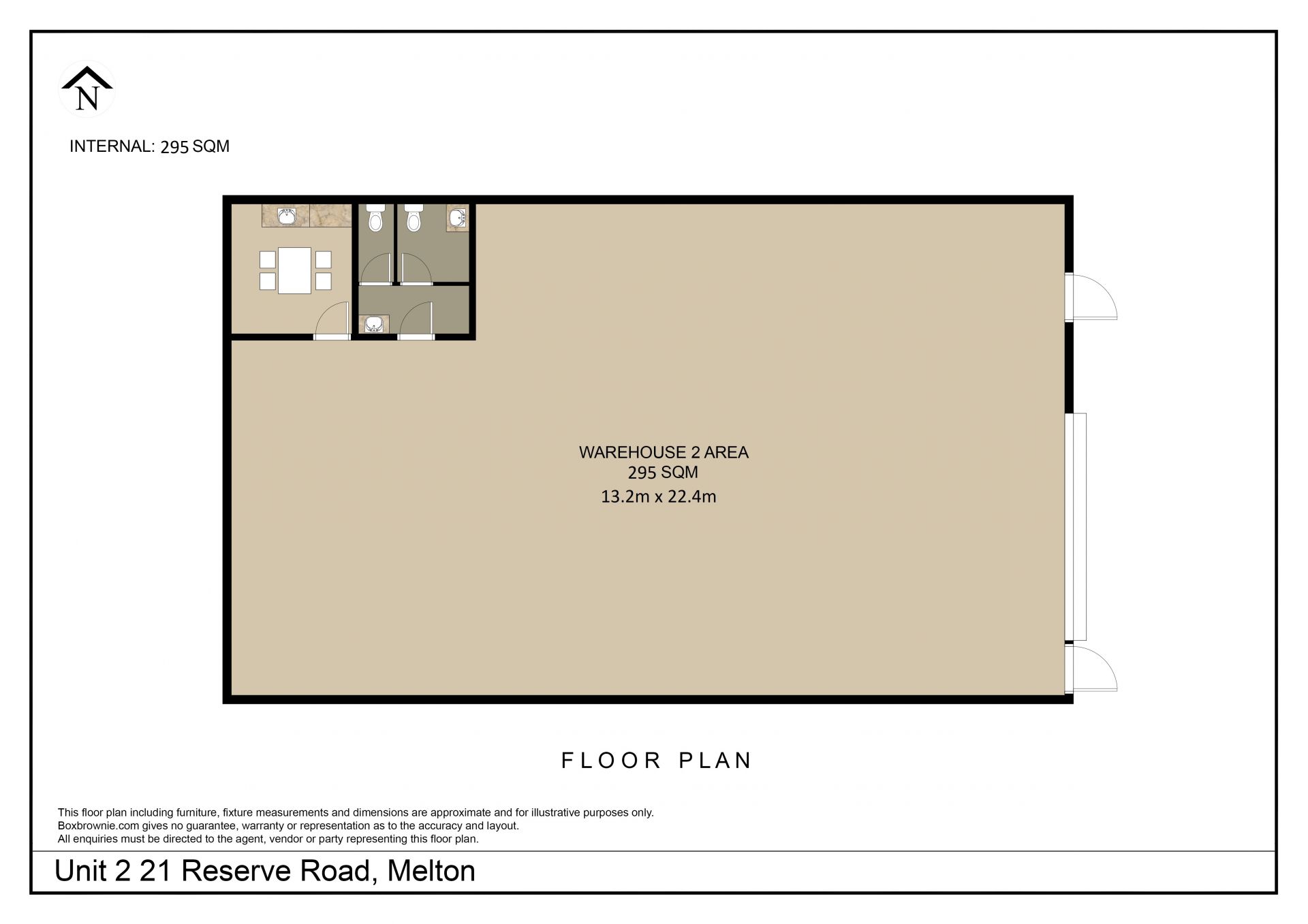 The building itself comprises approximately 295m² of versatile warehouse space, which includes internal amenities such as toilet facilities and a kitchenette. The clear-span layout offers excellent utility for a range of industrial or storage-based uses.