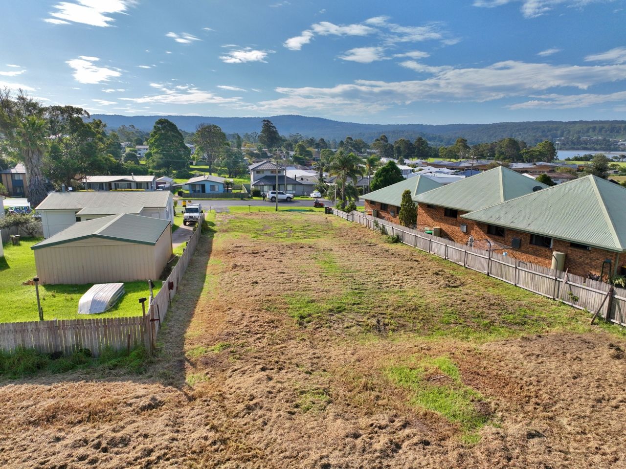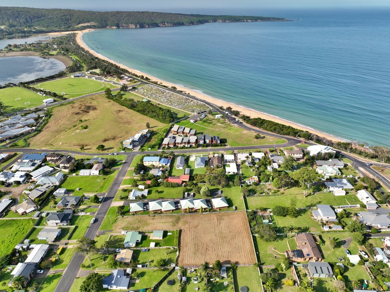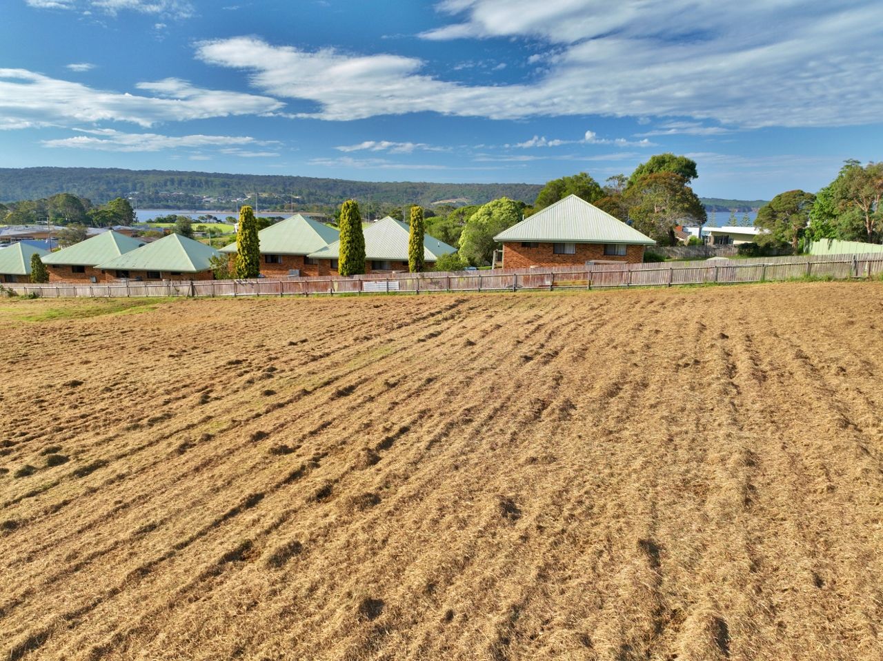 The site extends at the rear to a large gently sloping fully fenced "paddock". The DA approval allows for 10 apartments comprising 3 x single storey 2 bedroom villas with open plan living, ensuite & double garage. The remainder comprise 7 x 2 storey 3 bedroom apartments with open plan living to deck areas, ensuite & double garages. Approved for development in 3 stages, the design takes full advantage of the sites solar aspect and views which span across Lake Curalo to north Aslings Beach & Bay.