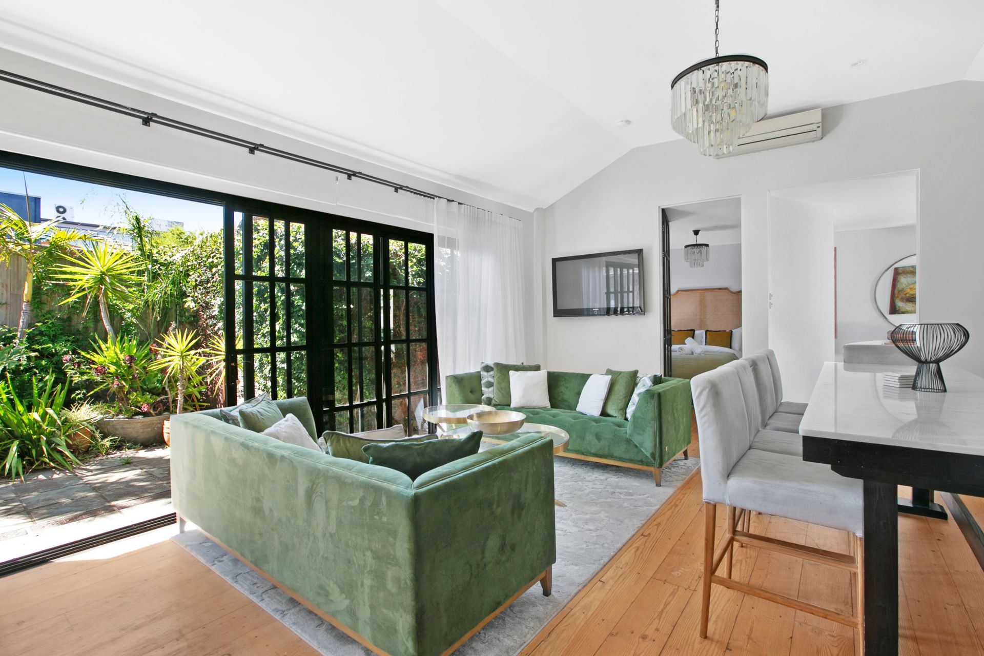 The Residence 2BED 2 BATH: Renovated 1930s-character home with high-end finishes, bespoke kitchen, polished concrete flooring, private courtyard, and master with ensuite.