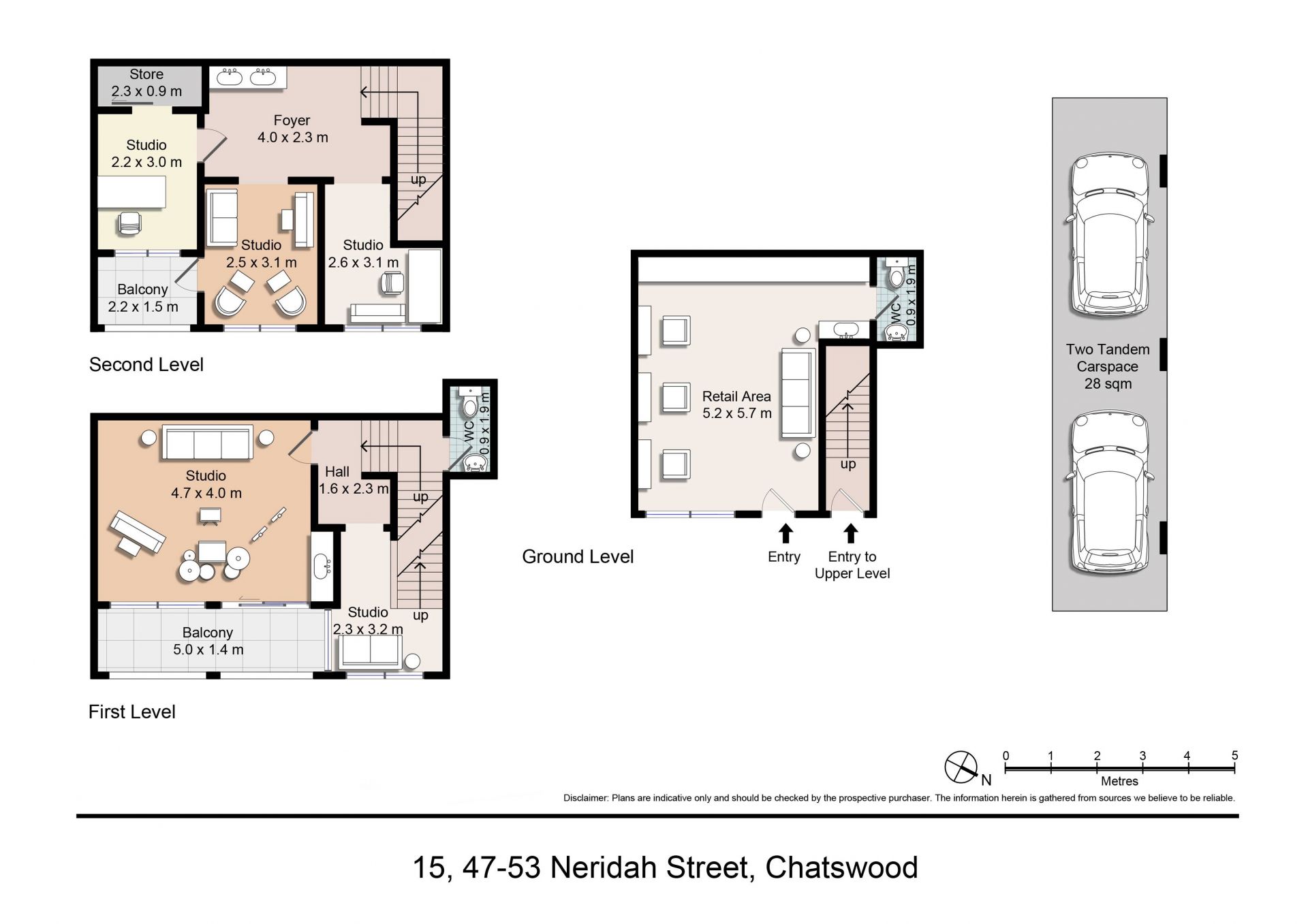 - Level 1 : 59 sqm [Area : 31 sqm, 2 x car spaces : 28 sqm (in tandem) – Hairdresser tenant]