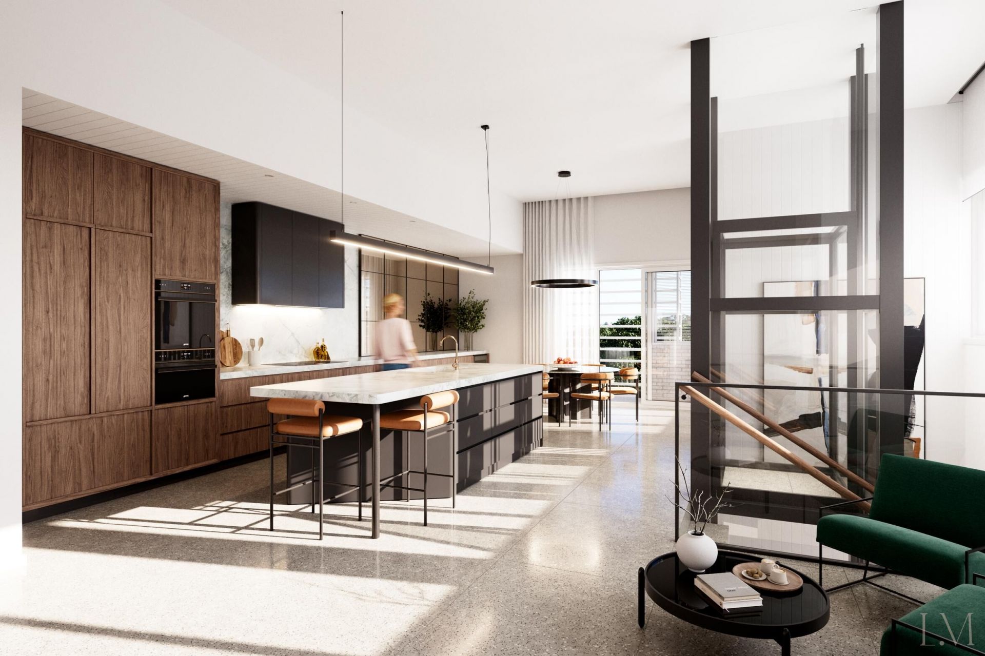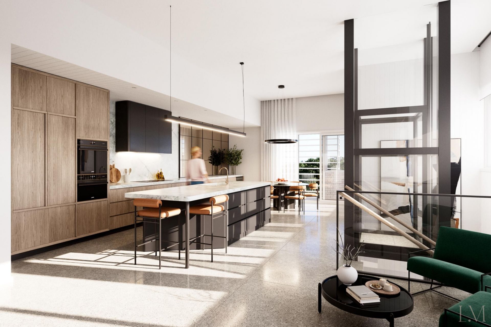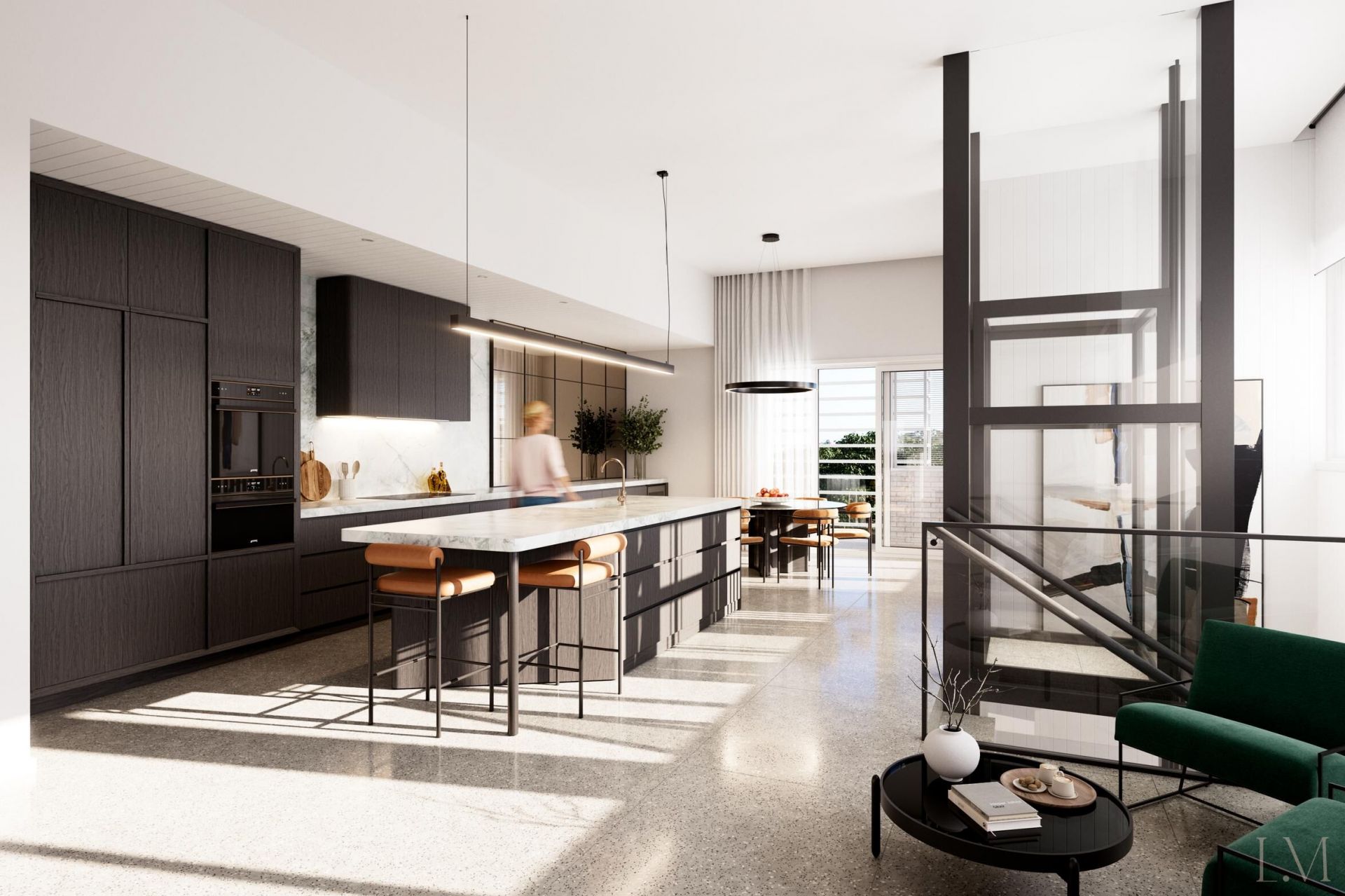 - Townhouses set over three levels, each with an independent industrial-style glass lift;