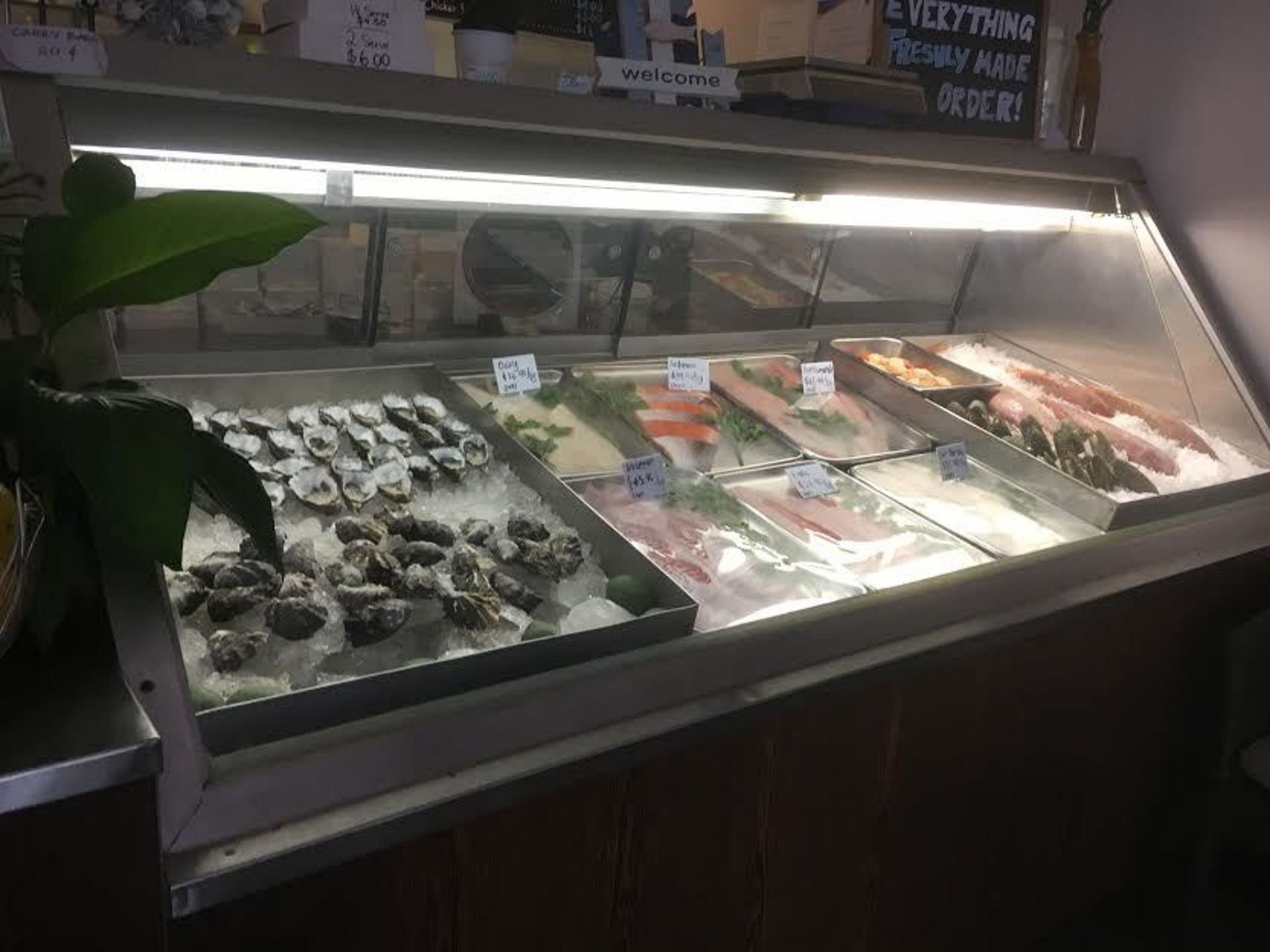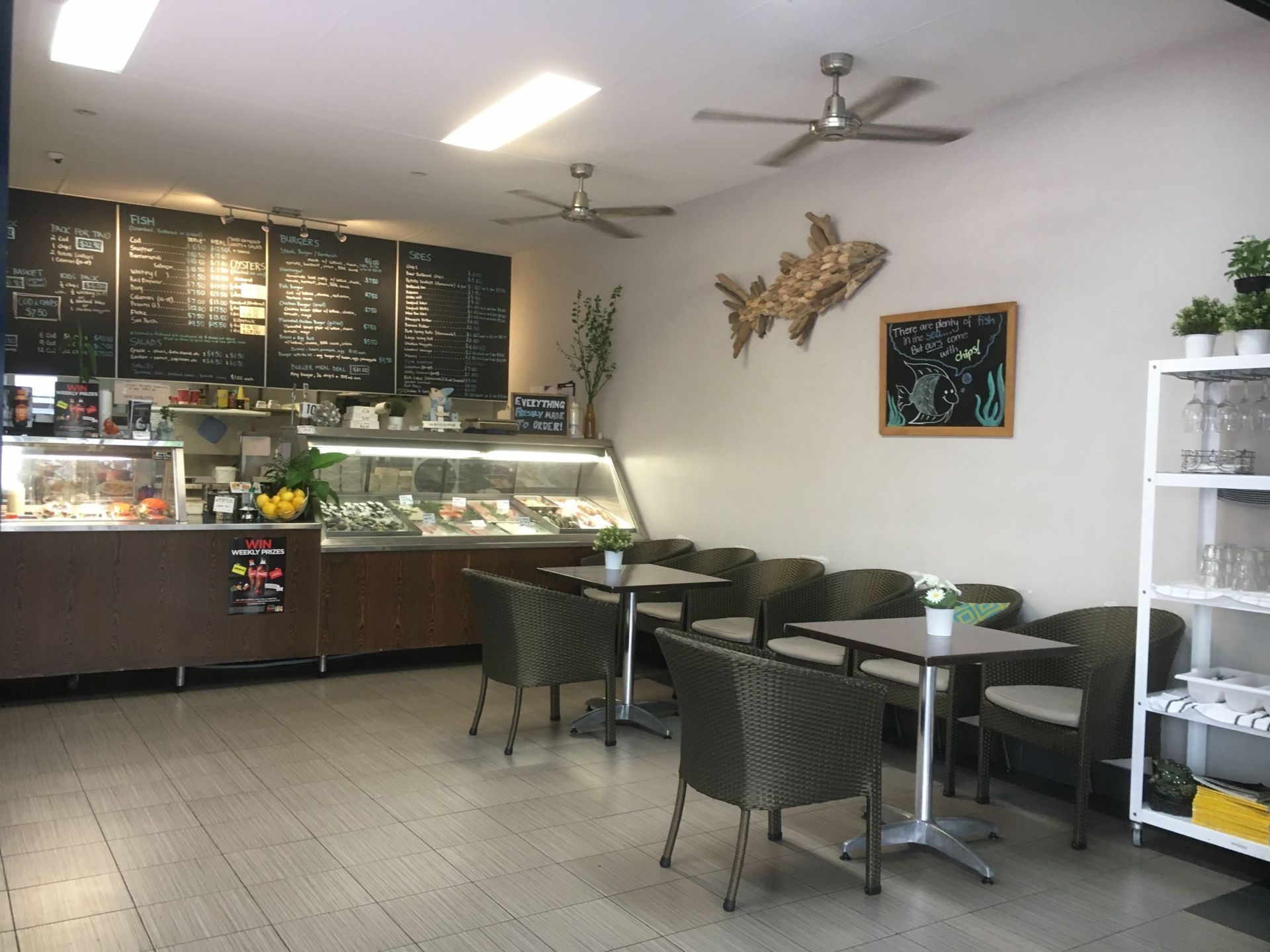 Takeaway/Restaurant selling fish and chips, freshly prepared fish, scallops, mussels, freshly prepared salads, burgers and soft drinks. Excellent high visibility location. Fully equipped kitchen. Tables and chairs for customers to seat either inside or outside.