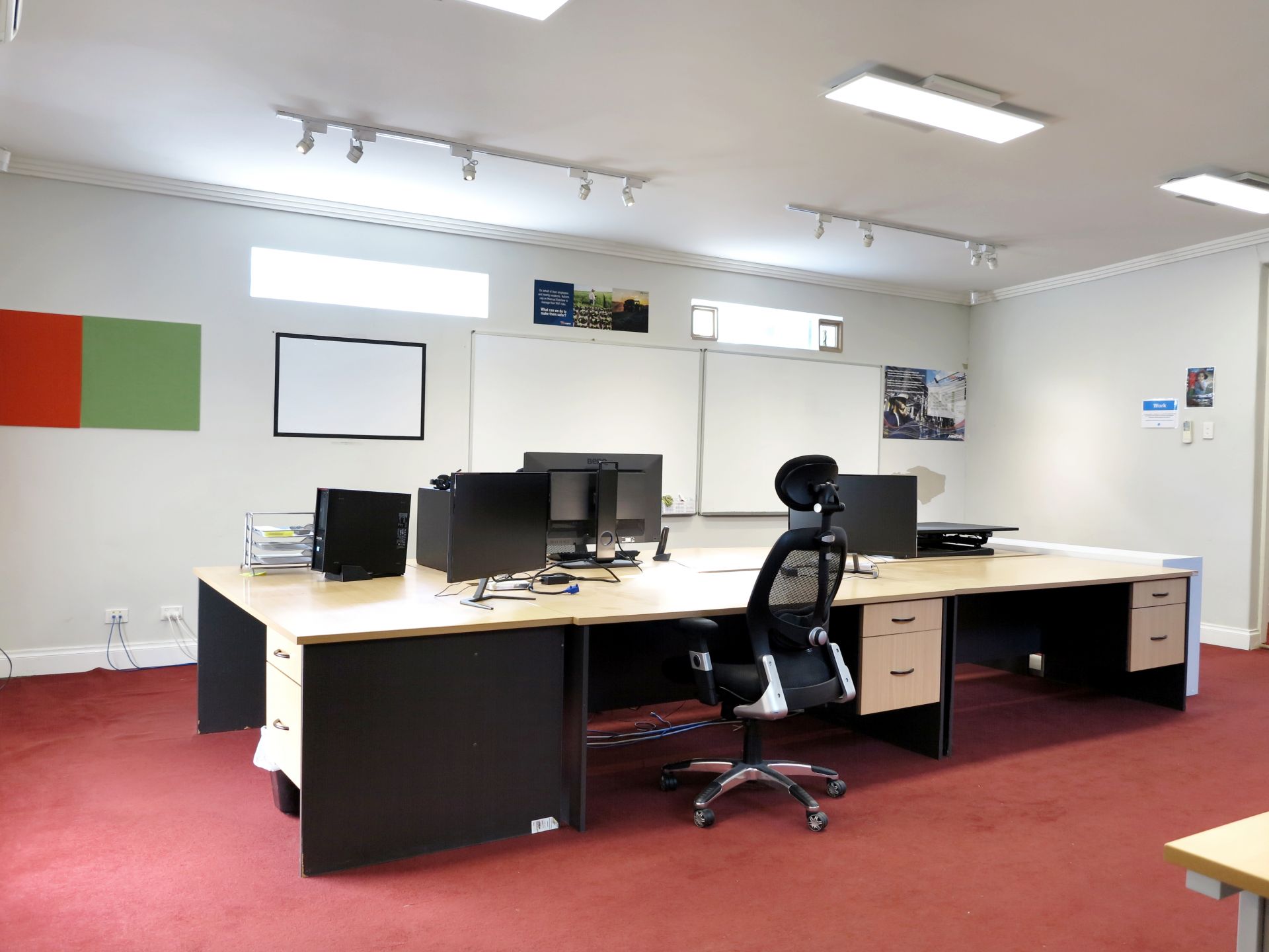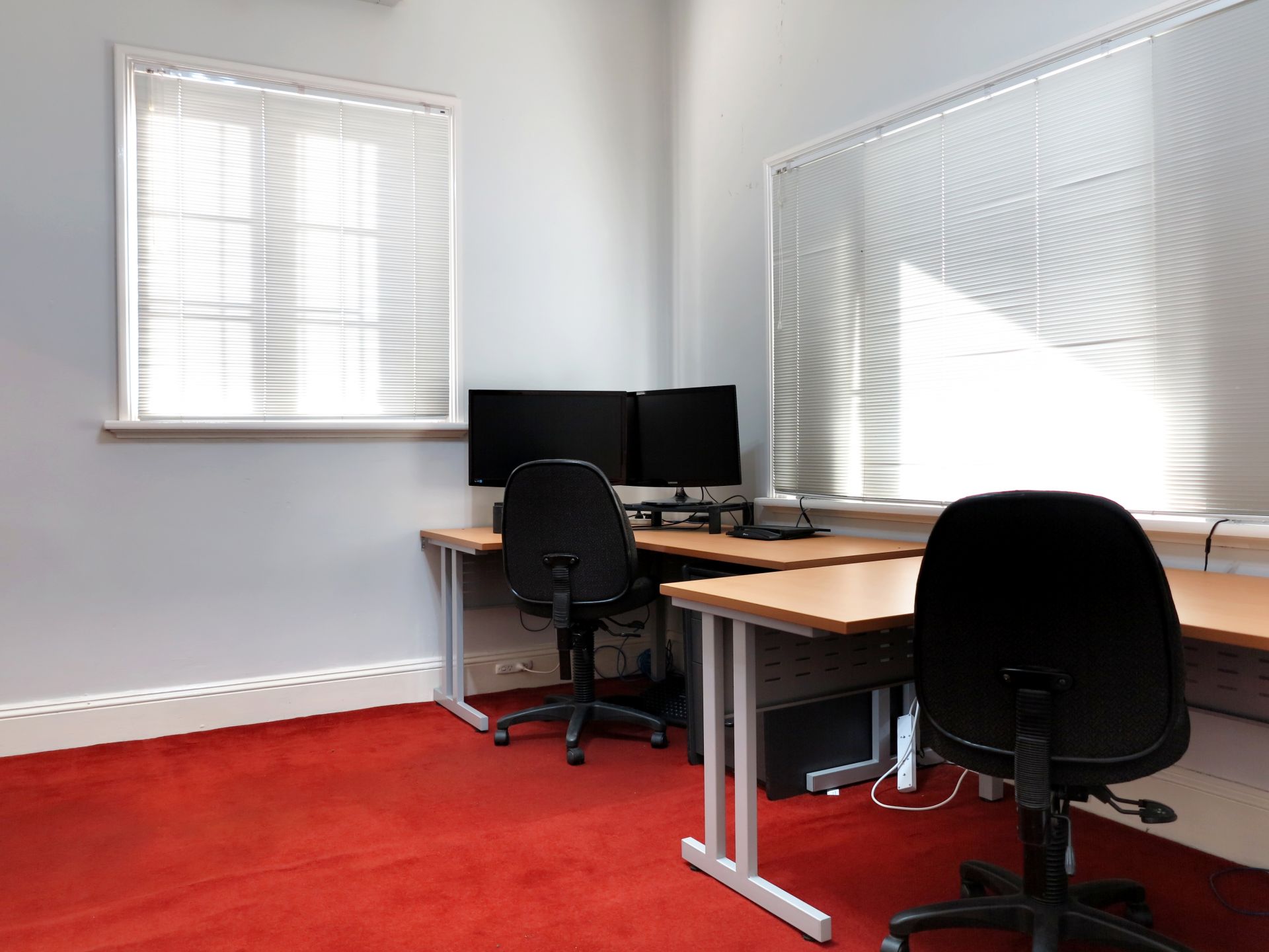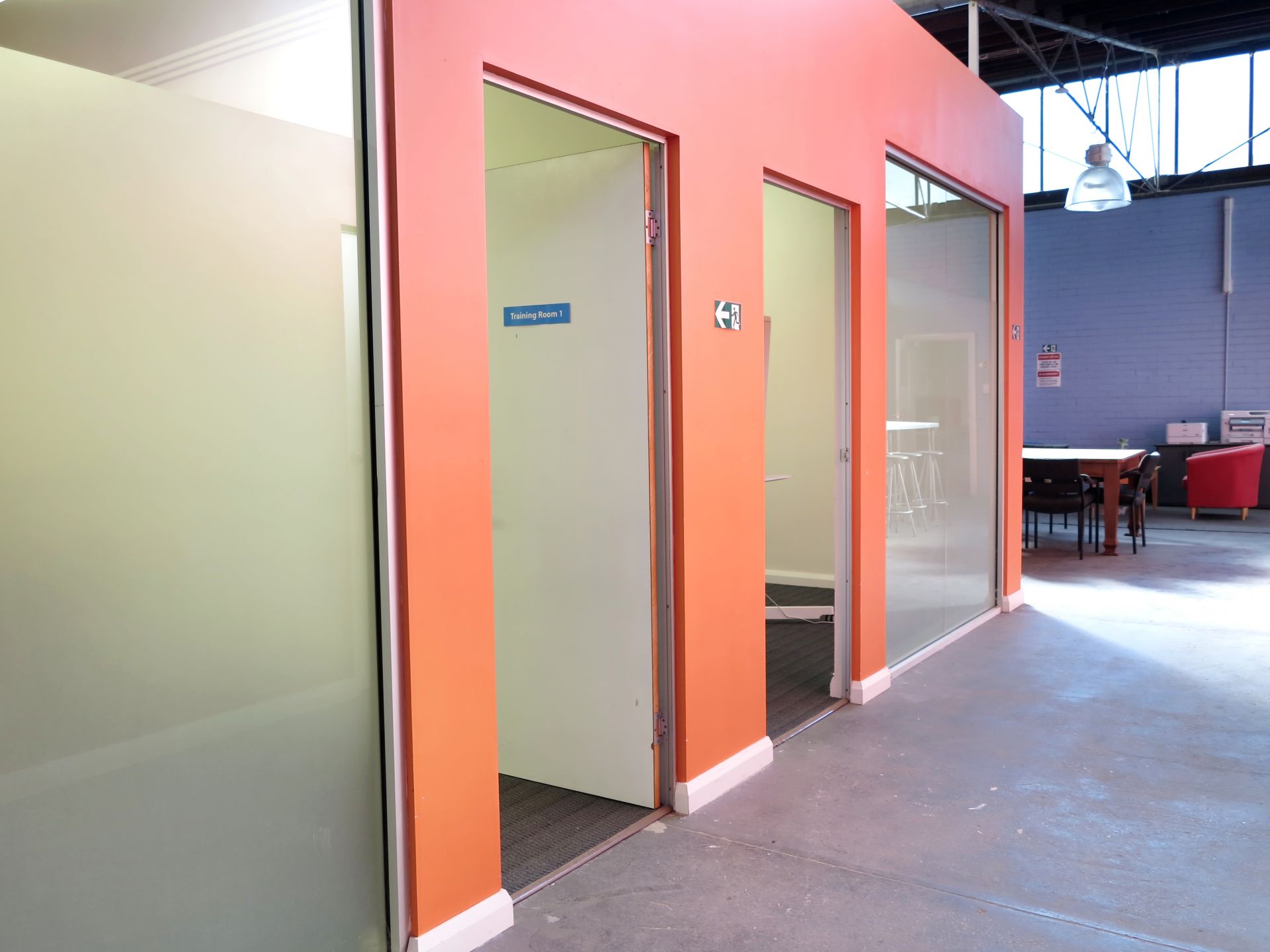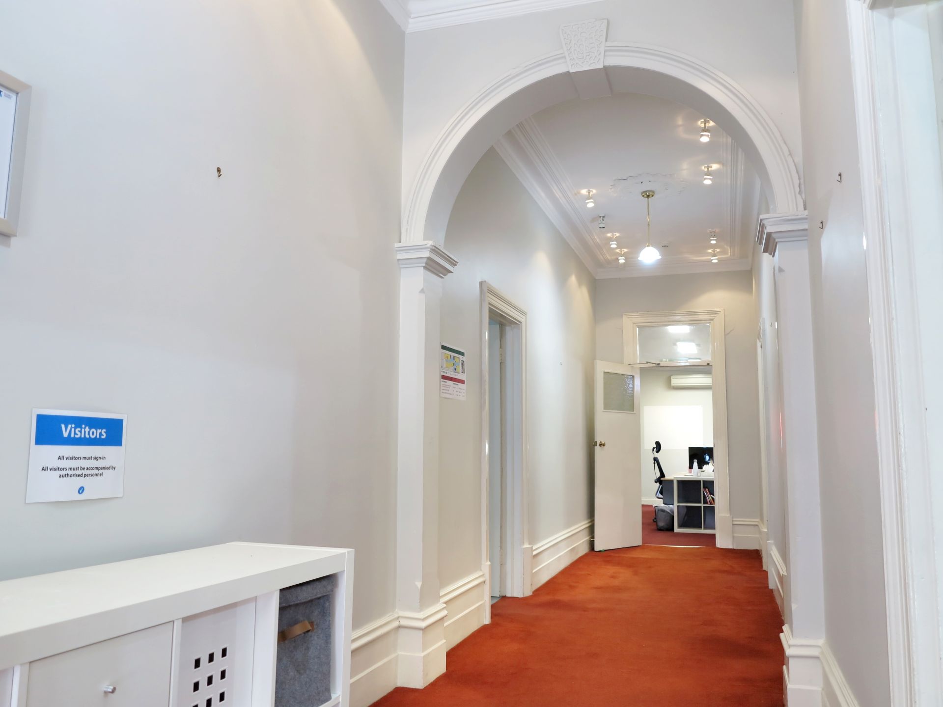 - The office features high ceilings and generous room sizes with a combination of open plan and private rooms.