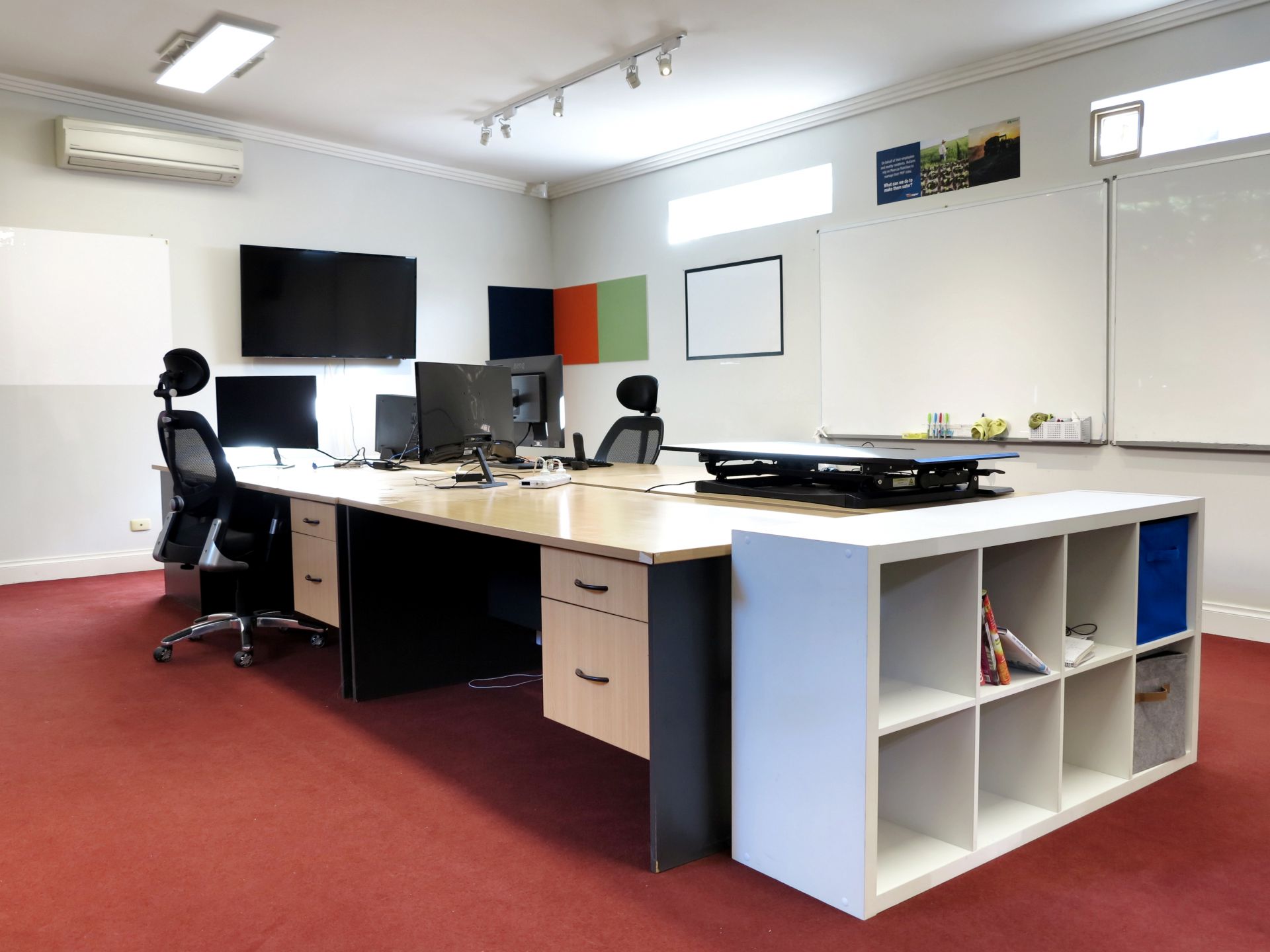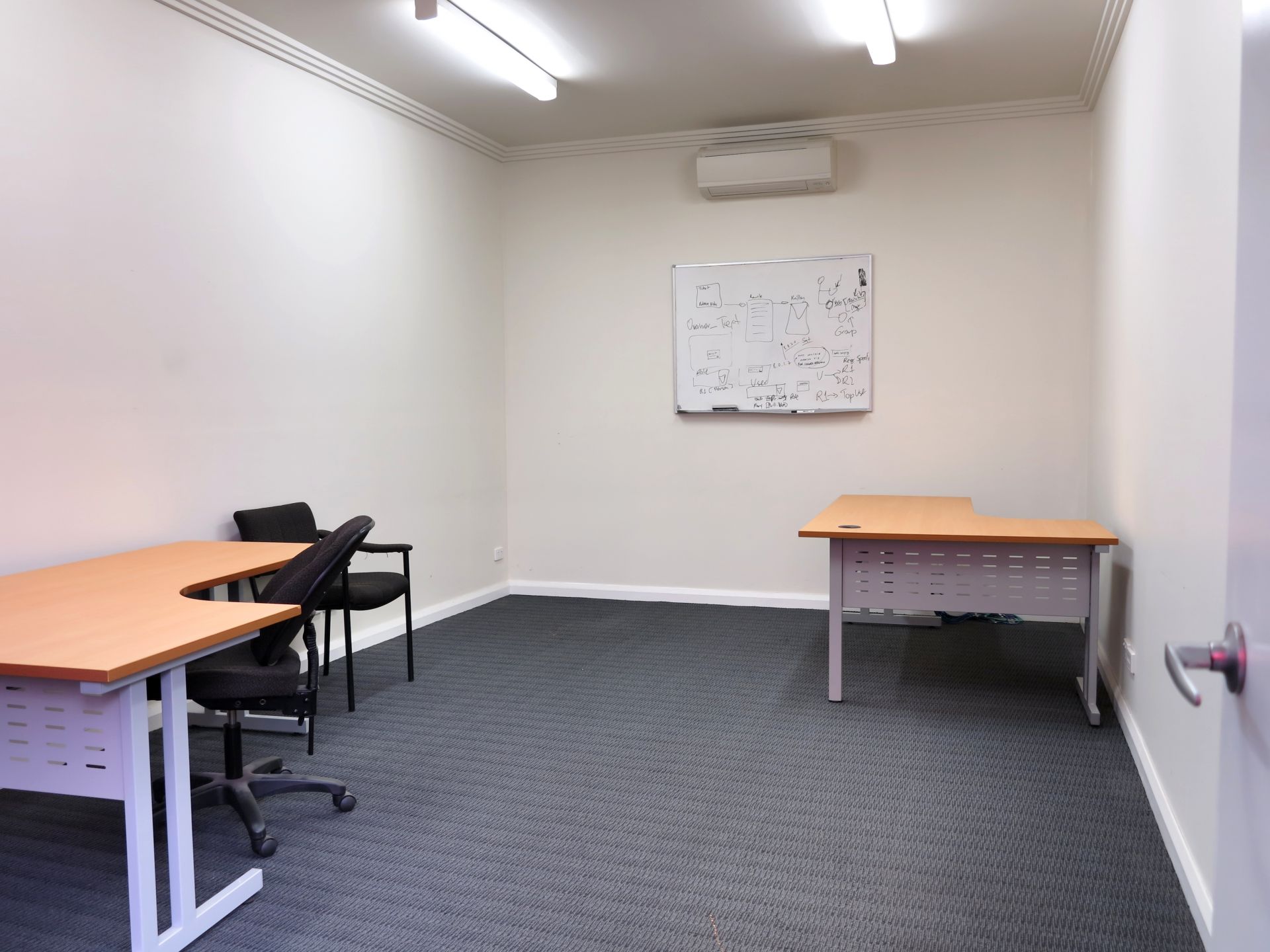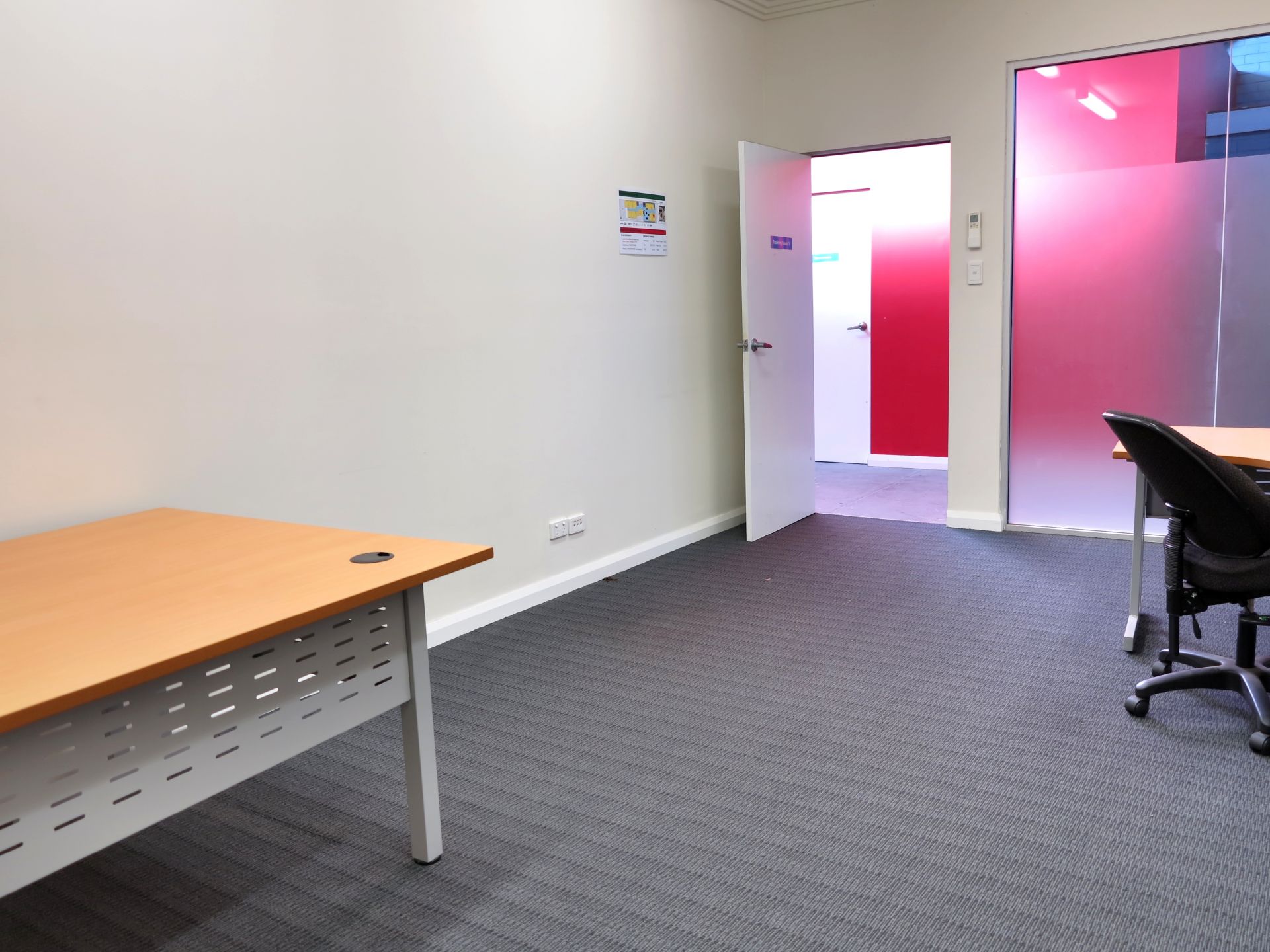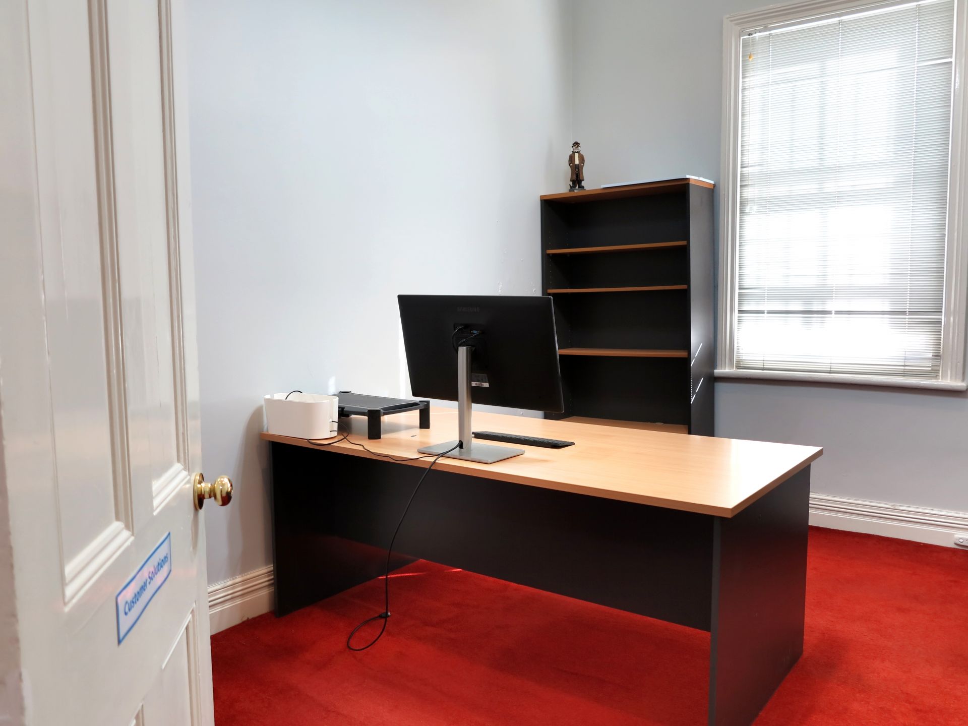 - The office features high ceilings and generous room sizes with a combination of open plan and private rooms.