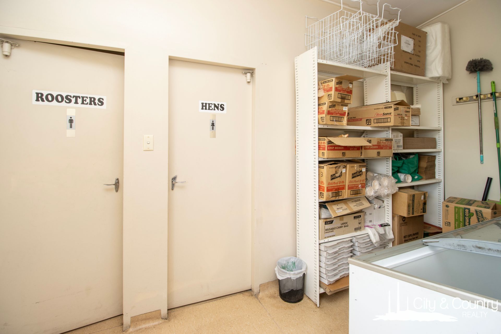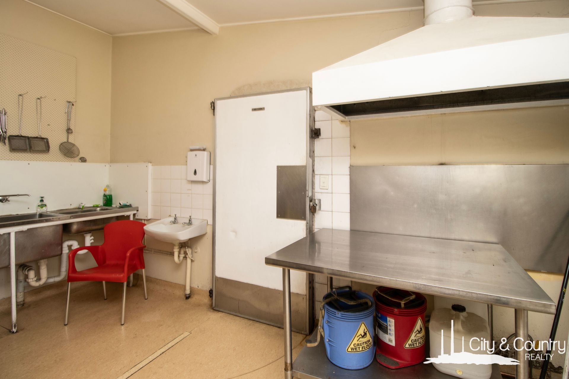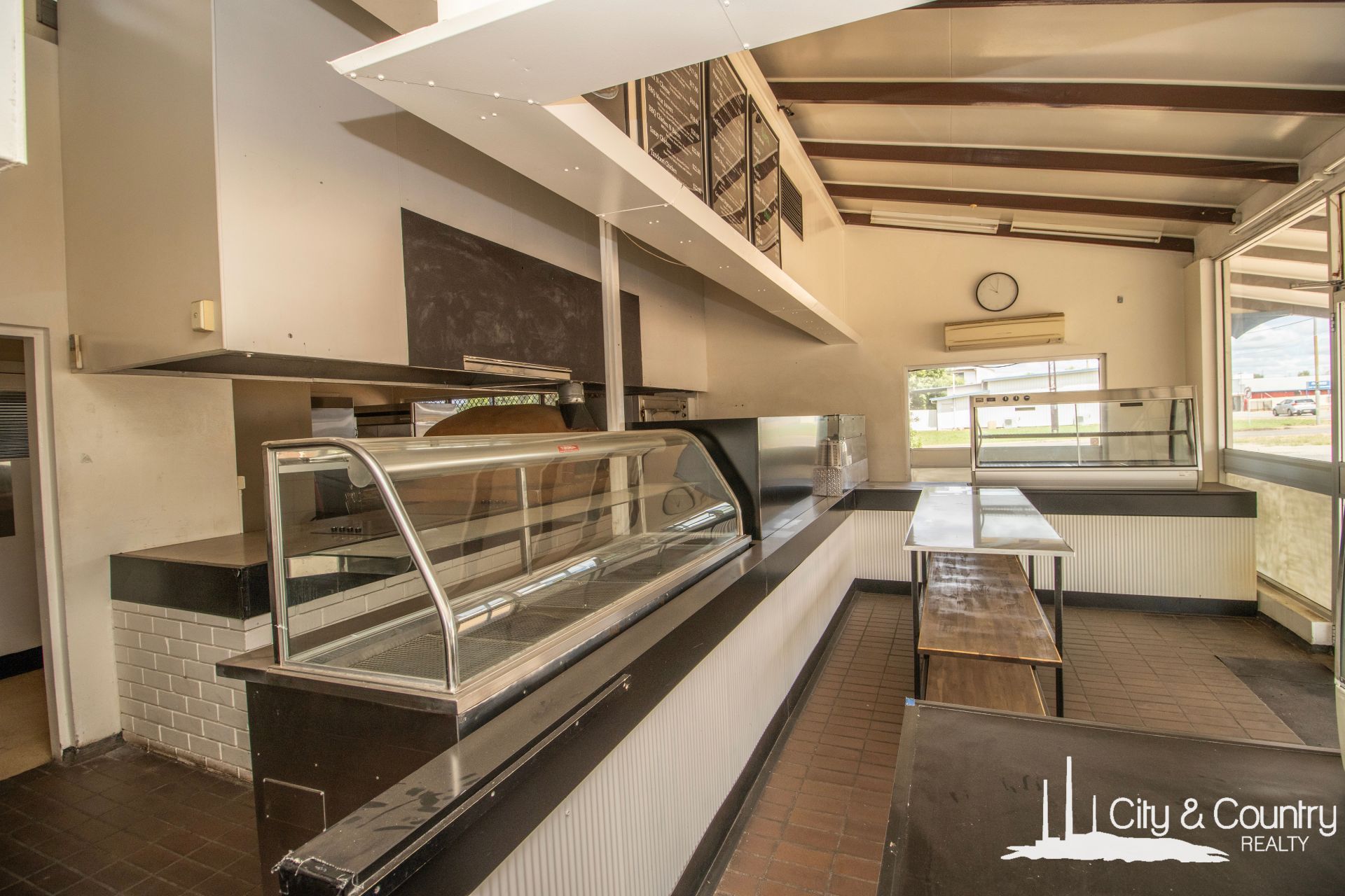 Step inside to discover a welcoming foyer with soaring ceilings and air conditioning. The interior features two cooktops, a bain-marie, exhaust fan, and built-in deep fryers. Towards the rear, you'll find a well-appointed staff office with refrigerated cooling, as well as separate his and her toilets. Additionally, there's a spacious storage room equipped with a freestanding fridge/freezer combo and warming unit and a generously sized commercial kitchen complete with a walk-in cold room and ample bench space.