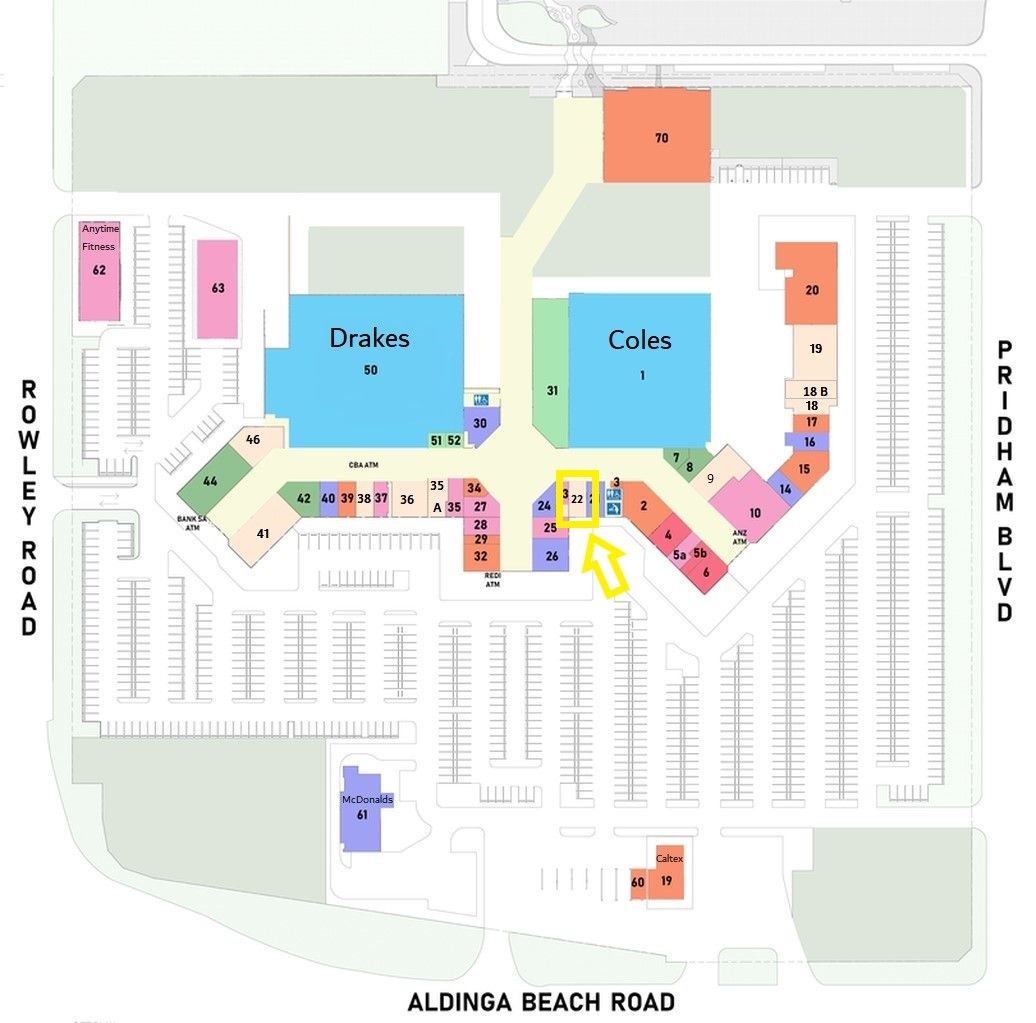 Aldinga Central Shopping Centre site is set out on approximately 86,000 sqm of land and provides over 800 car parking spaces, 2 anchor tenants Coles and Drakes, 40 speciality retail stores and is home to Subway, Flight Centre, Caltex & Car wash, Anytime Fitness, McDonalds and more and has entrances from Pridham Boulevard, Aldinga Beach Road and Rowley Road.