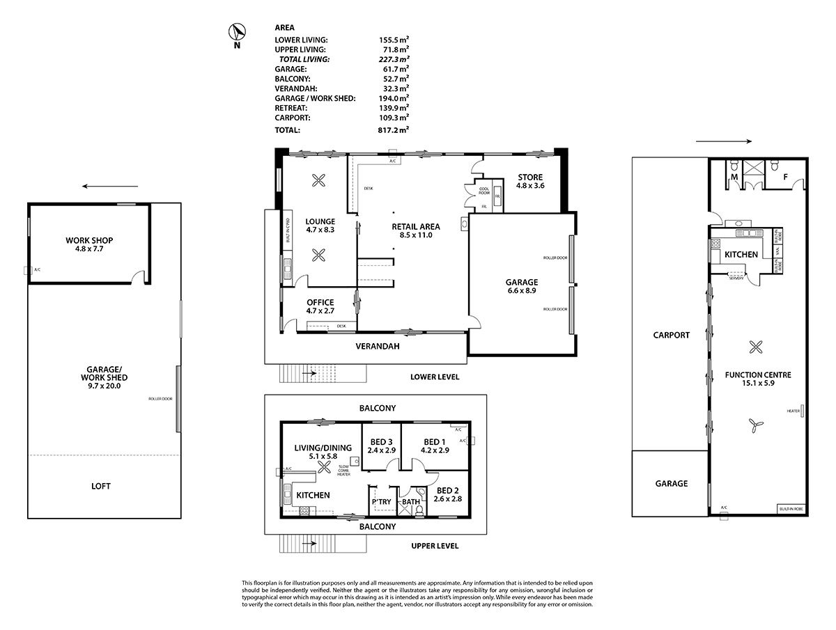 Ample garaging, storage & working areas with large workshop / garage with mezzanine storage & enclosed brick workshop / games room. Second garage, carports and storage sheds.