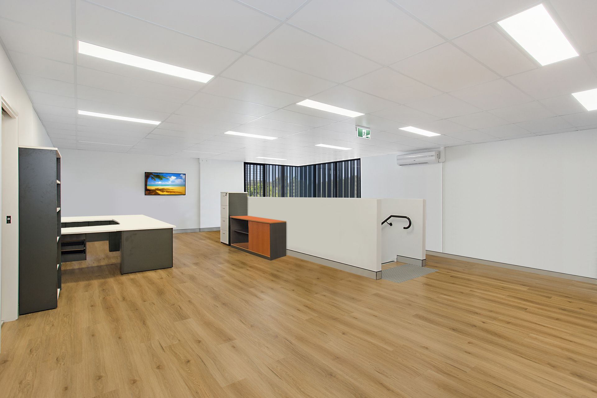 * Immaculately presented 104m2 mezzanine office with open plan, louvered windows, air conditioning, data and phone lines