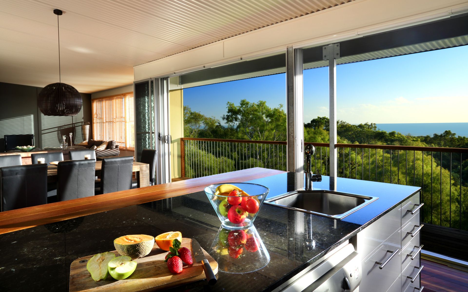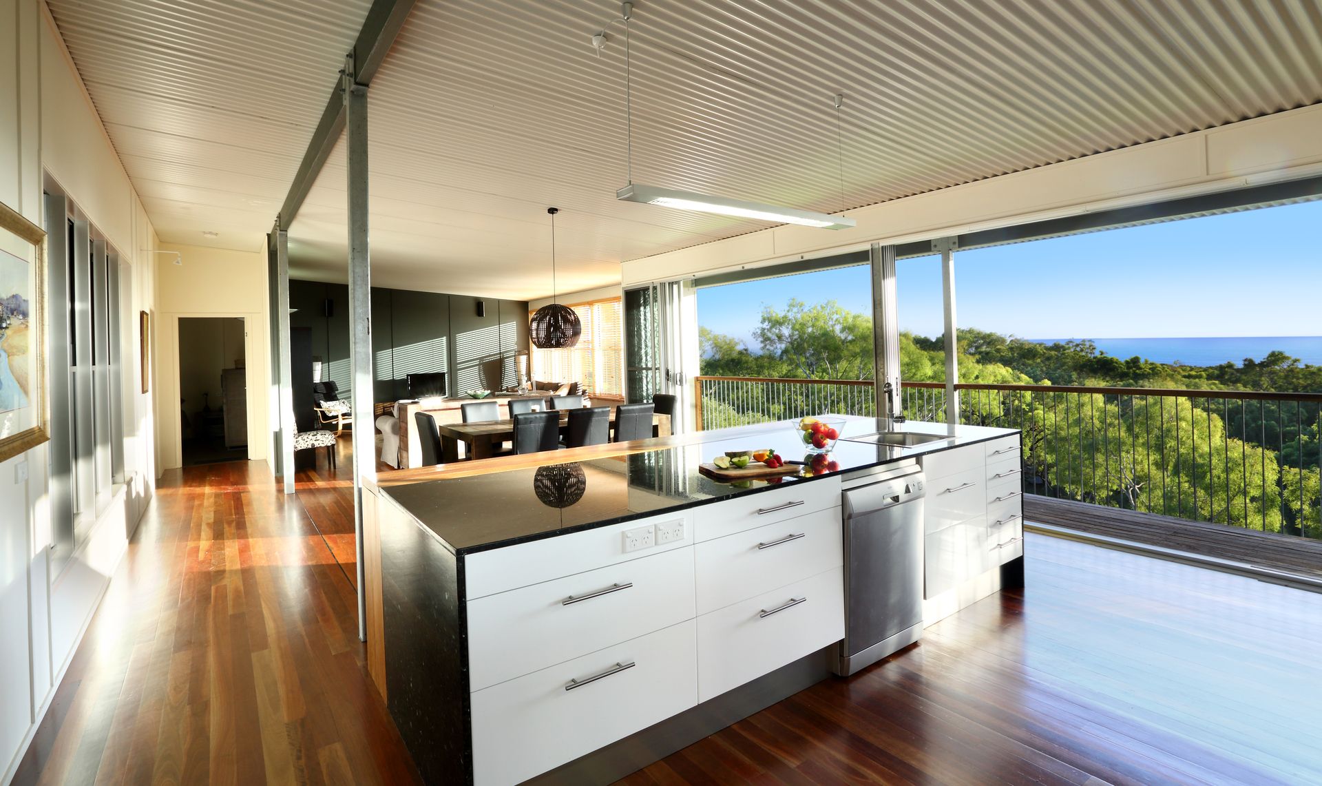 Open plan kitchen, dining and lounge that all flows onto the surrounding decks that capture the sea breeze and look out to the expansive ocean views. The main deck area opens via two door access from the kitchen and provides an outdoor living area complete with BBQ, bar fridge and an outdoor lounge. The deck features a state of the art, custom designed fire pit. The deck area runs through the house giving it views of both the ocean and the beautiful national park with protection from the weather for all year dining and entertaining.