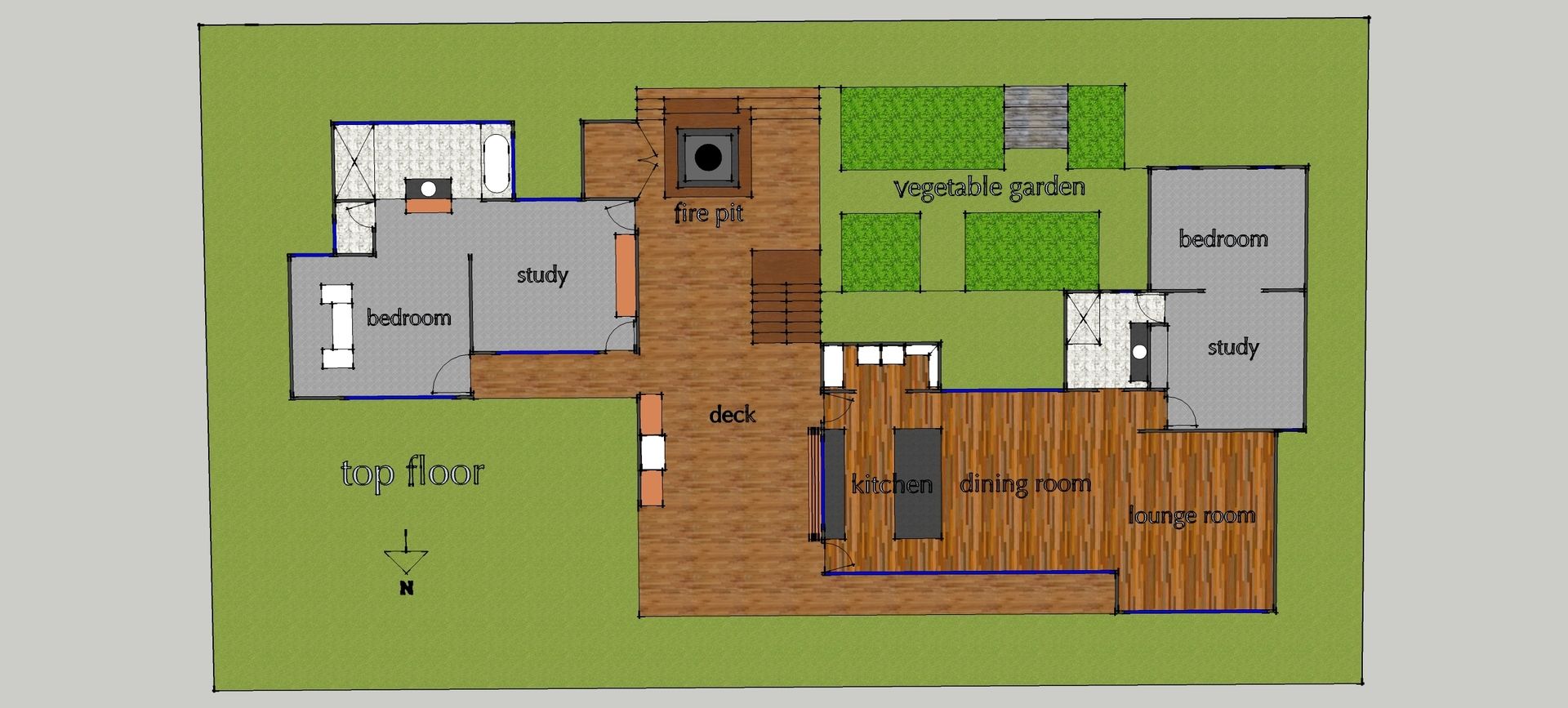 - Fire pit surrounded by seating on deck