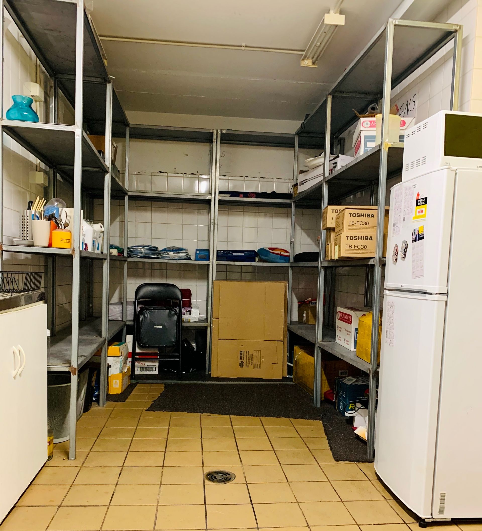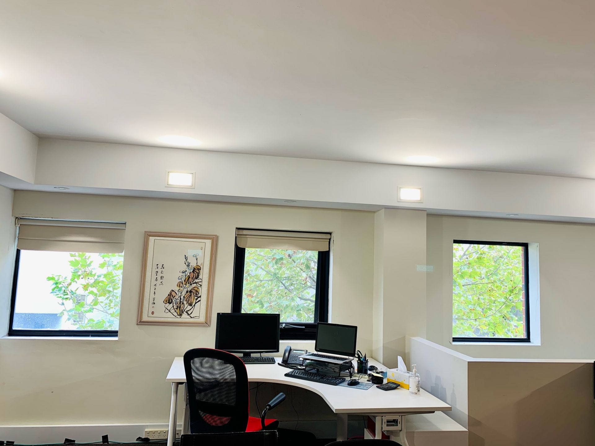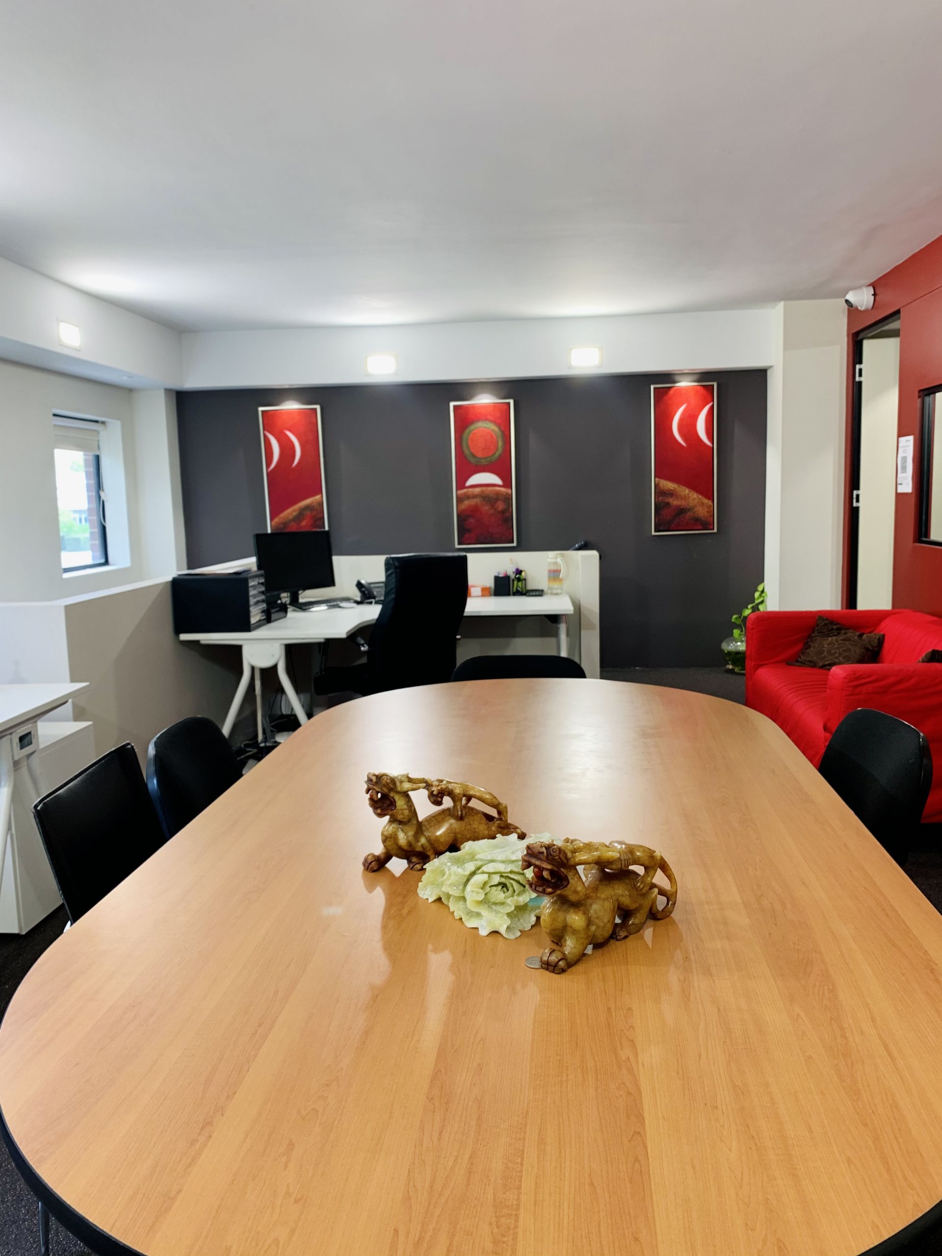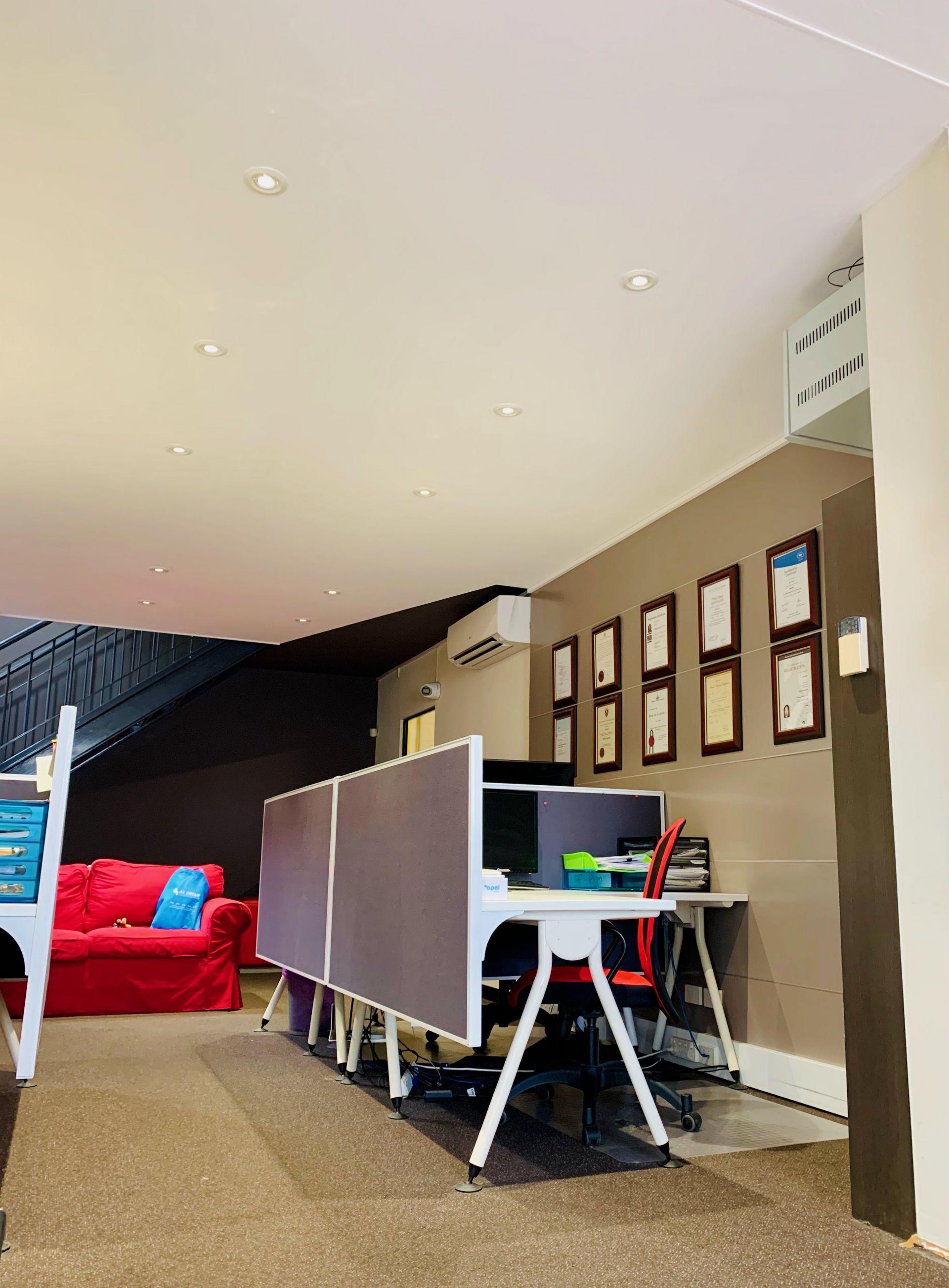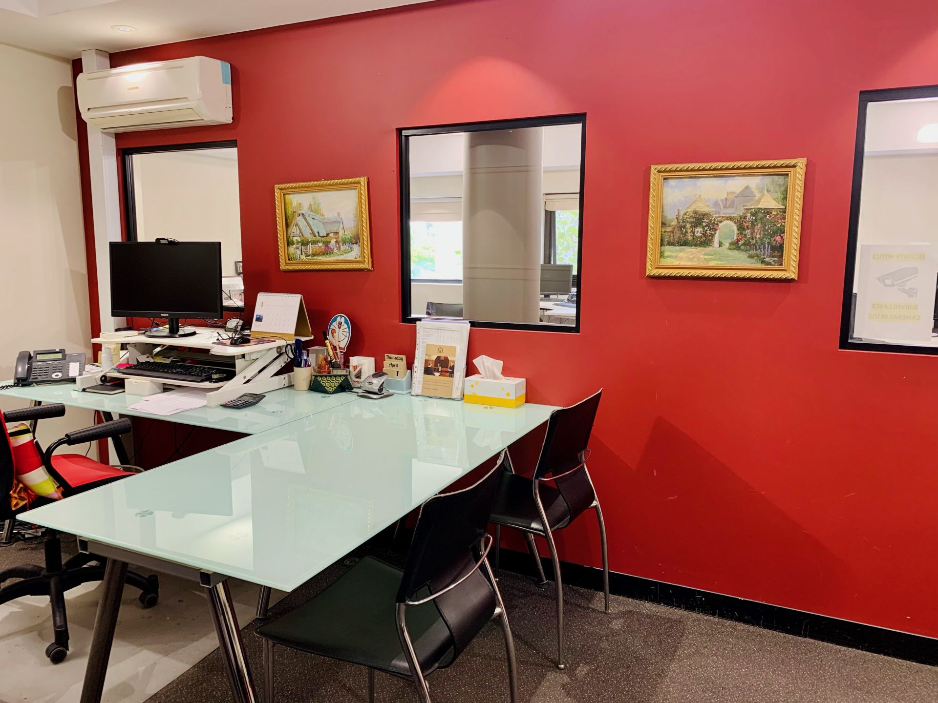 IT CONTAINS Security Cameras, 3 air-conditioning units,storage shelves, 6 workstations, tables with matched Chairs, long meeting table, separate toilet, ready for your business.