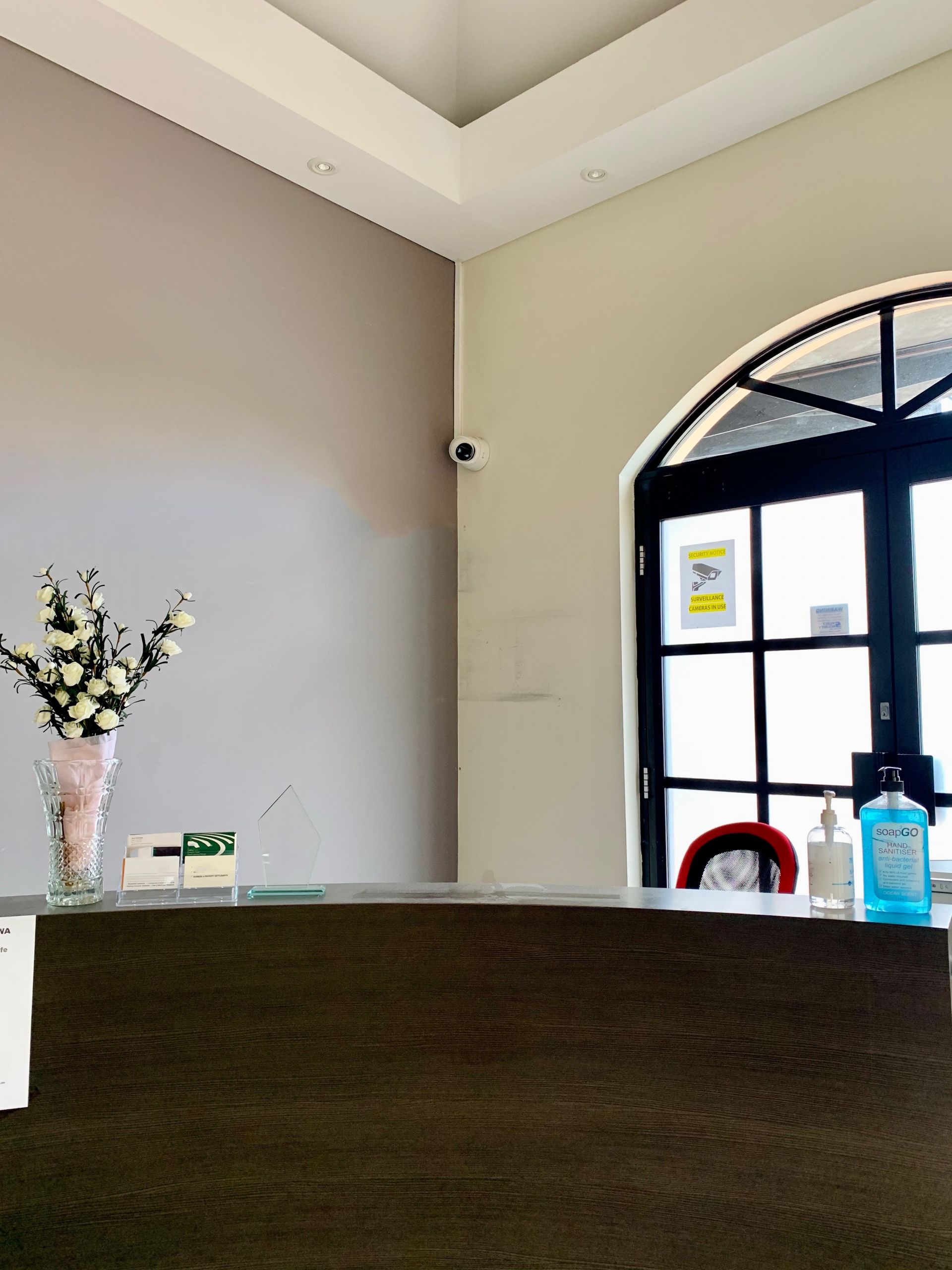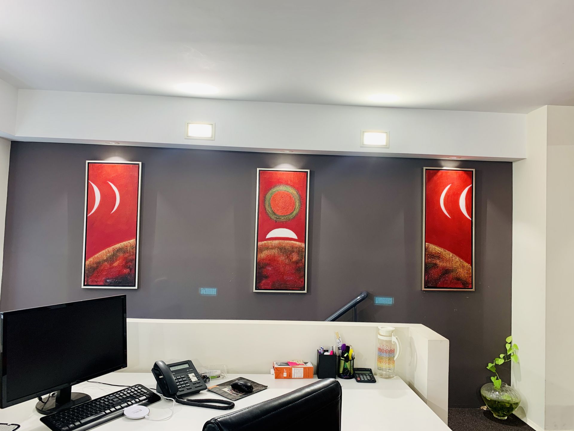 First Floor with modern reception,open office, and kitchen/storage room.