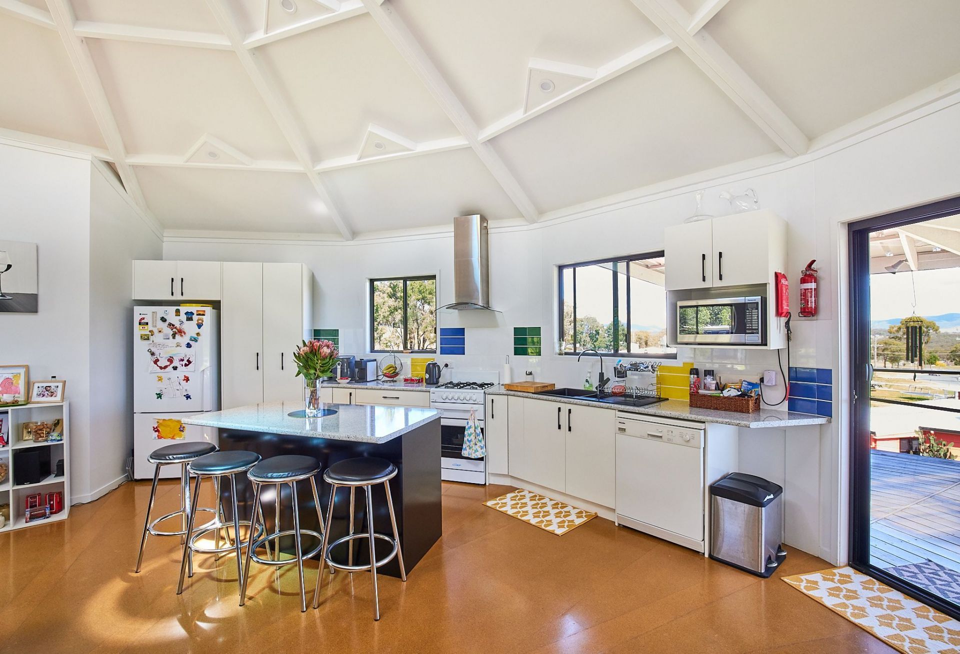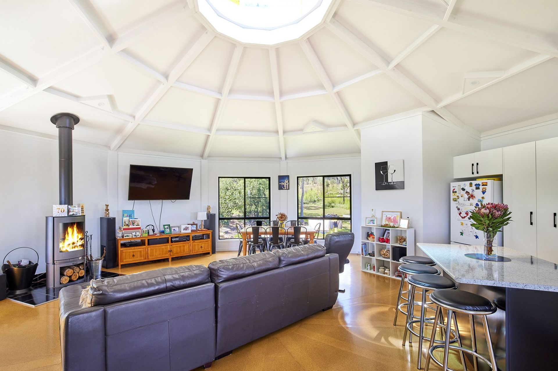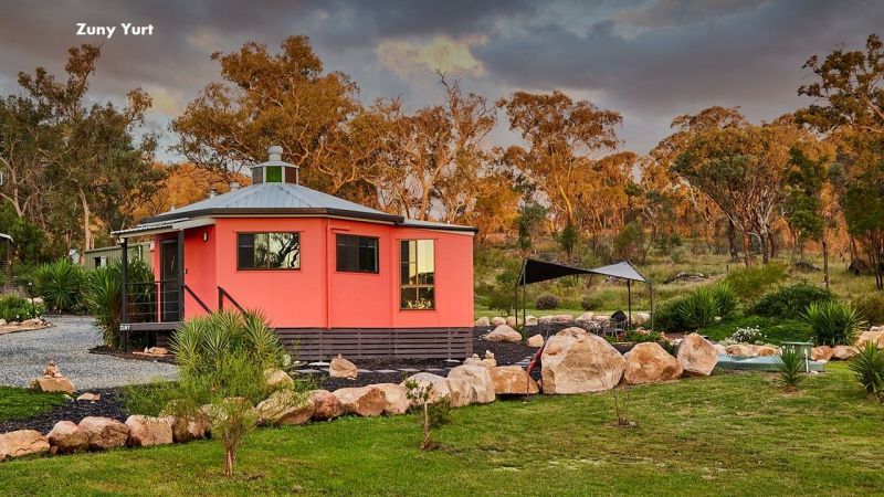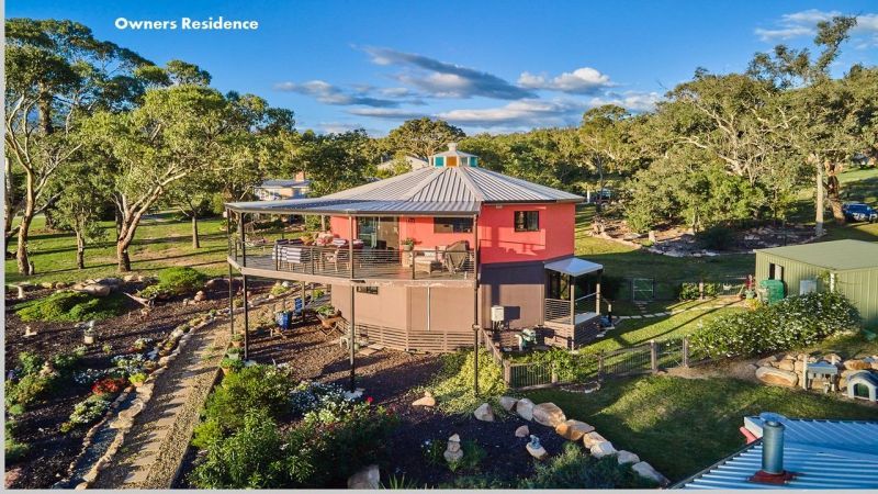 Built by current owner in 2017 and is a double storey 10-sided Yurt with gives spectacular views of a local vineyard and surrounding countryside from the deck on the upper level. The top floor is an open plan lounge room with log fire, kitchen, 2nd toilet and has high ceilings with coloured glass panels. The lower floor has 2 bedrooms, bathroom, toilet, laundry, office (which can be converted to a third bedroom if required) and is fully insulated with thermal glass windows.