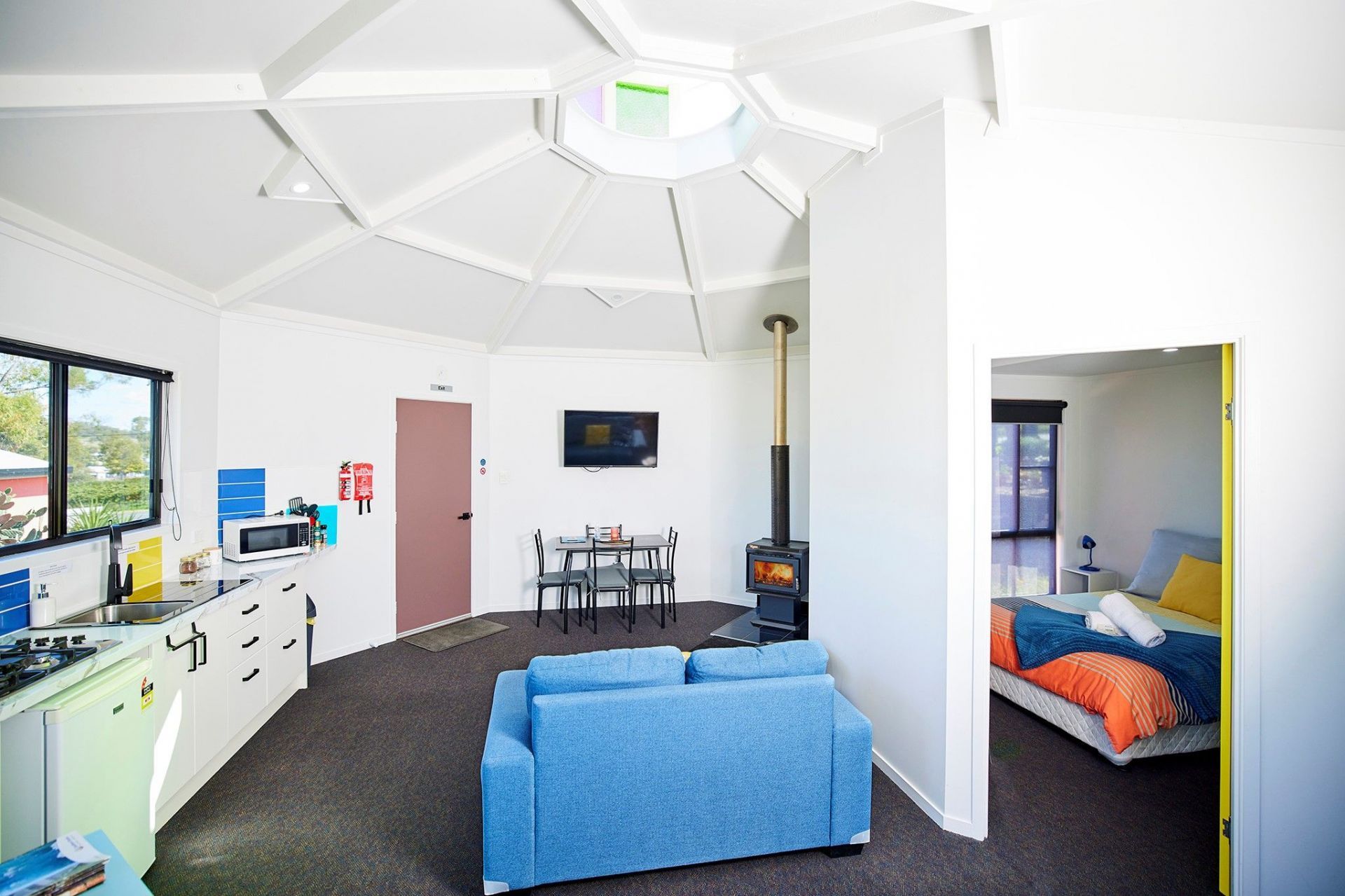 Each sleep 4 people, have a lounge room with log fire, r/c aircon, separate bedroom, bathroom & toilet, open plan lounge area with a kitchenette, high ceilings that have coloured glass panels and are fully insulated with thermal glass windows