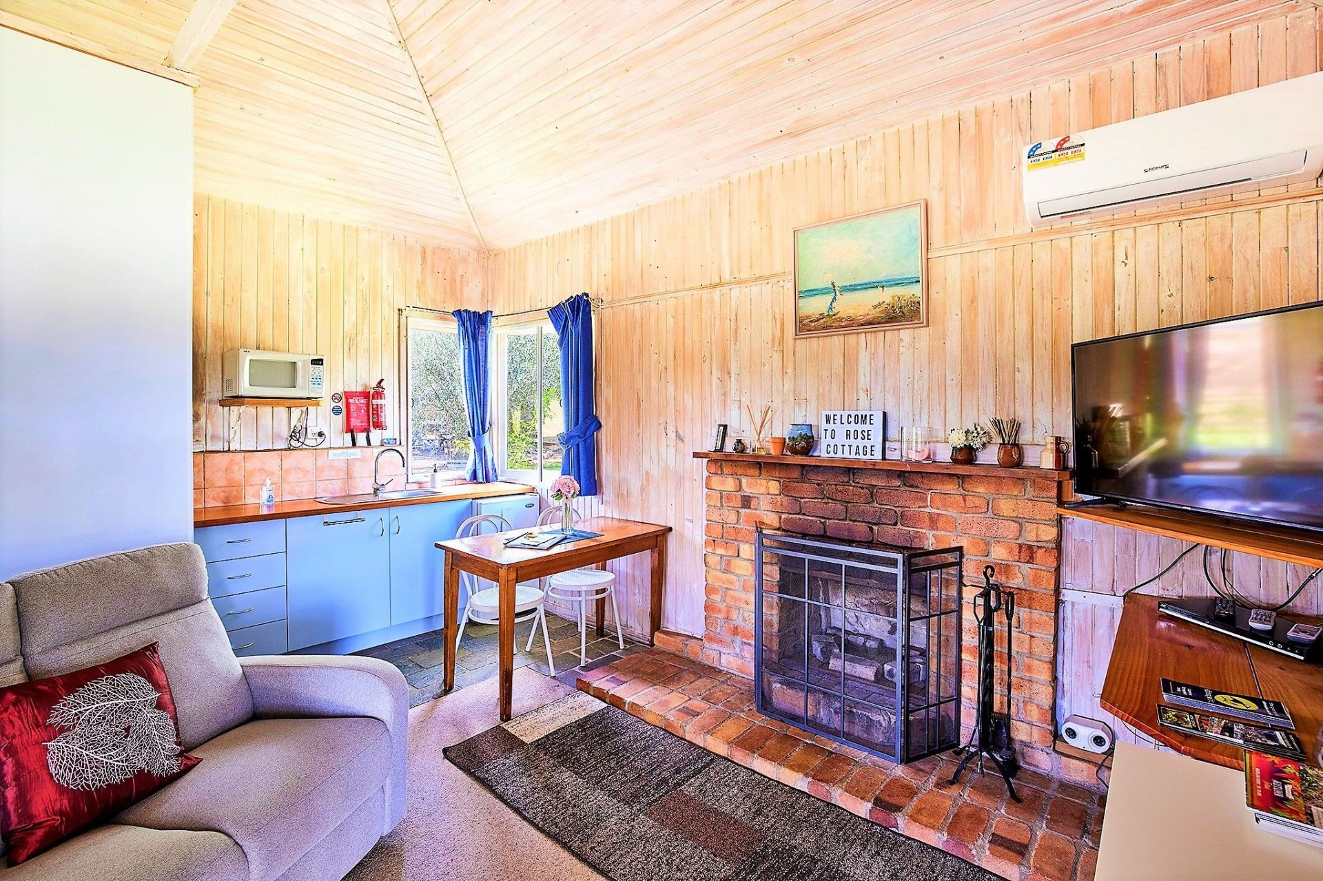 Was originally a workers Cottage and has been fully renovated. Rose Cottage is a studio style which sleeps 2 people, has an open log fire, Queen size bed, separate bathroom, r/c air con, lounge area, kitchenette and a covered front area with a BBQ