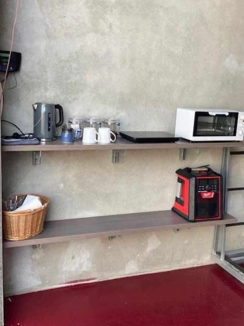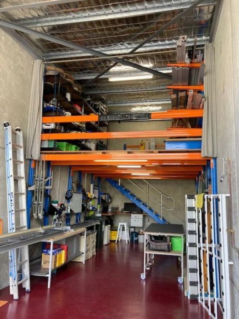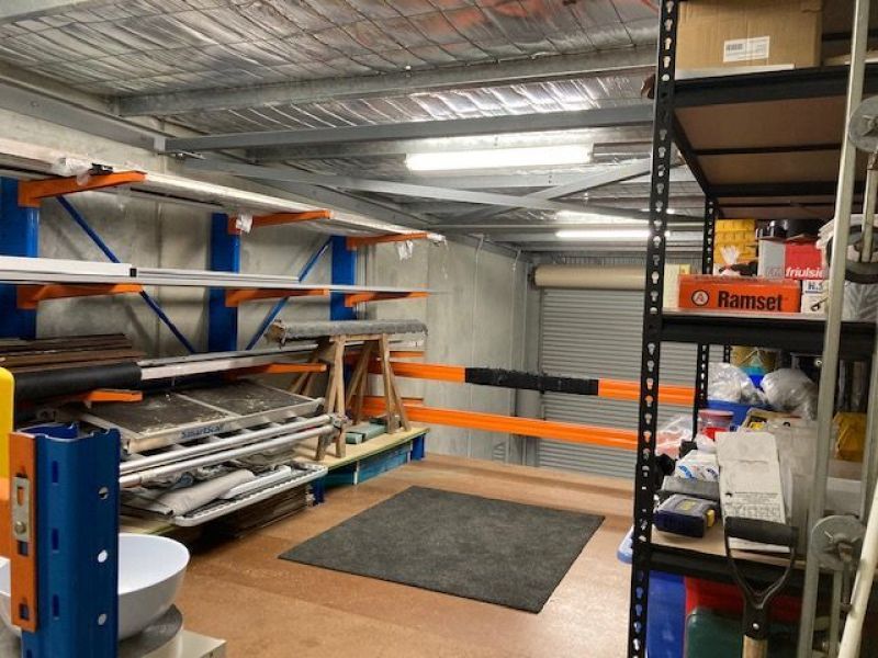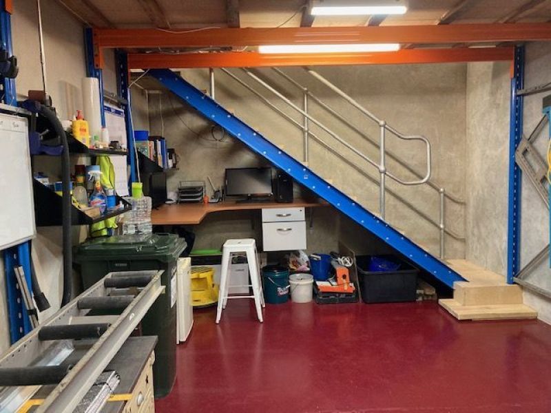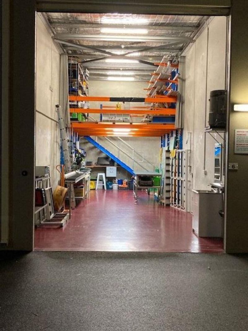 Storage racks configured to mezzanine at present. Can be reconfigured to suit purpose by purchaser.