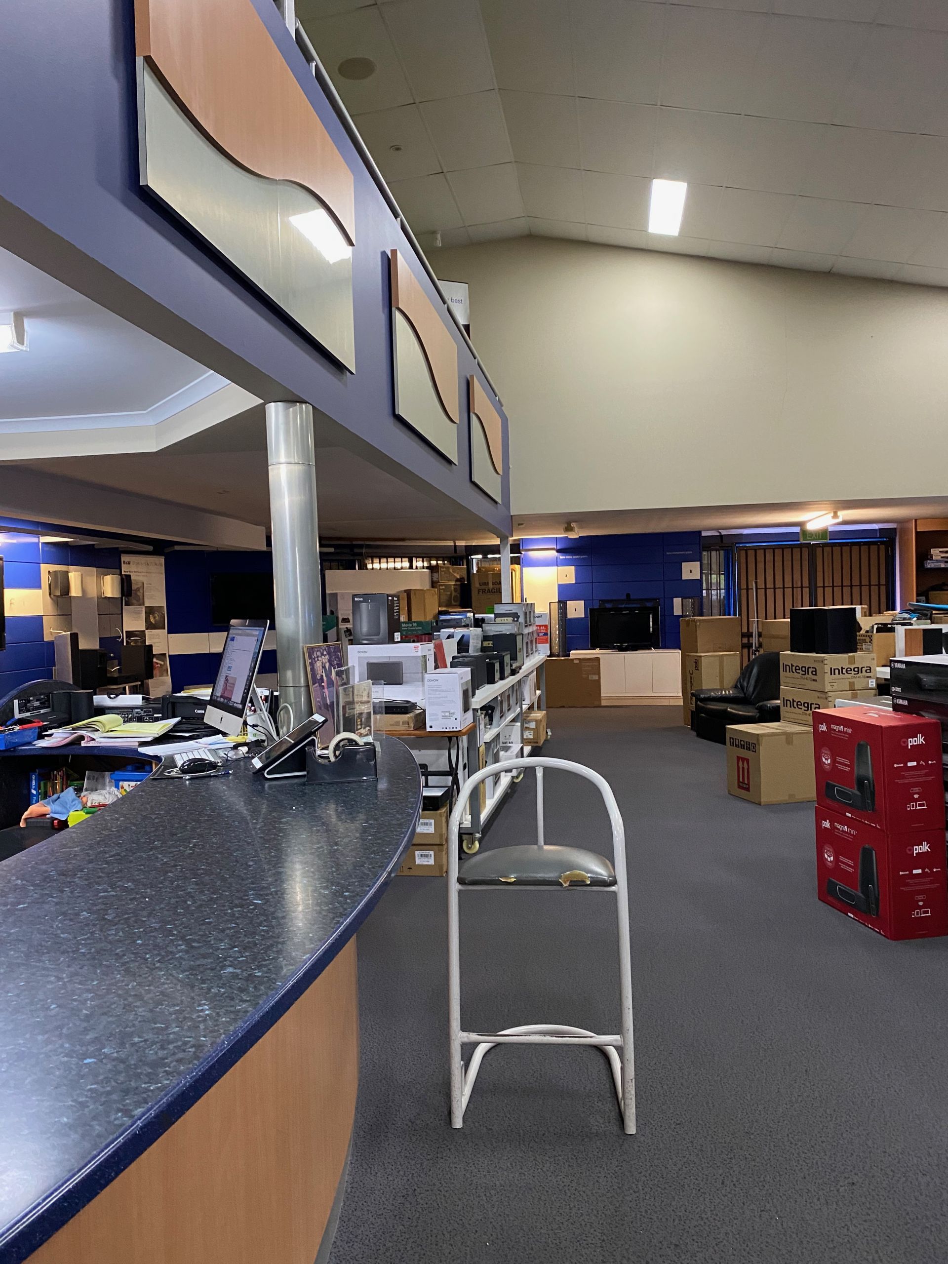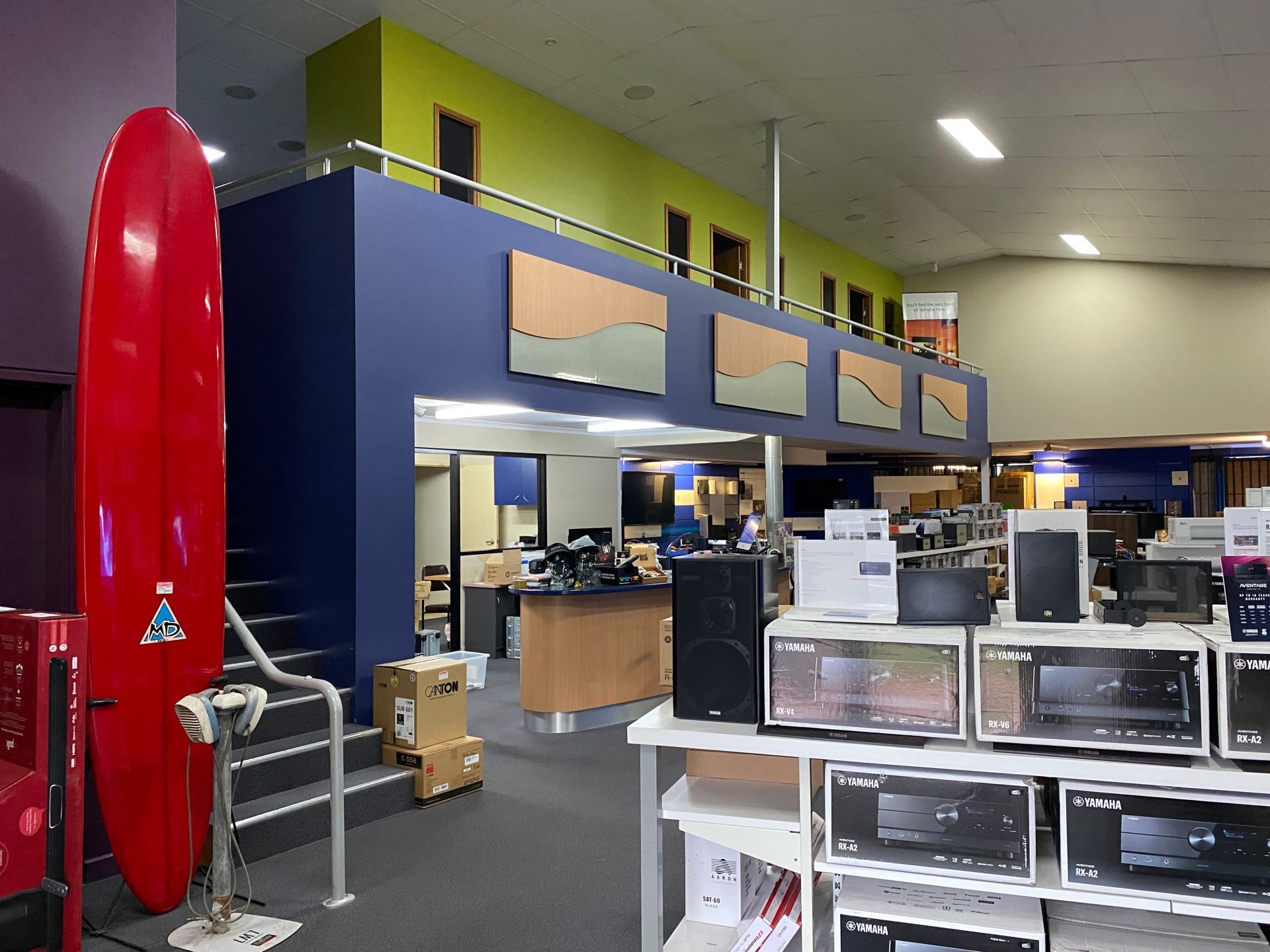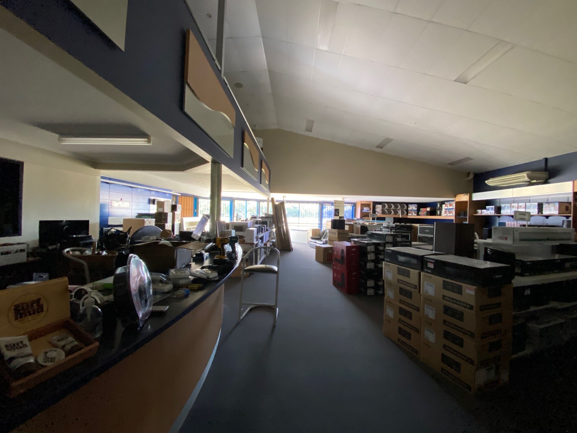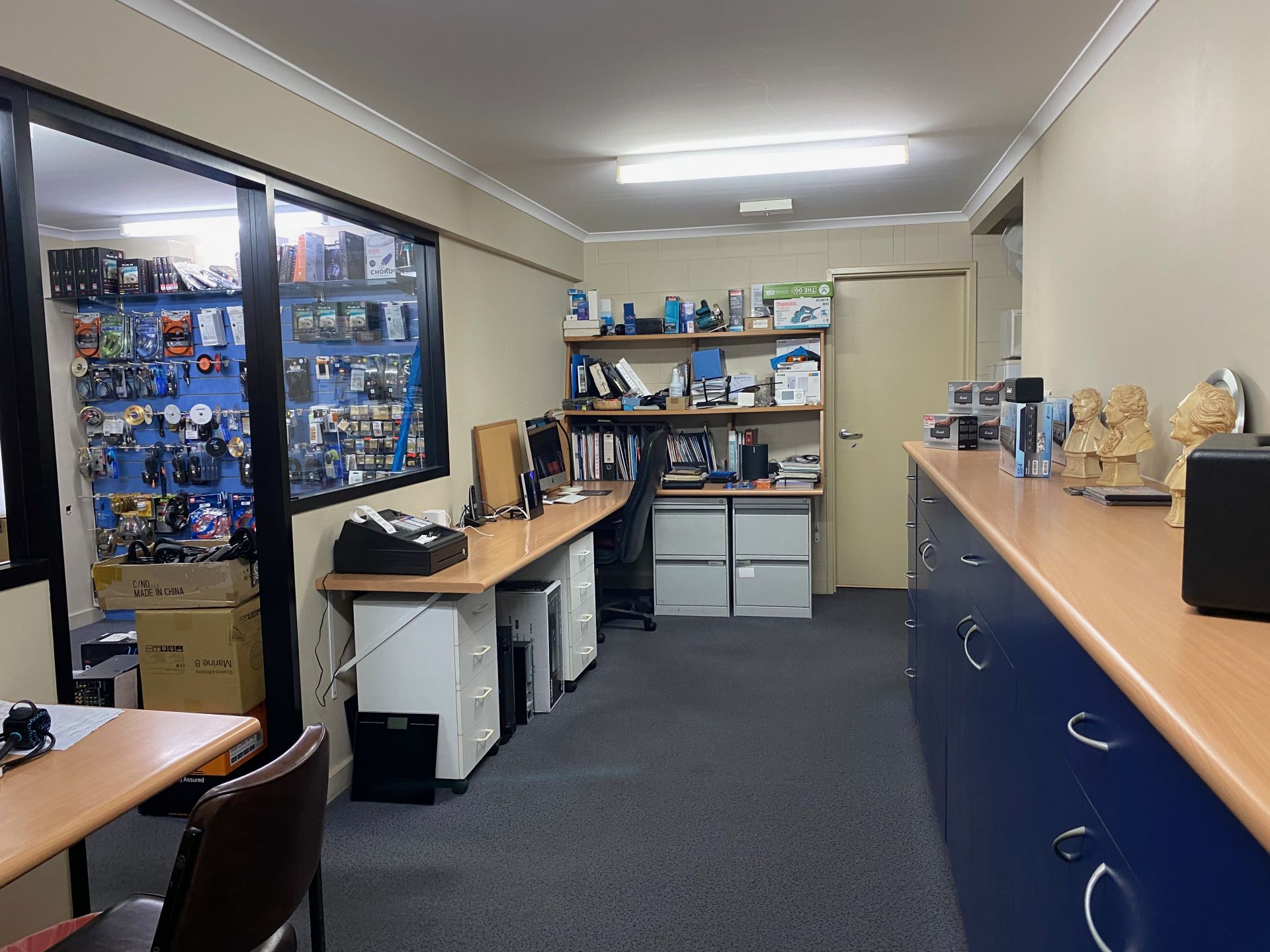It includes a large ground floor showroom, with two adjacent storerooms for easy access. This property also presents three smaller offices and one larger space on the mezzanine floor above the main showroom.