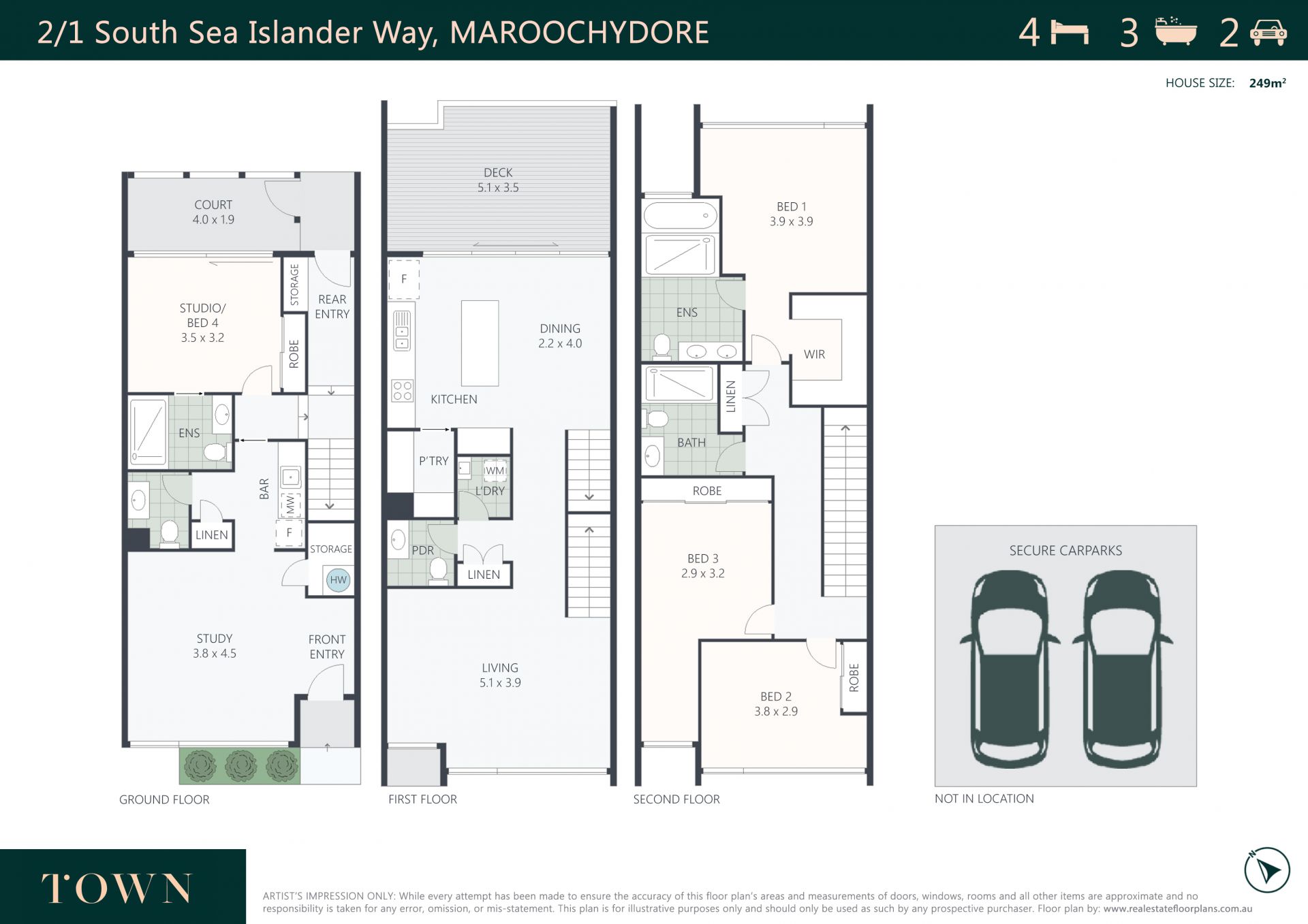 Across three levels with genuine ground floor entry and branding exposure for a home business; it comprises four bedrooms, three fully tiled bathrooms, home office with powder room and kitchenette (ground floor), separate living areas, high-end kitchen, north-east facing private courtyard and upper deck, separate laundry, and secure two side-by-side covered carparks.
