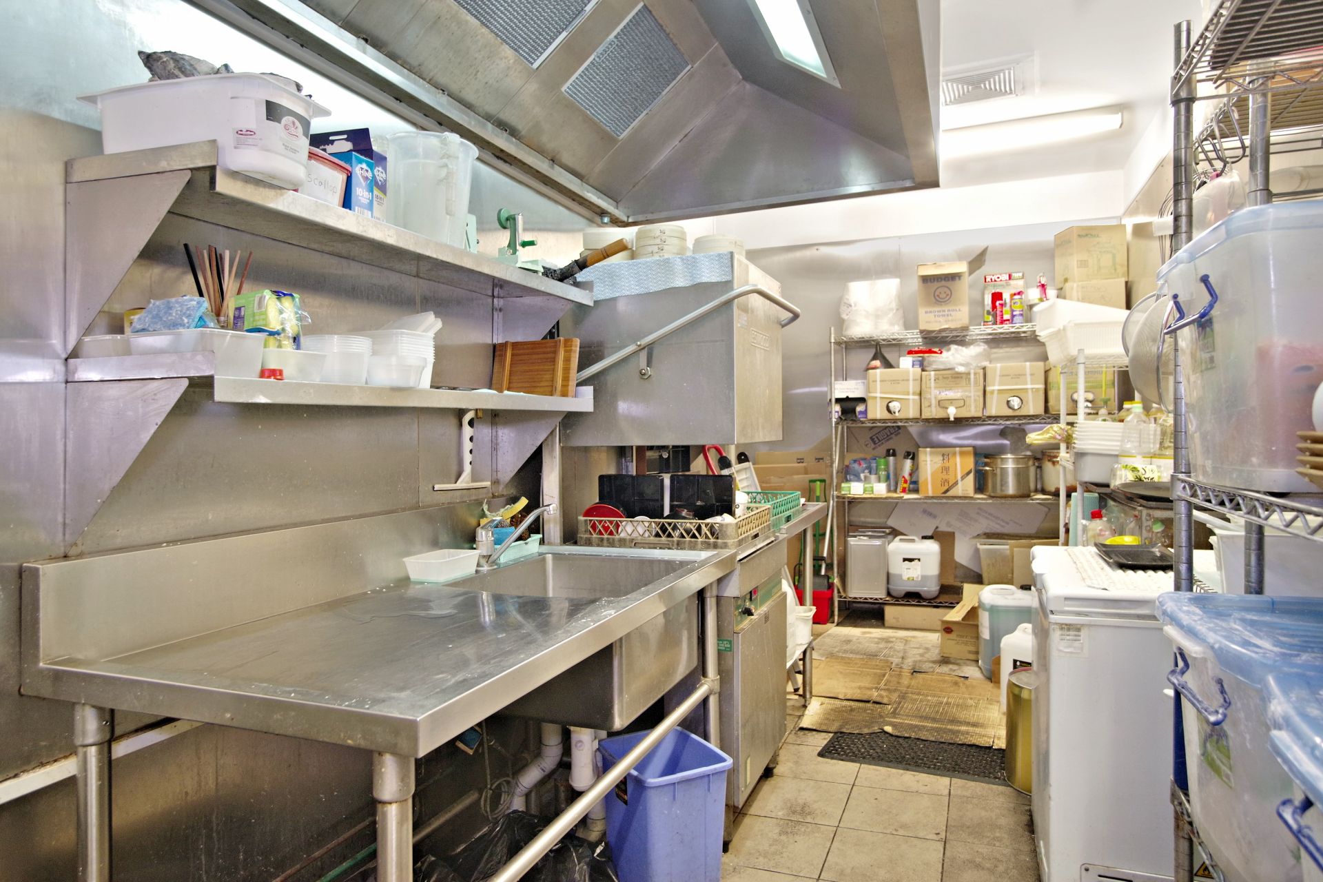 Commercial kitchen with exhaust fan and grease trap