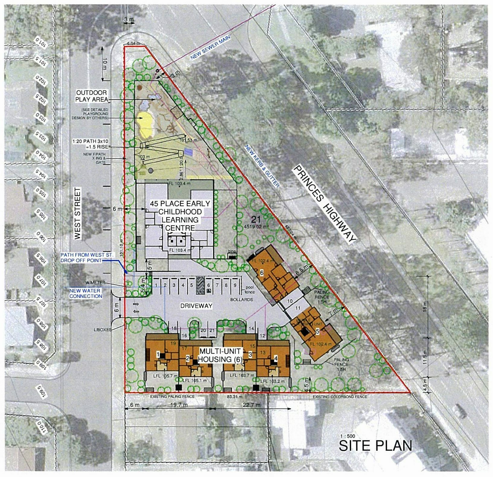 - Fabulous 4519m2 high exposure corner allotment with approved 45 place Early Learning Centre plus 6 x 3 bedroom multi unit dwellings