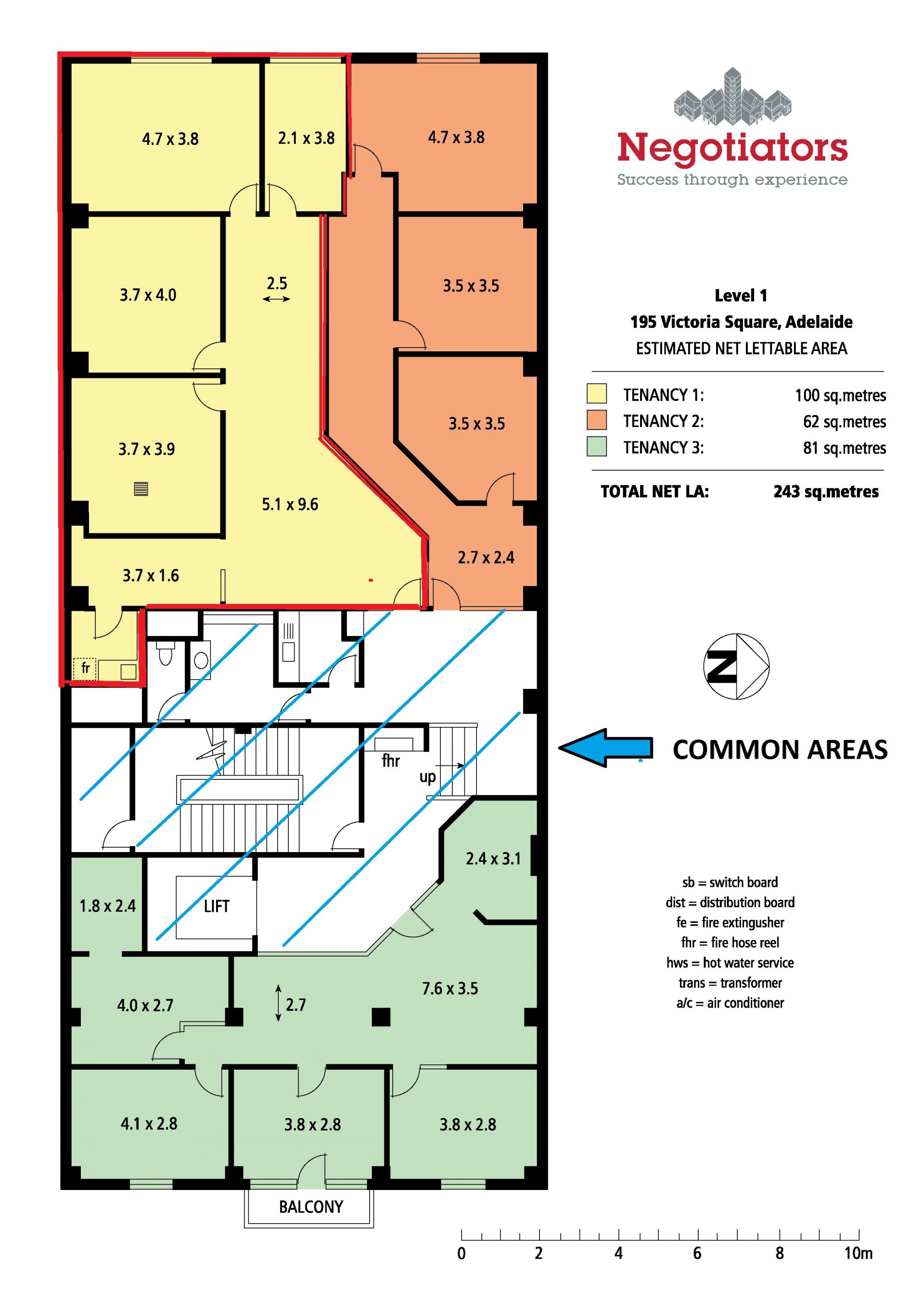 Tenancy 1, part level 1, bordered in red on attached plan. Total area is approx. 100sqm. The premises are air conditioned and as currently configured provide 3 main offices, with balance of the space set aside for open plan and reception.