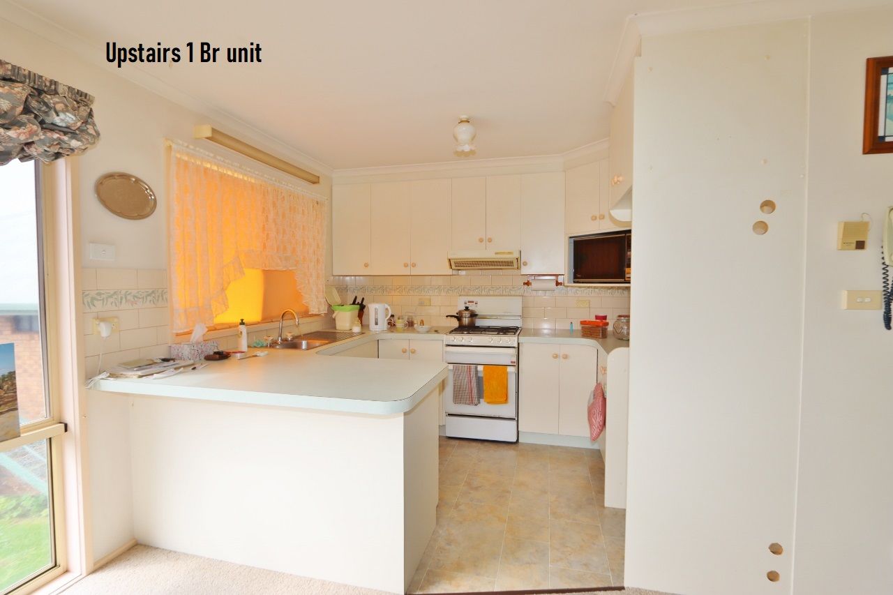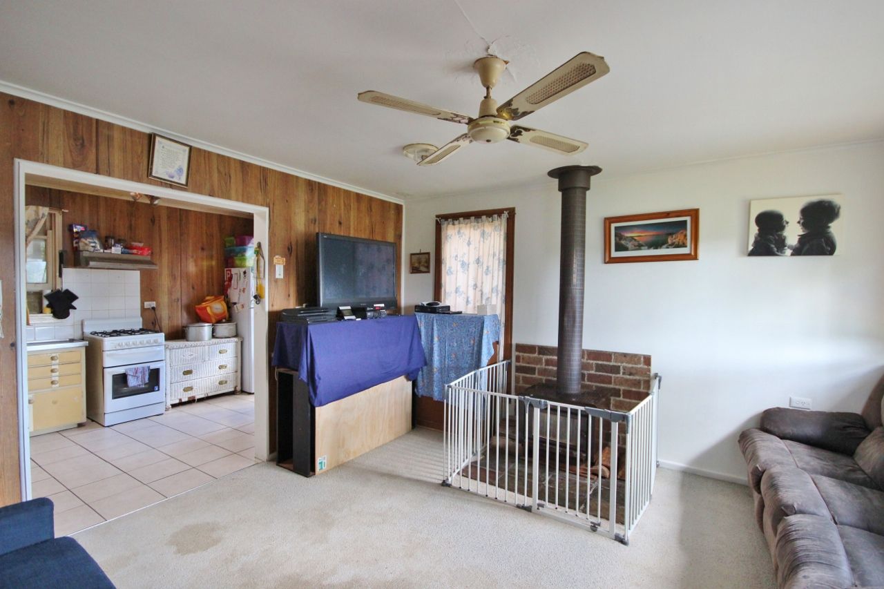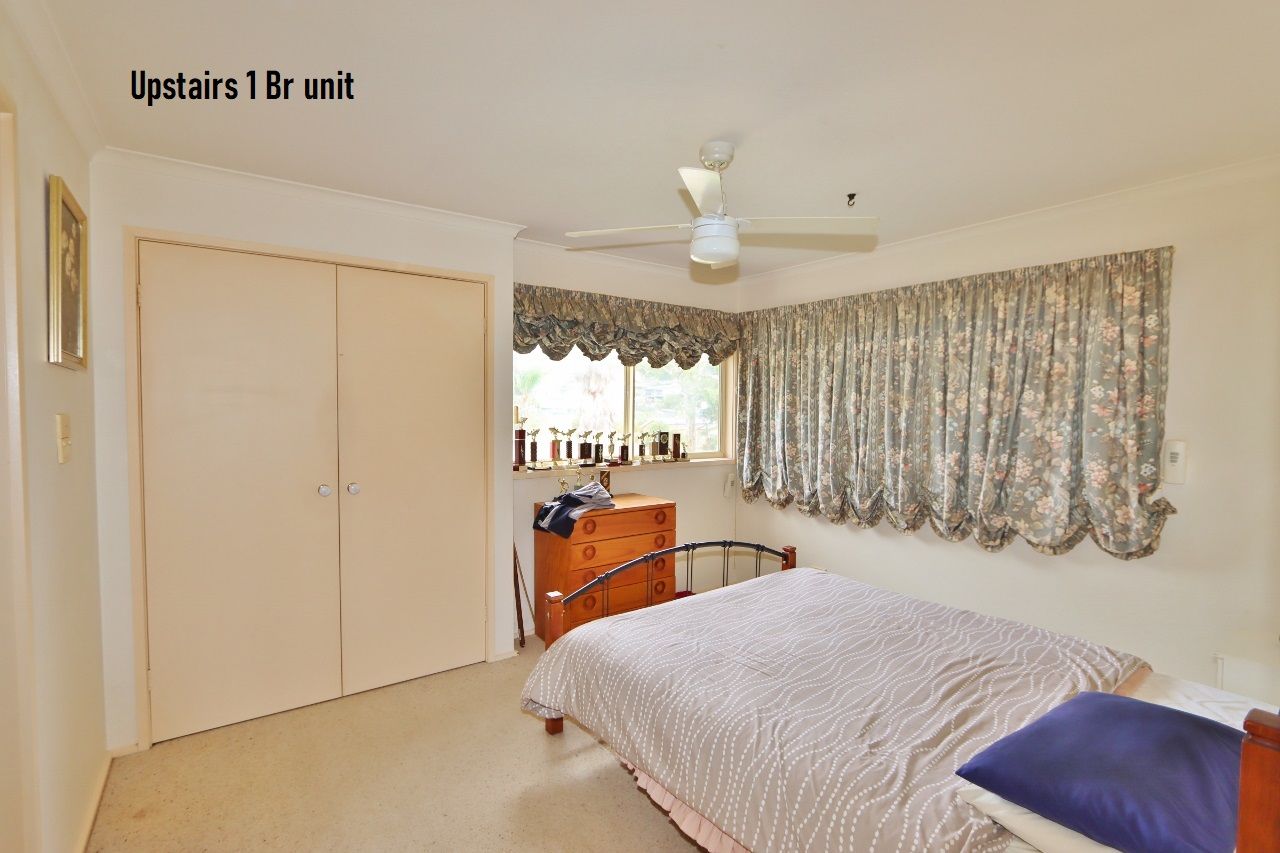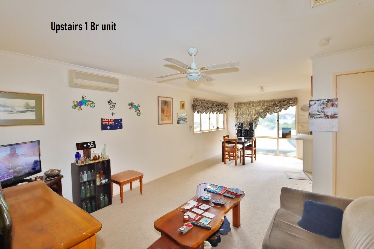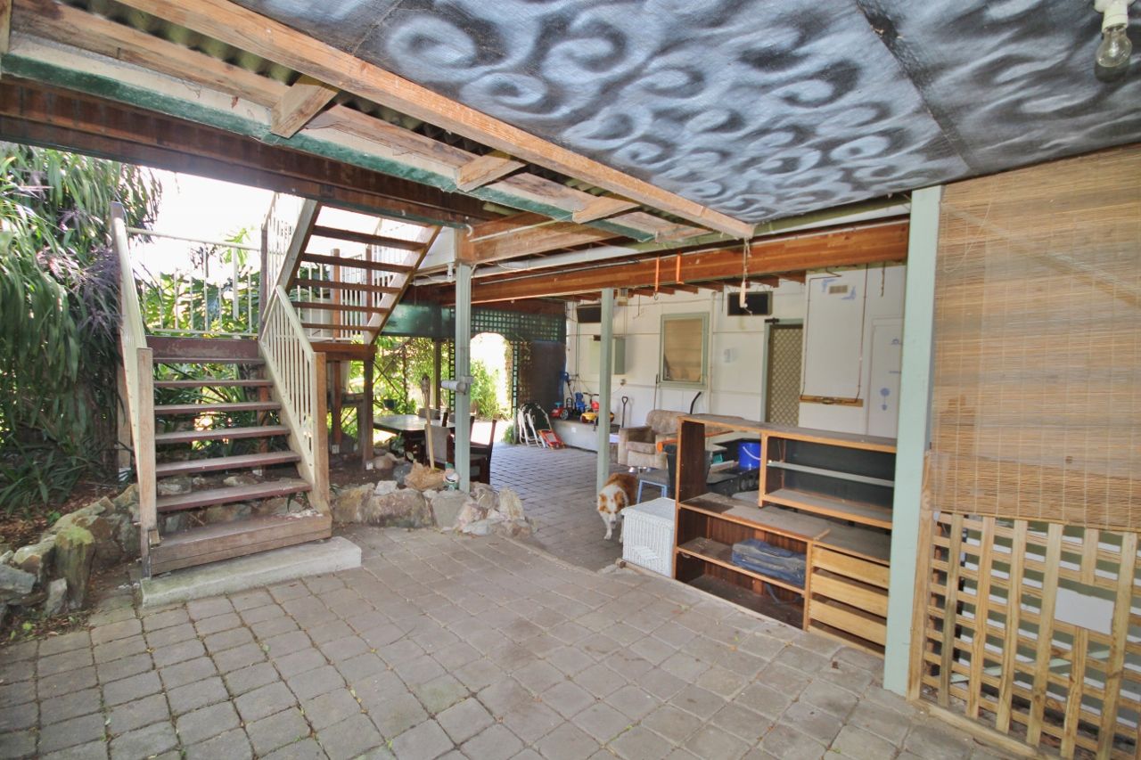 Existing improvements include a 3 bedroom residence with open plan living and combustion heater, study and a large undercover entertaining area at the rear. Upstairs is a large self-contained 1 bedroom unit with spacious living and a huge sun deck. Both are currently rented & returning $500pw. There is a detached colorbond garage/workshop at the rear.
