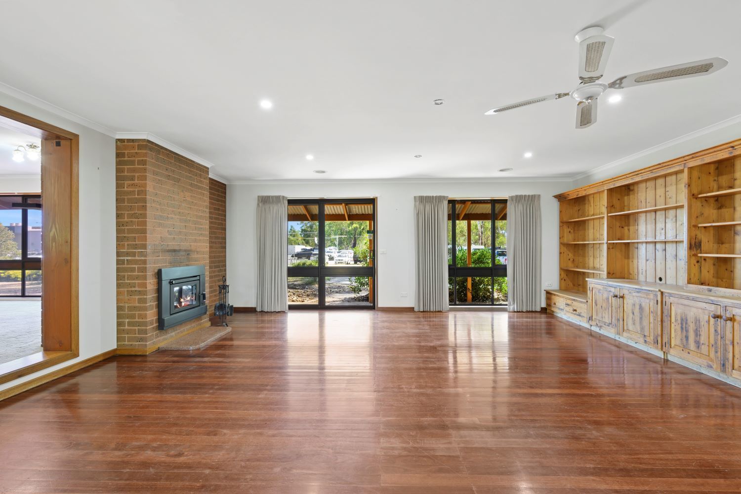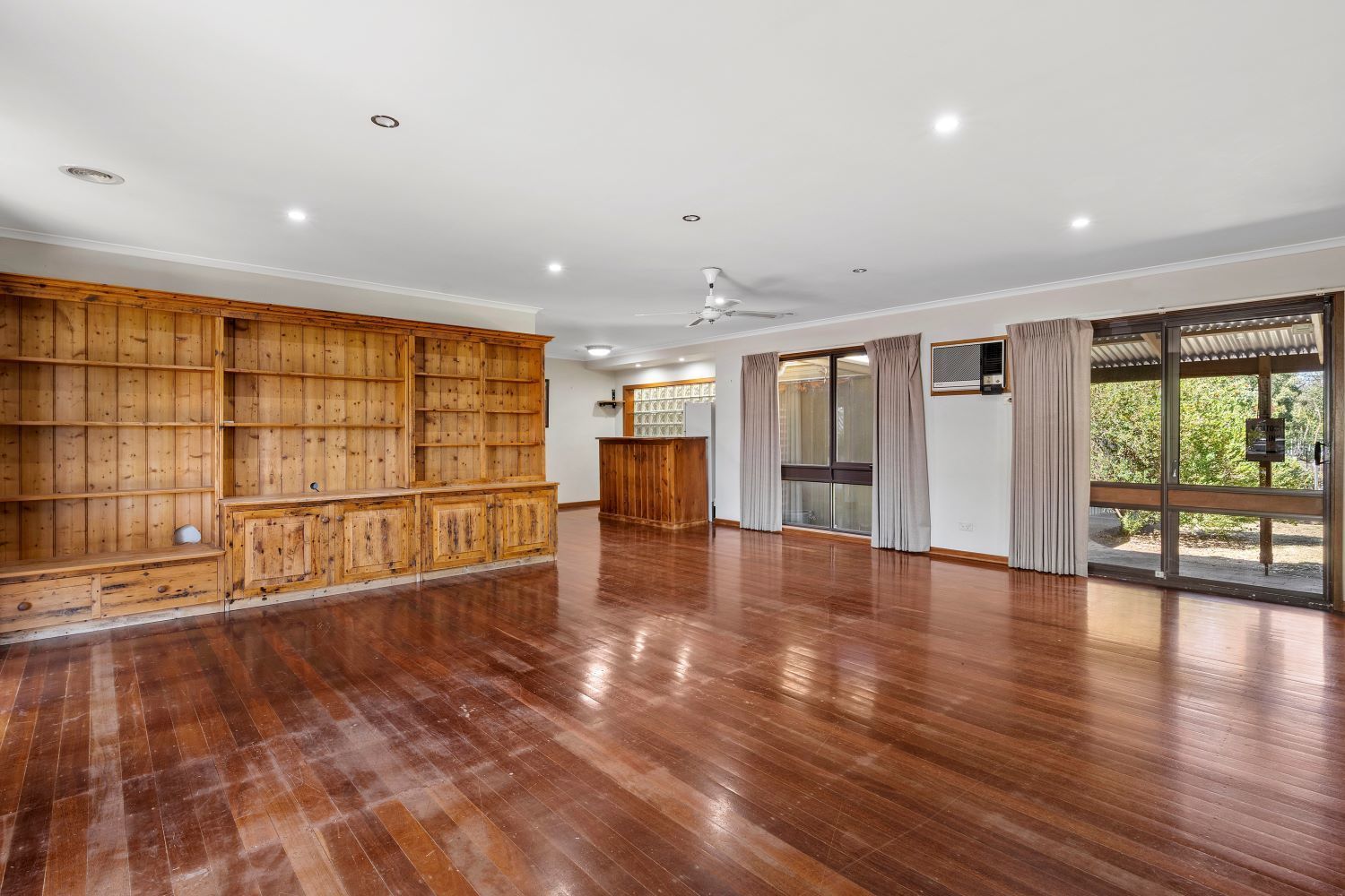 The living/rumpus has a rustic bar, a brick fireplace with a cosy wood heater insert, and a wall-mounted air conditioning unit with a split system unit in the adjacent kitchen/dining area.