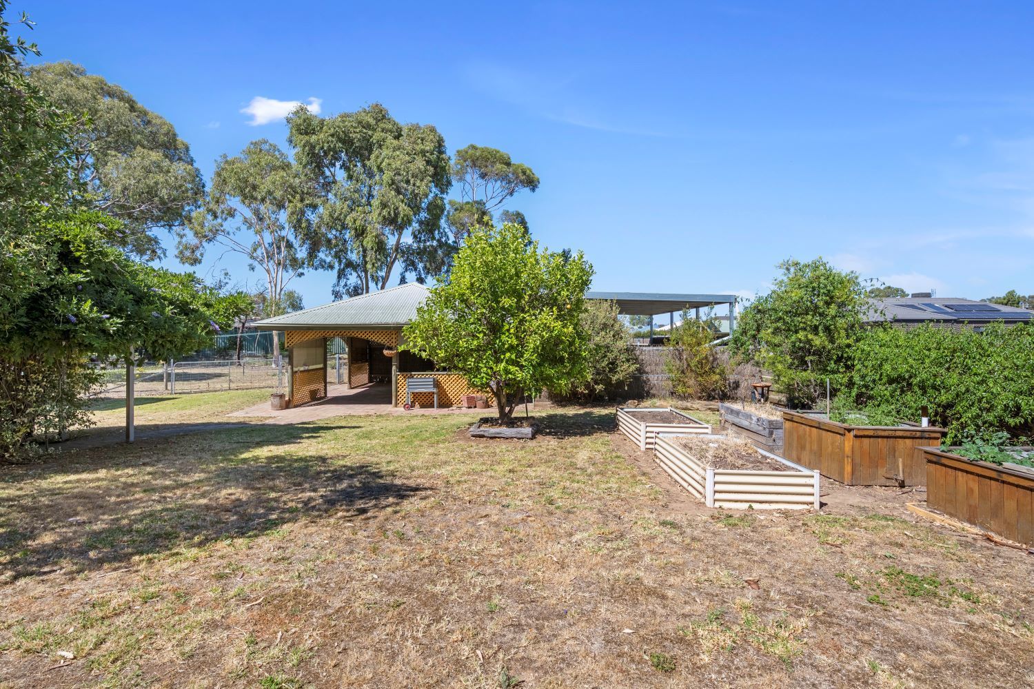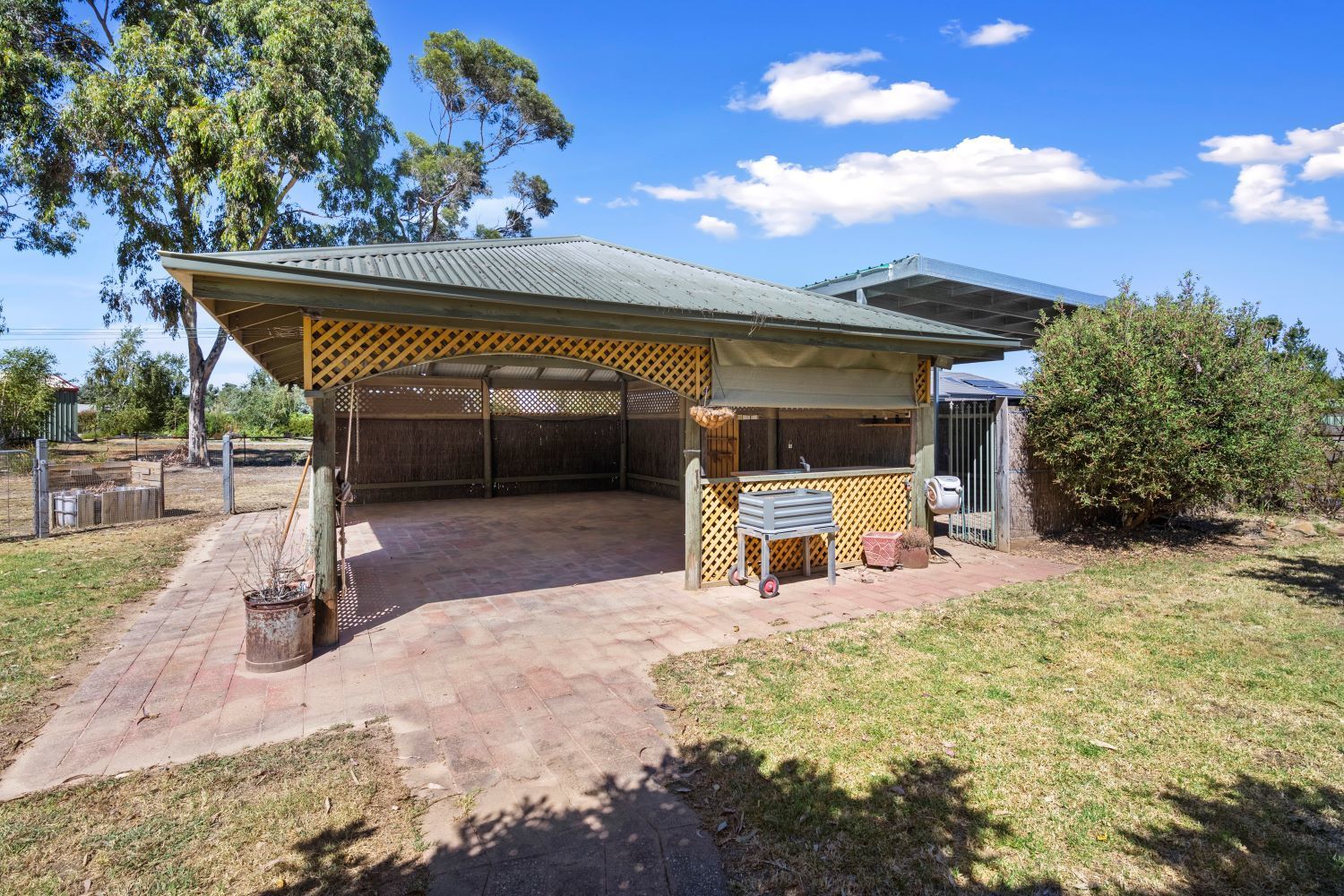 Or, take your guests outside, through the wisteria-draped arbour, to the freestanding alfresco pavilion with sink and benches ready for family celebrations.